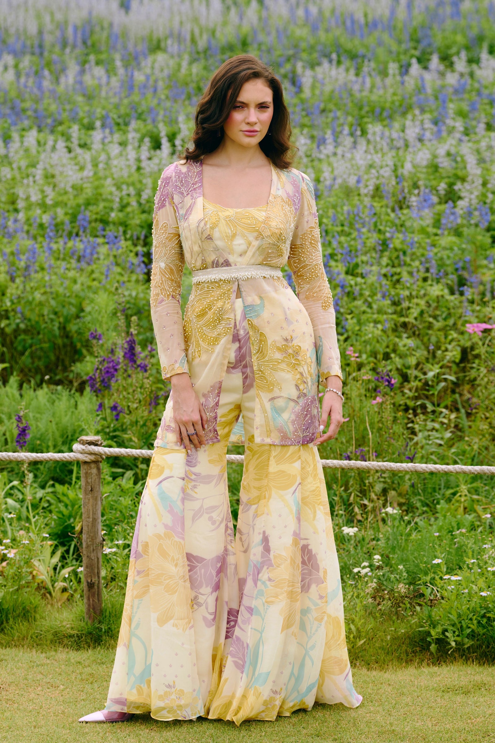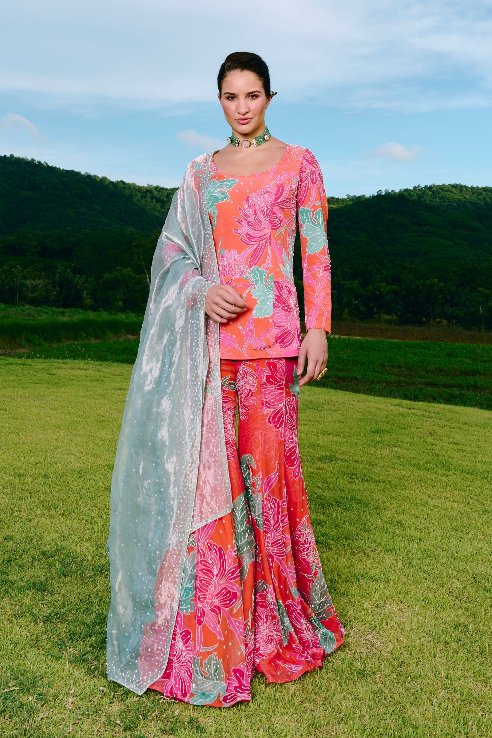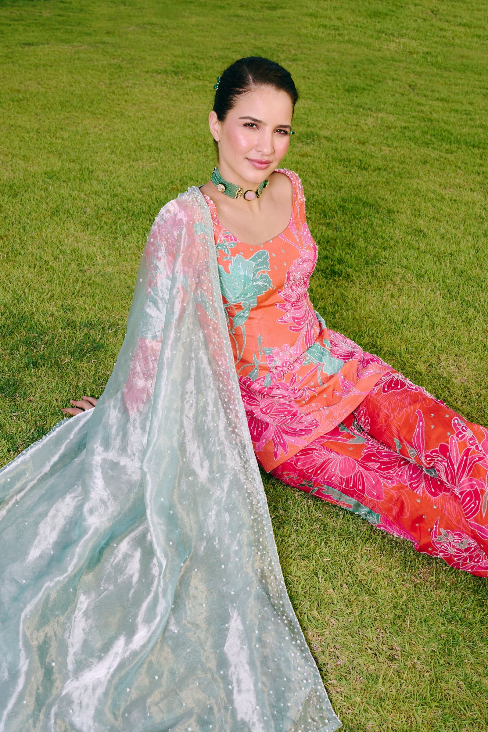 • Fabric: Organza (Saree and Cape), Silk (Blouse)