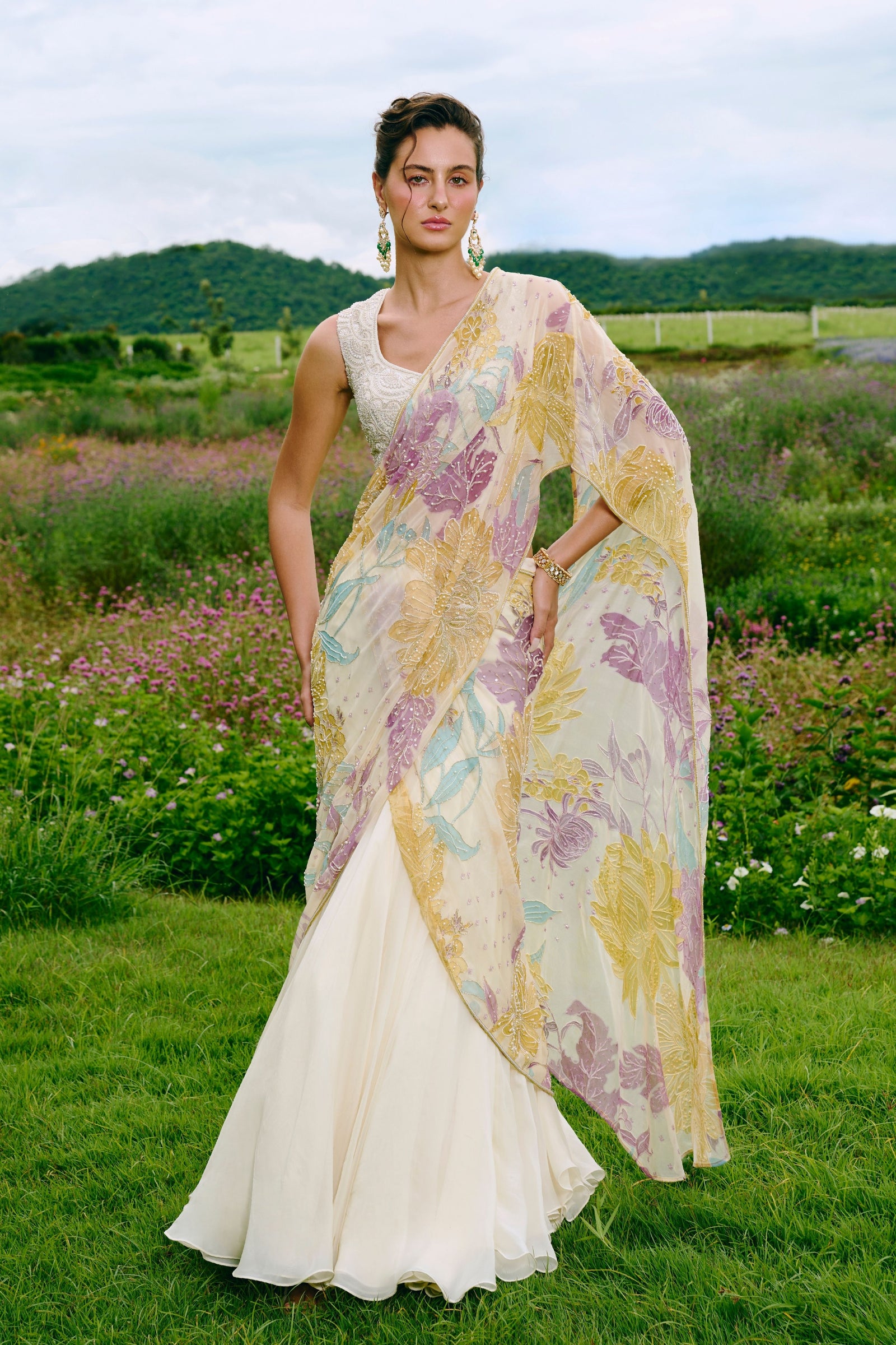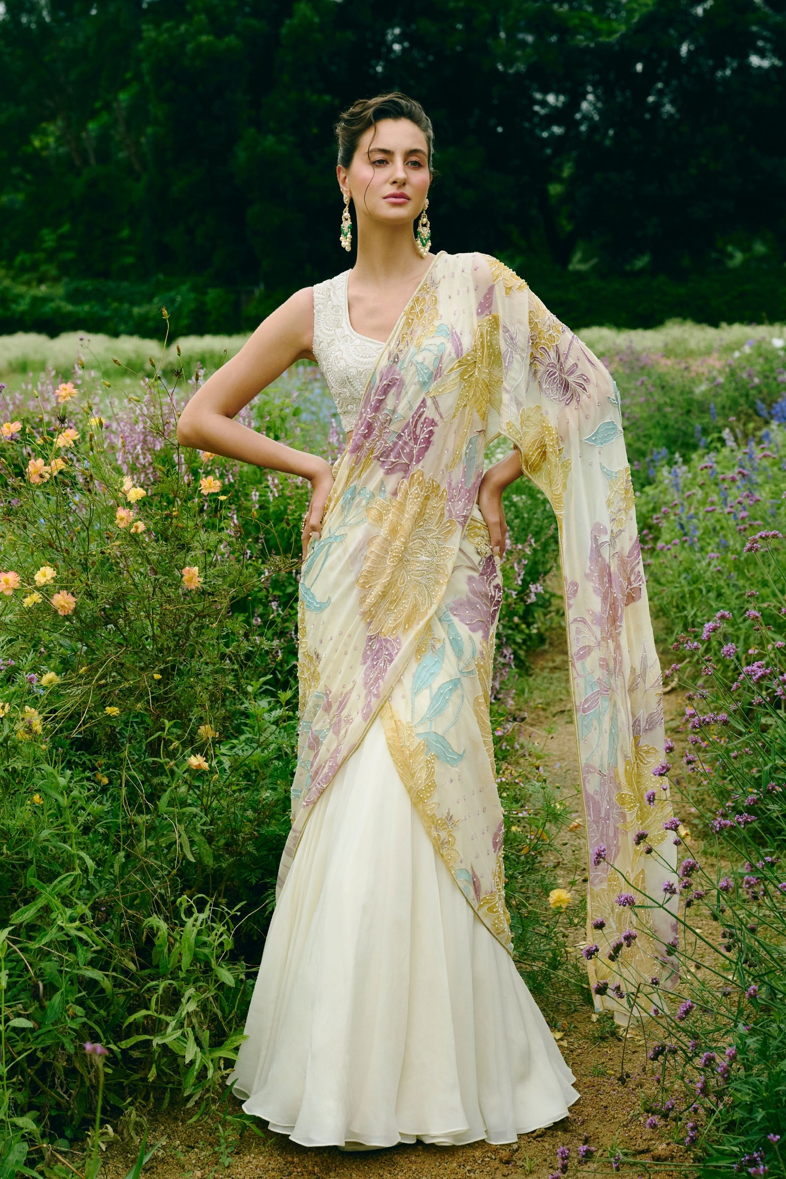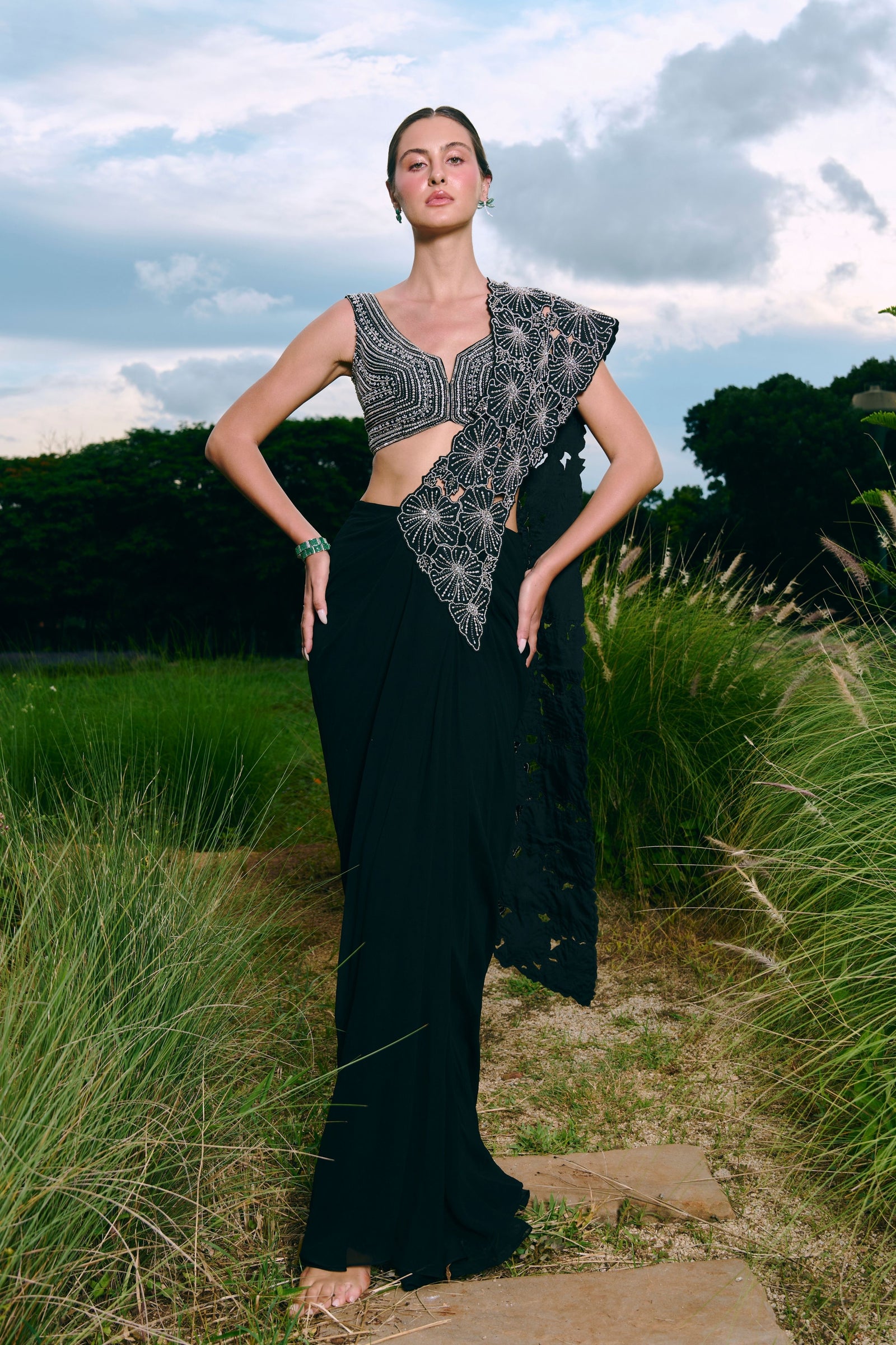 • Gap Circle Embroidered Flap Saree And Blouse Paired With Gap Circle Embroidered Cape