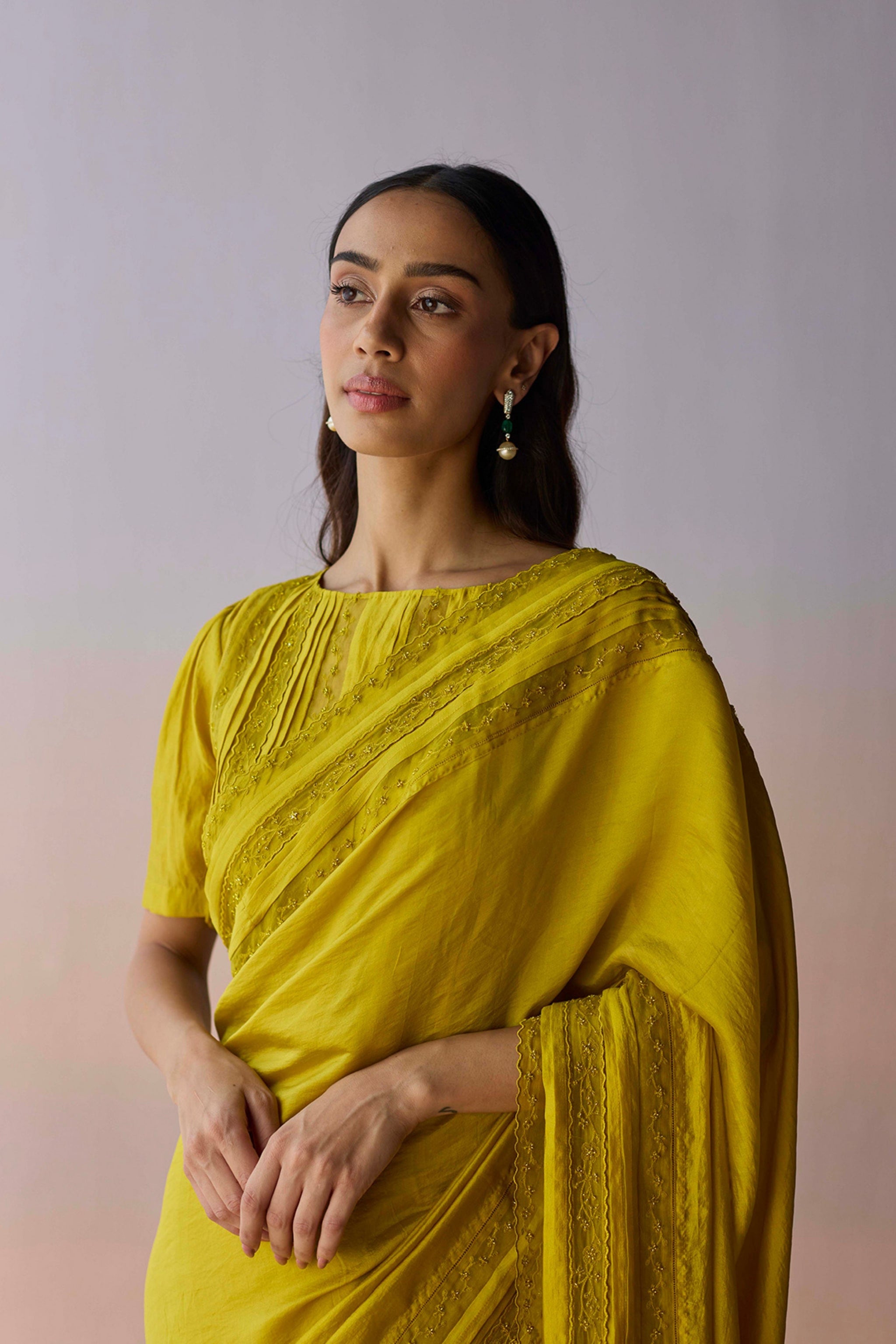 • The whispering ivy embroidered saree glows in a luminous yellow — a hue that carries the warmth of sunlit afternoons, like ivy unfurling against walls kissed by quiet light. Handwoven in organza mulberry silk, the saree carries delicate embroidery along its borders, meticulously rendered and refined. Each embroidered detail is softly highlighted with beads, adding a gentle shimmer that deepens its timeless charm. Pair it with the whispering ivy embroidered yellow blouse to complete the look. The model is 5’7″ tall.