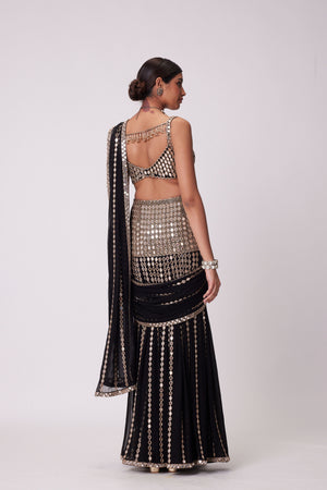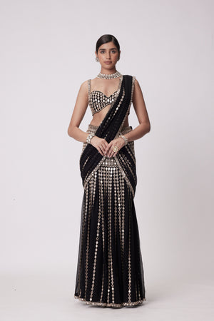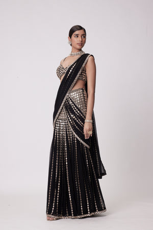 • Black georgette pre draped hand embroidered saree with real hand cut mirror embroidered sleeveless blouse.
