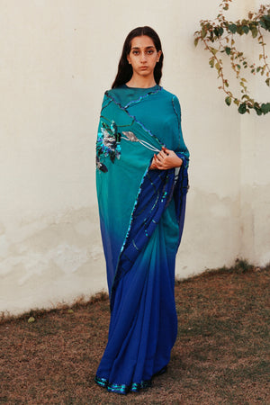 • Crafted with the hues, this saree accommodates more than 20 tints of blue, green, and silver. Embellished with a dramatic lotus the design is enlivened with 3d design techniques. Comes with a running blouse.