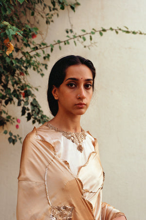 • This saree made in purest mulberry silk satin is an extension of the necklace. The neckline of its blouse is intricately embroidered with the faint memory of the design of my inheritance. Comes with a running blouse.
