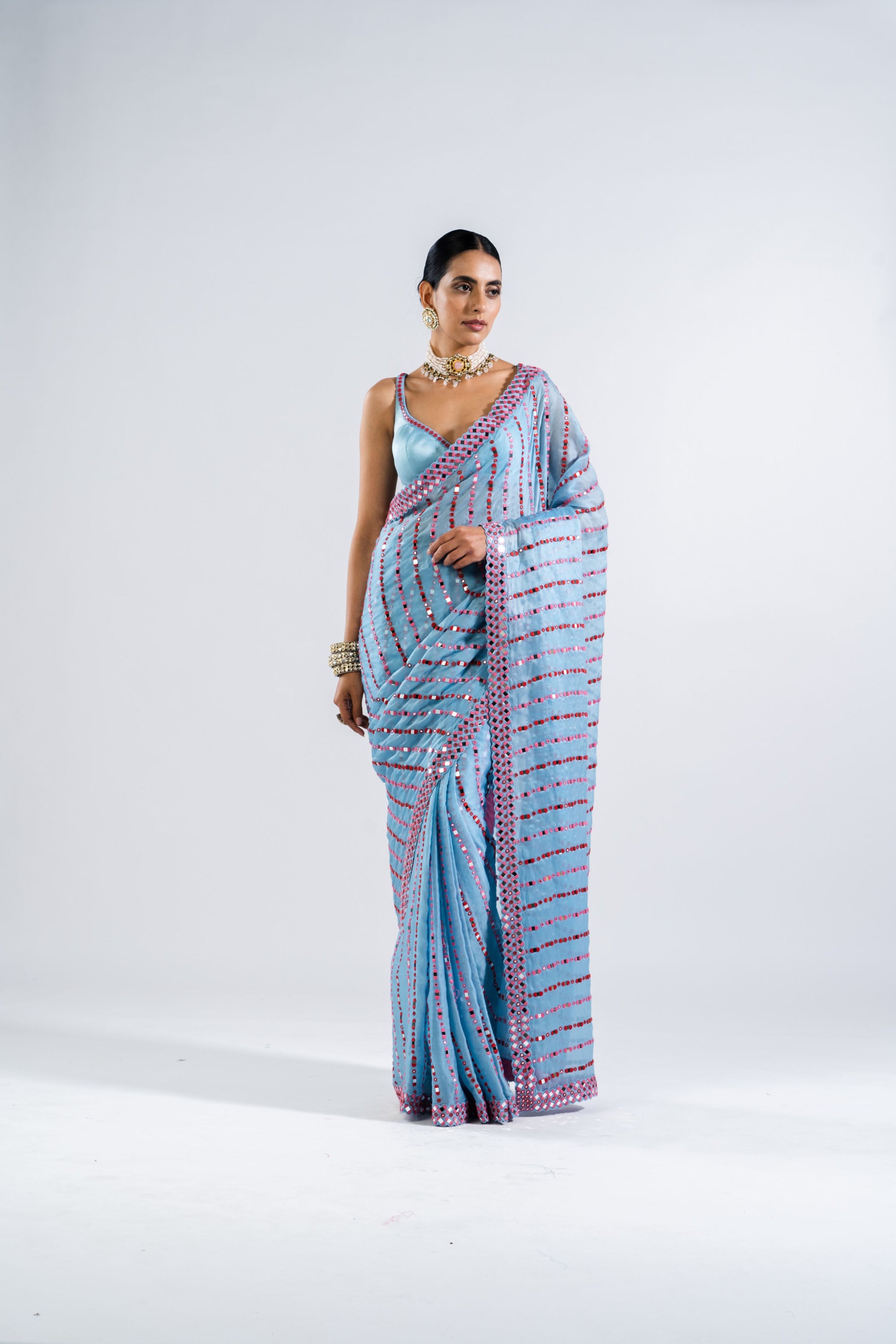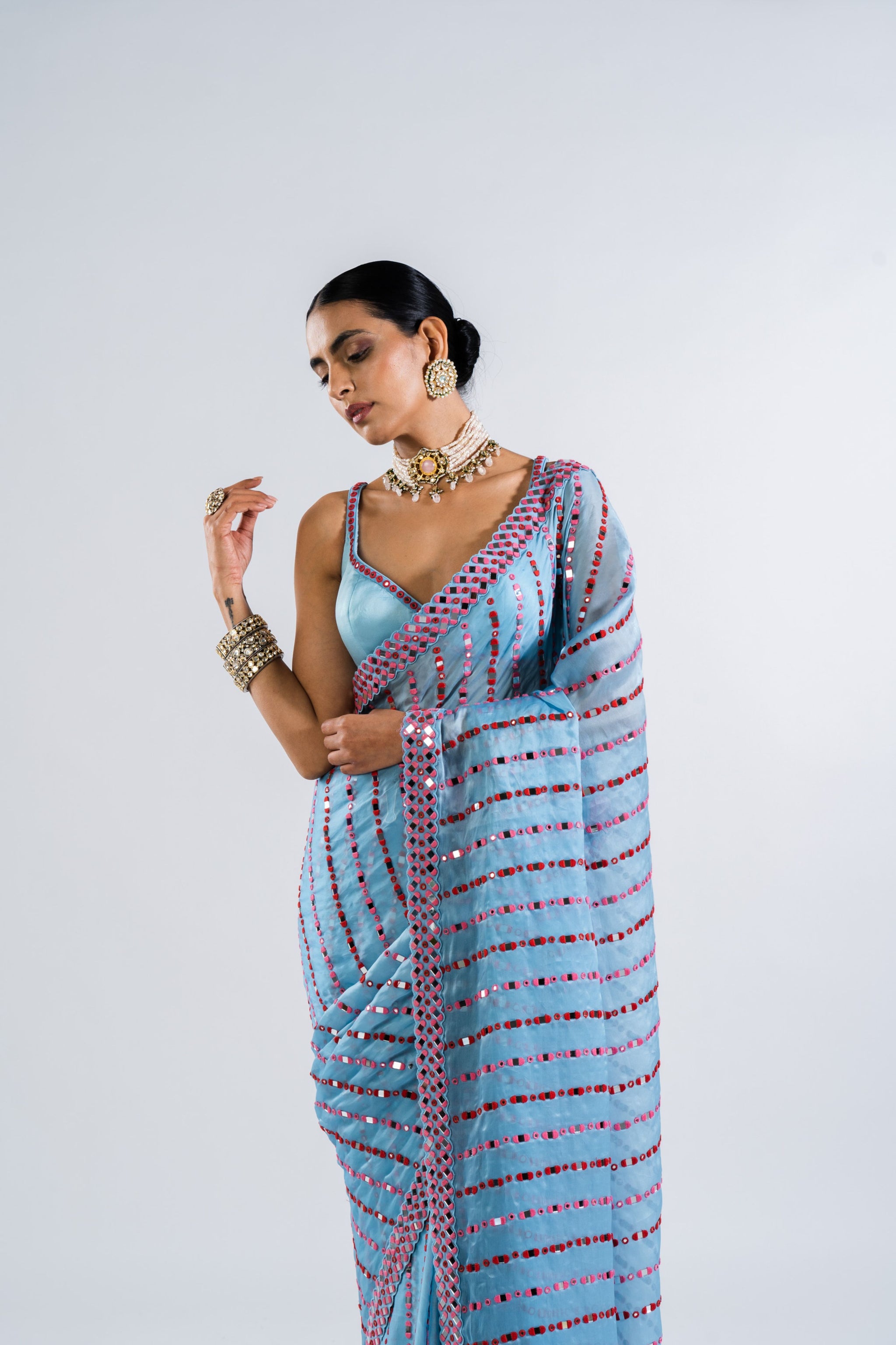 • Pre-draped heavily embellished real hand cut mirror work saree with plain satin blouse