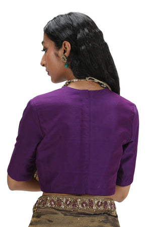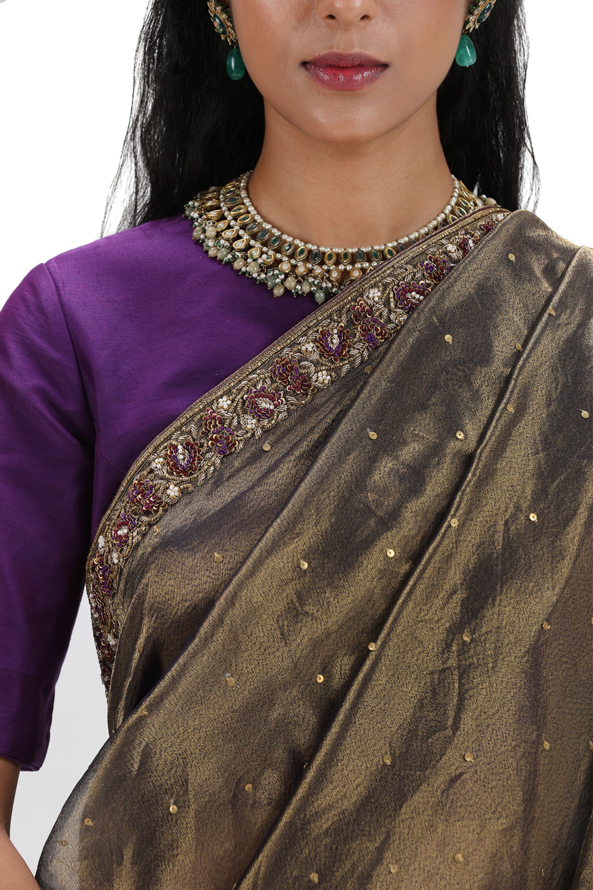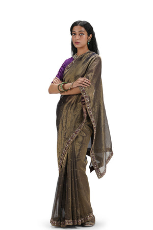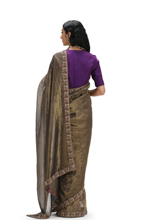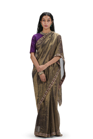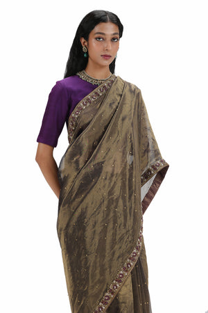 • Featuring a grey organza silk saree with woven texture, adorned with embroidery and printed designs. It comes with a purple blouse stitched from munga silk.