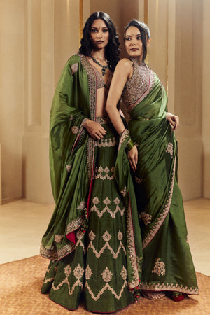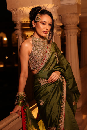 • A perfect blend of heritage and contemporary allure, our green saree is a festive favourite. The intricate marodi work on the border and blouse is a celebration of ancient artistry. Perfect for any festive occasion!