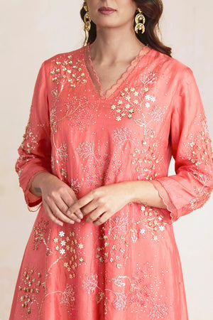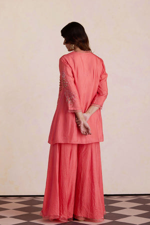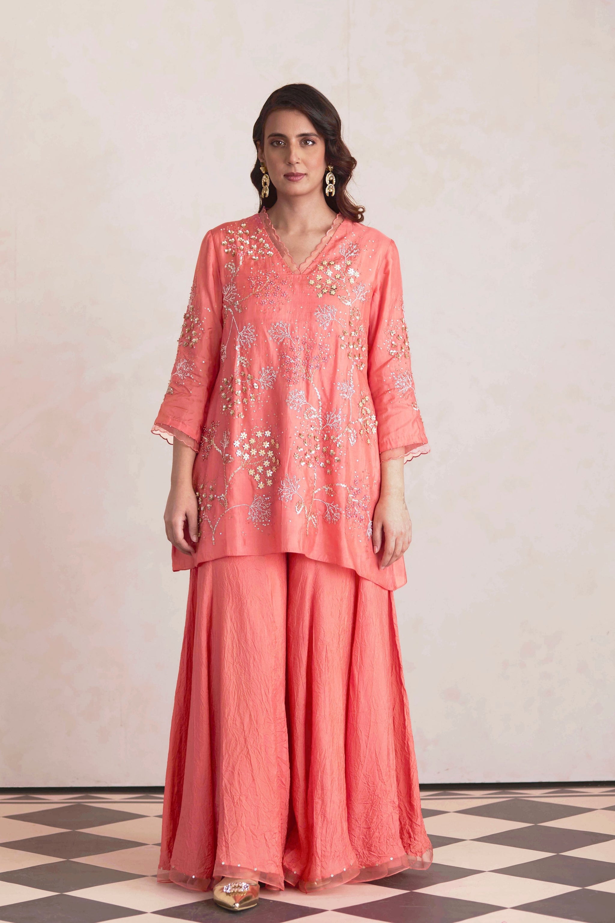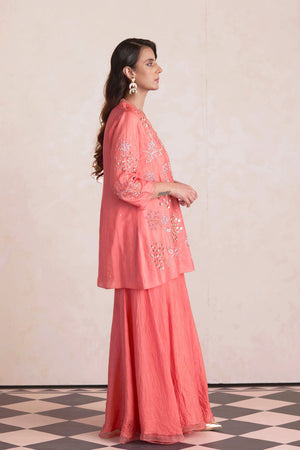 • Featuring a coral sharara set in viscose silk base with intricate floral hand embroidery.