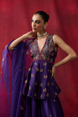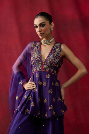 • Purple silk chanderi peplum set with thread and hand embroidery. Paired with a silk chanderi embroidered sharara and comes with a silk organza thread and hand-embroidered dupatta.