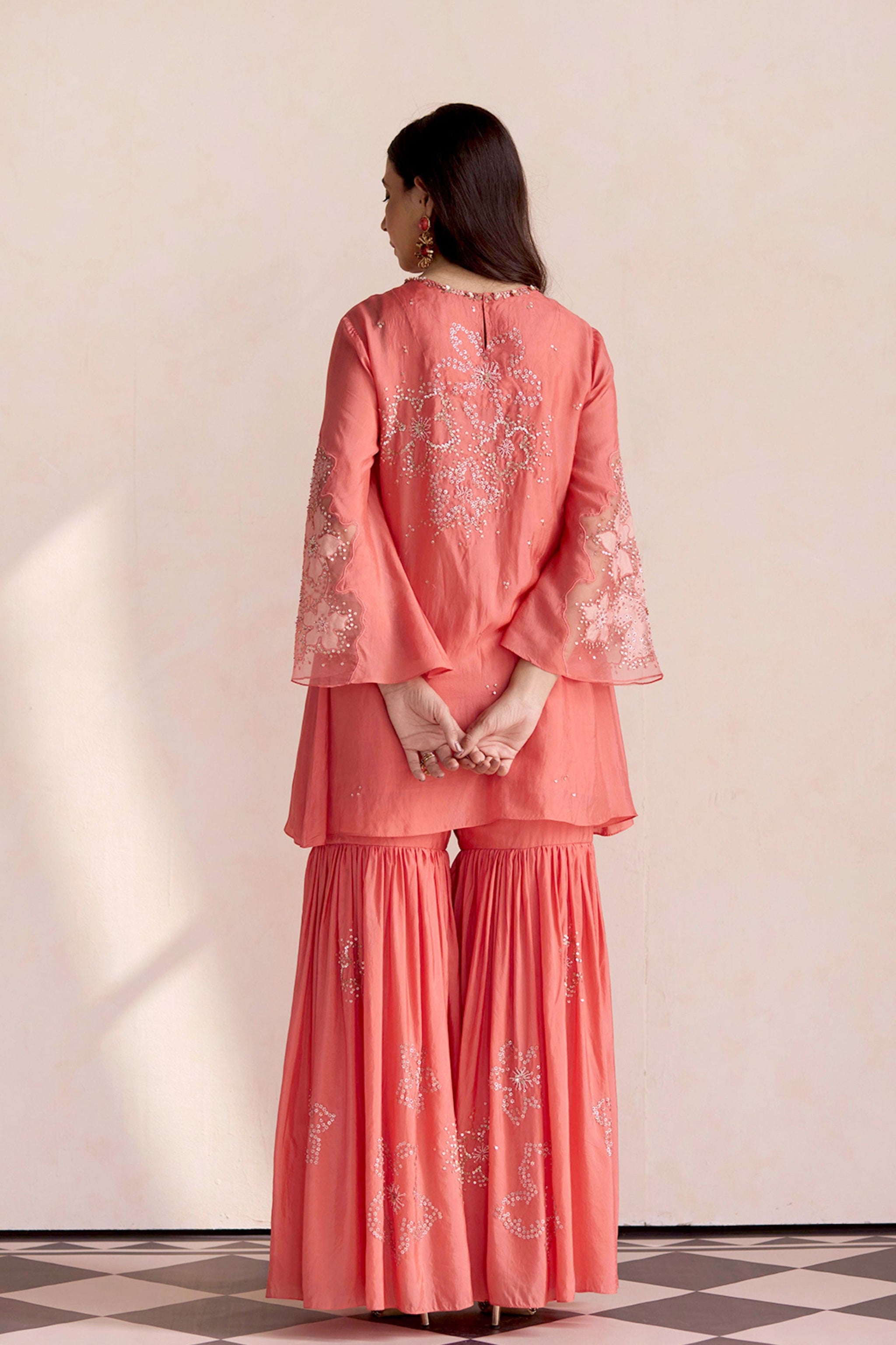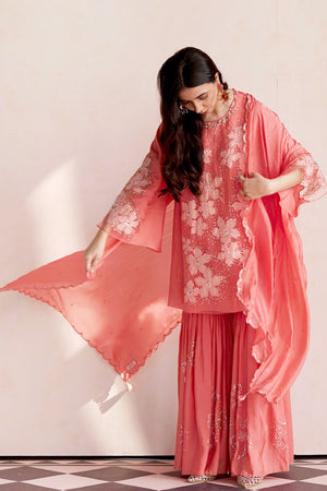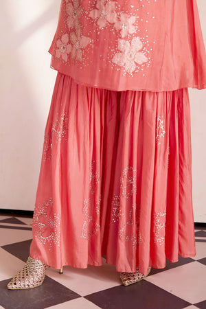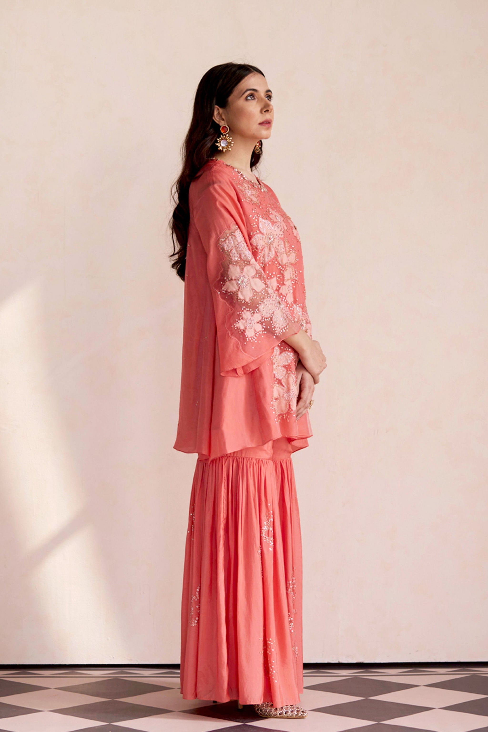 • Featuring a coral sharara set in viscose silk base. Floral applique highlighted with crystal and sequins.