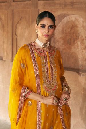 • This elegant short a-line kurta crafted in pure silk banarasi, paired with a traditional dogri salwar and a silk organza dupatta. The kurta features a zero neckline with placket and elegant bell sleeves. The ensemble is adorned with intricate kashmiri tilla and gota patti embroidery, highlighted with pearls and sequins, and finished with delicate gota detailing.