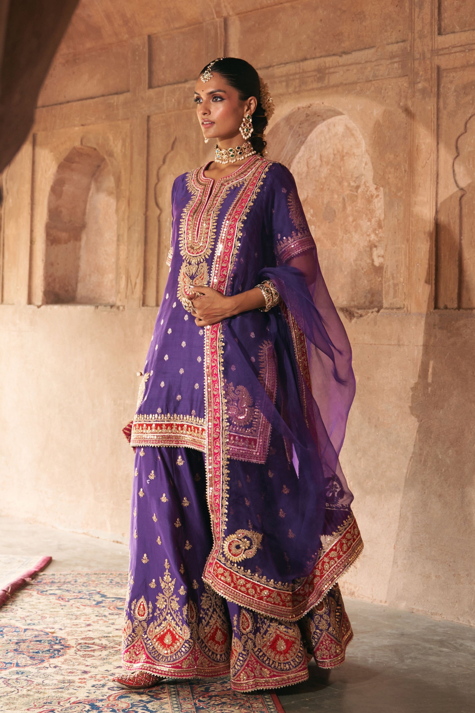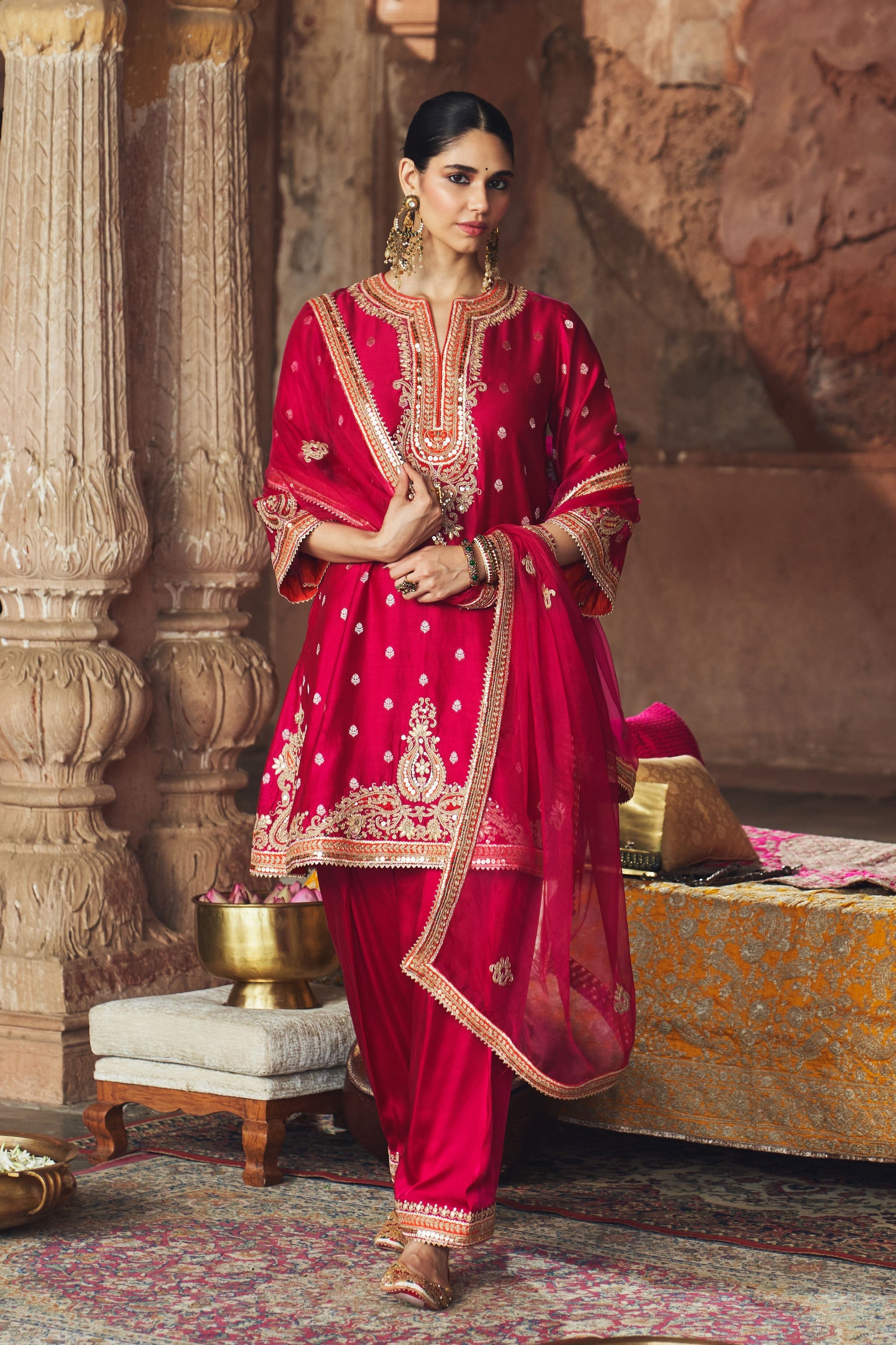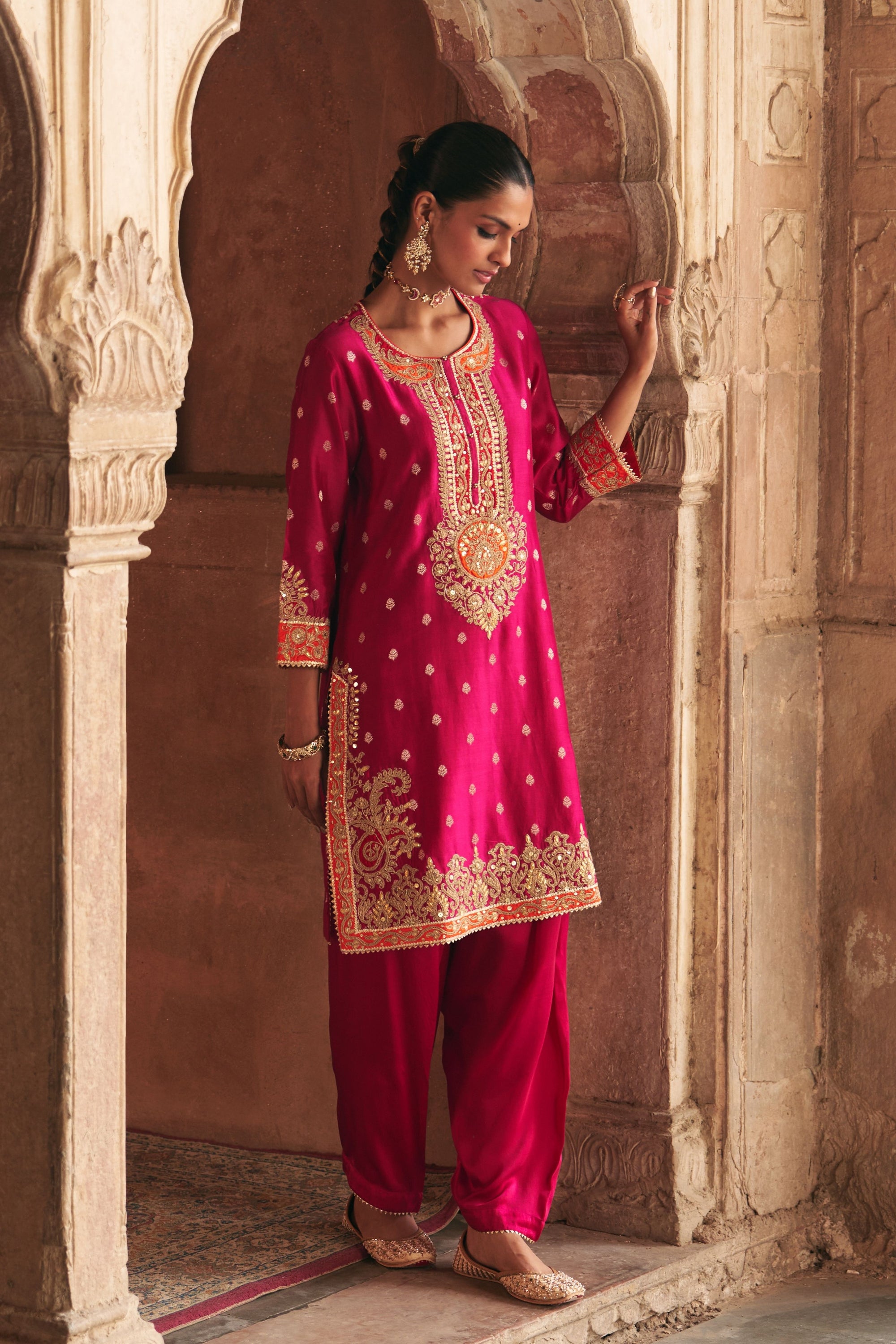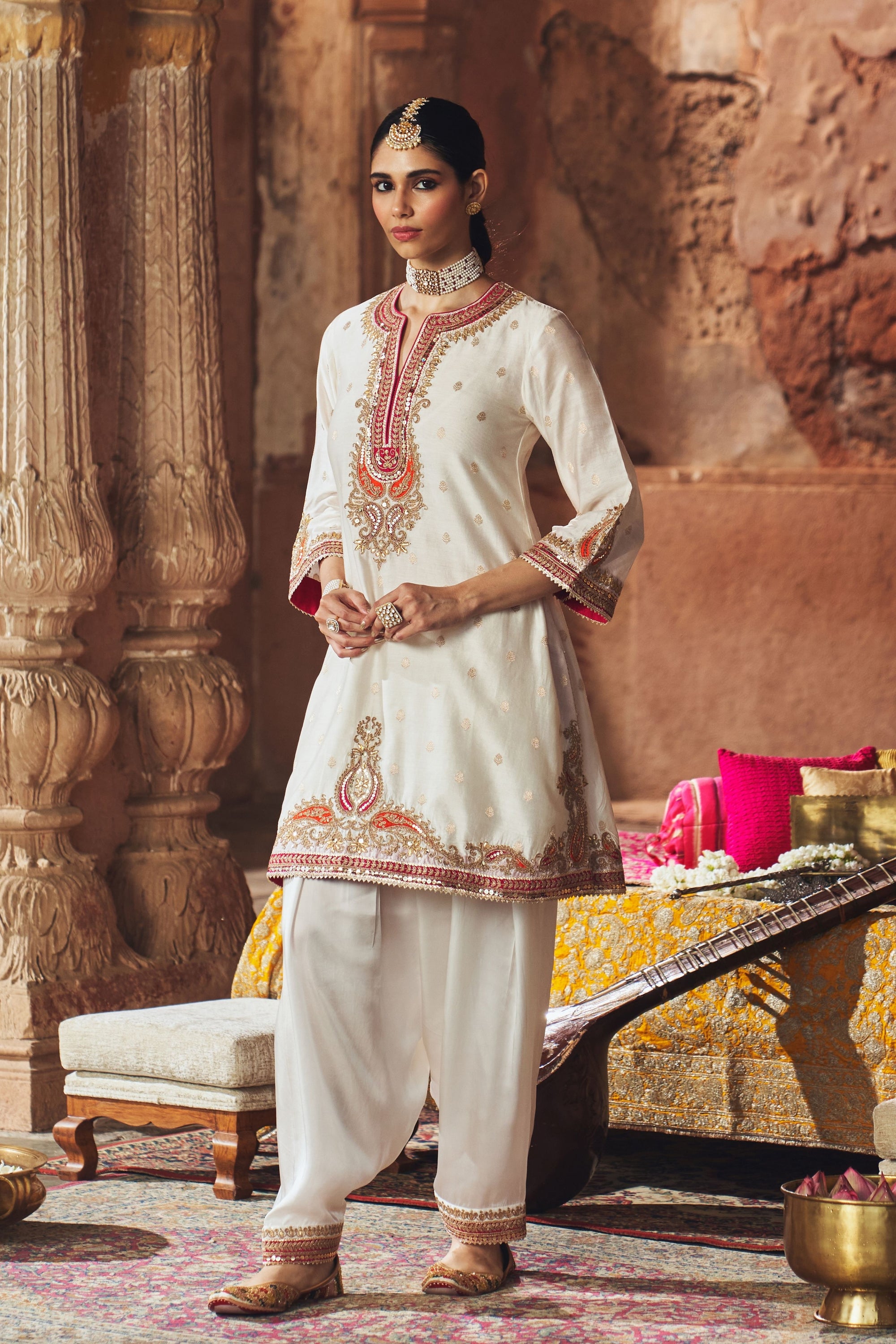 • A refined ensemble crafted in pure silk chanderi banarasi, paired with a traditional dogri salwar. The kurta features a zero neckline with placket and three-quarter bell sleeves. Intricately adorned with kashmiri tilla and gota patti embroidery, highlighted with pearls and sequins, the outfit is finished with delicate gota detailing for an elegant touch.