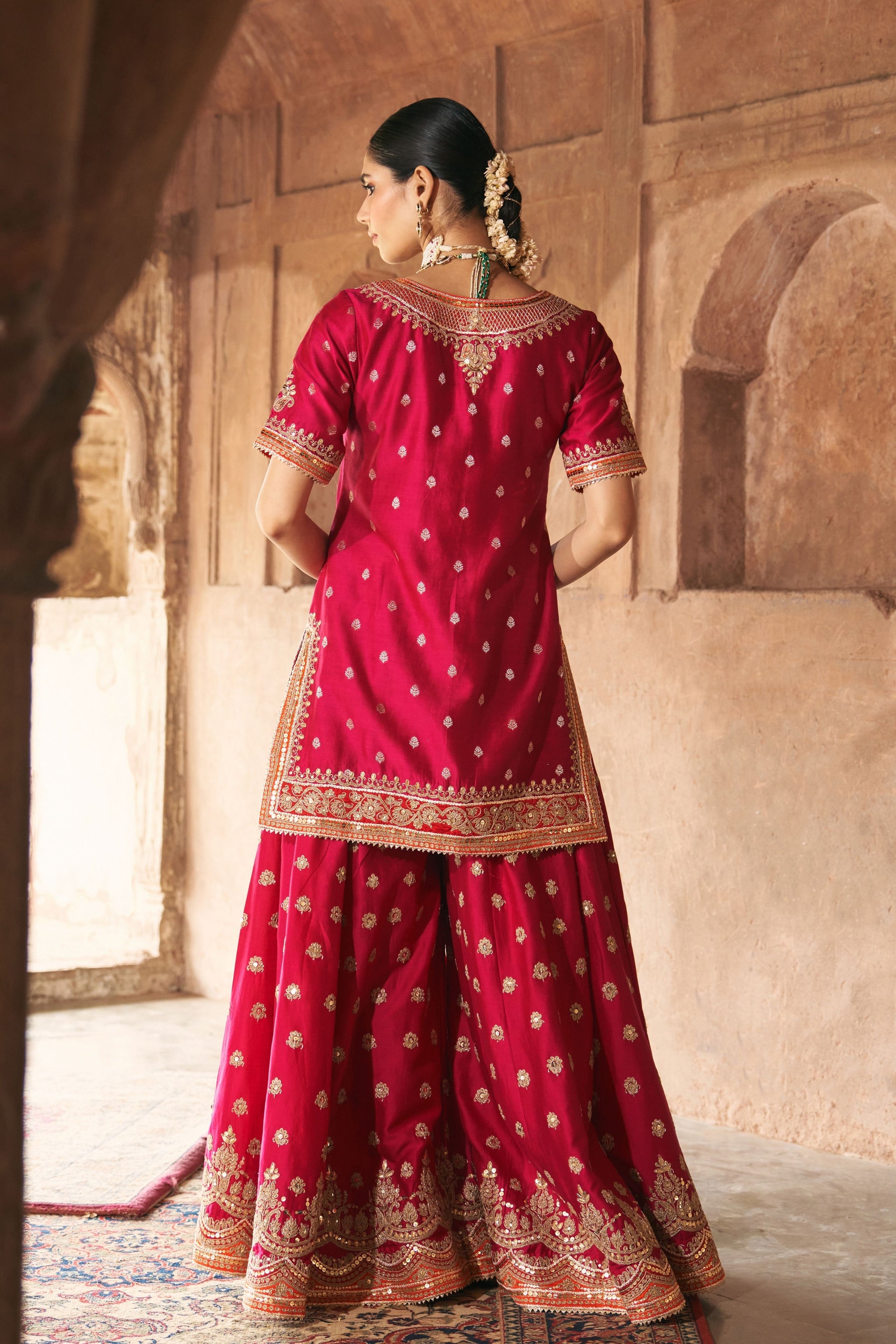 • This graceful ensemble features a pure banarasi short kurta with a broad deep scoop neckline, zero back, and elbow sleeves. Paired with a sharara adorned with a broad border and embroidered bootis, and a silk organza dupatta, the set is embellished with kashmiri tilla and gota patti embroidery, highlighted with pearls and sequins. Finished with delicate gota detailing, this outfit exudes timeless elegance.