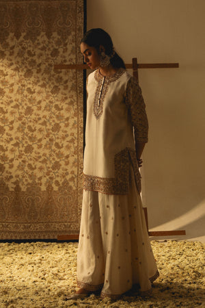 • The Shadaab ensemble showcases intricate hand work on a short kurta, made in pure Silk Chanderi fabric. This luxurious and comfortable fabric is embellished with heritage Gota Patti and Dabka Zardozi Embroidery. The ensemble is teamed up with a kalidaar Sharara. The look features a zero neck with placket and three-quarter sleeves. The outfit is highlighted with a border on the ghera and neck, with a jaal on the sleeves. It is finished with an Orange Pure Banarsi booti fabric.This outfit is dedicated to Shadaab, our talented artisan and his team who worked over 270 hours to embroider this ensemble by hand.