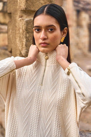 • Soft knitted band collared popover top. Textured jacquard in a cable knit pattern. Gold zip with round puller tabs on the front neck and sleeve cuffs. Relaxed fit.