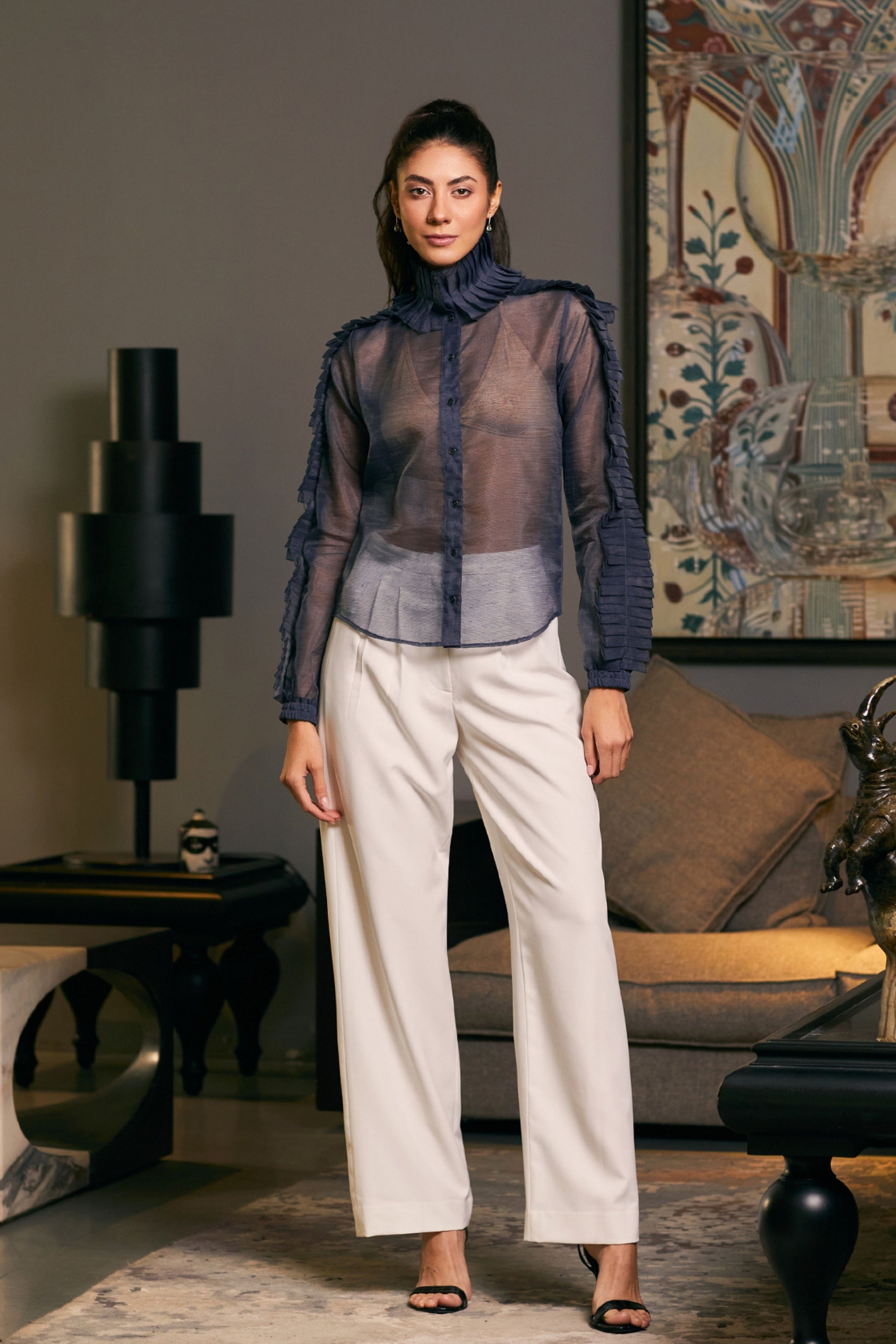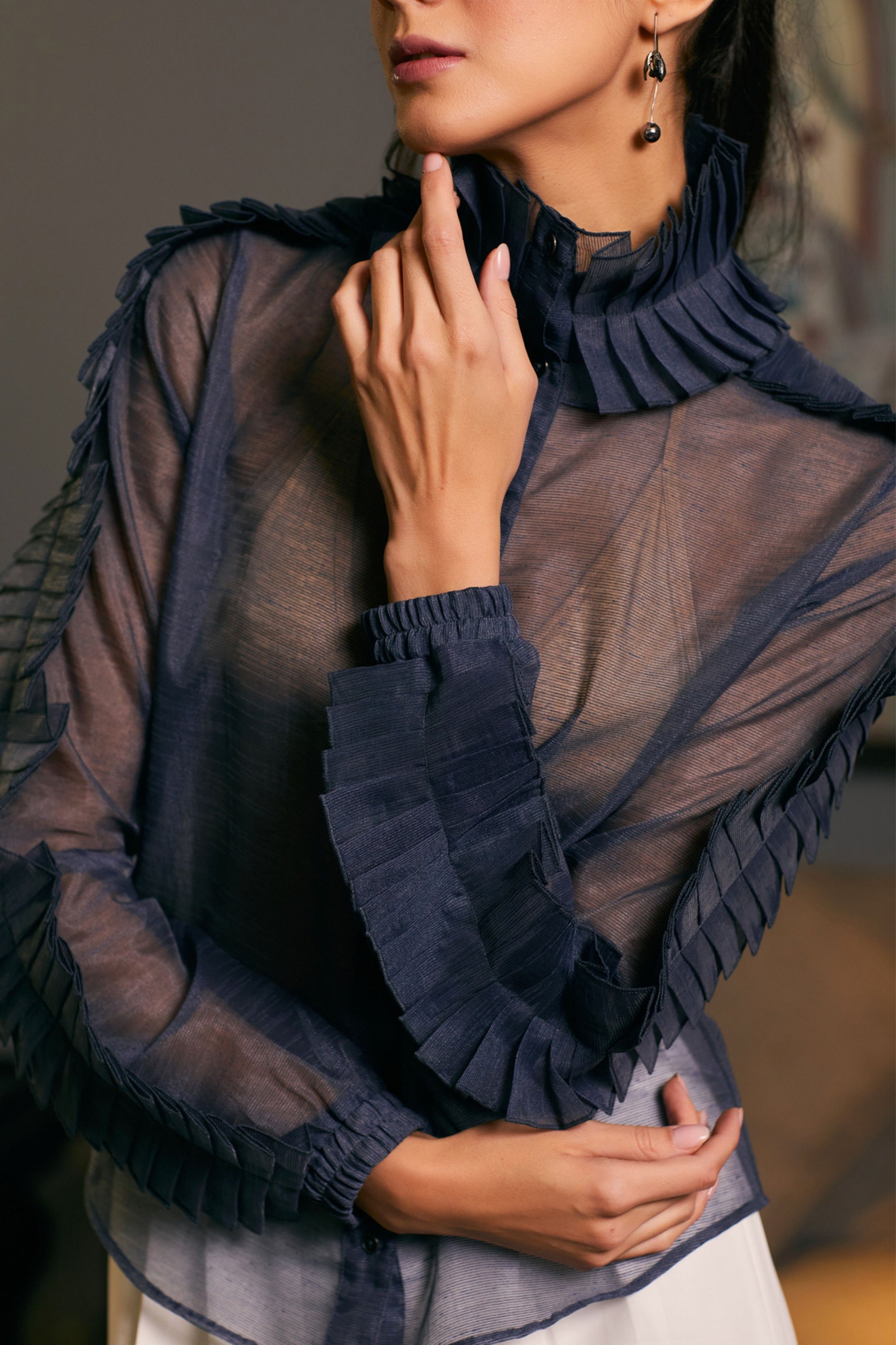• Navy blue textured organza shirt with pleated collar & sleeves