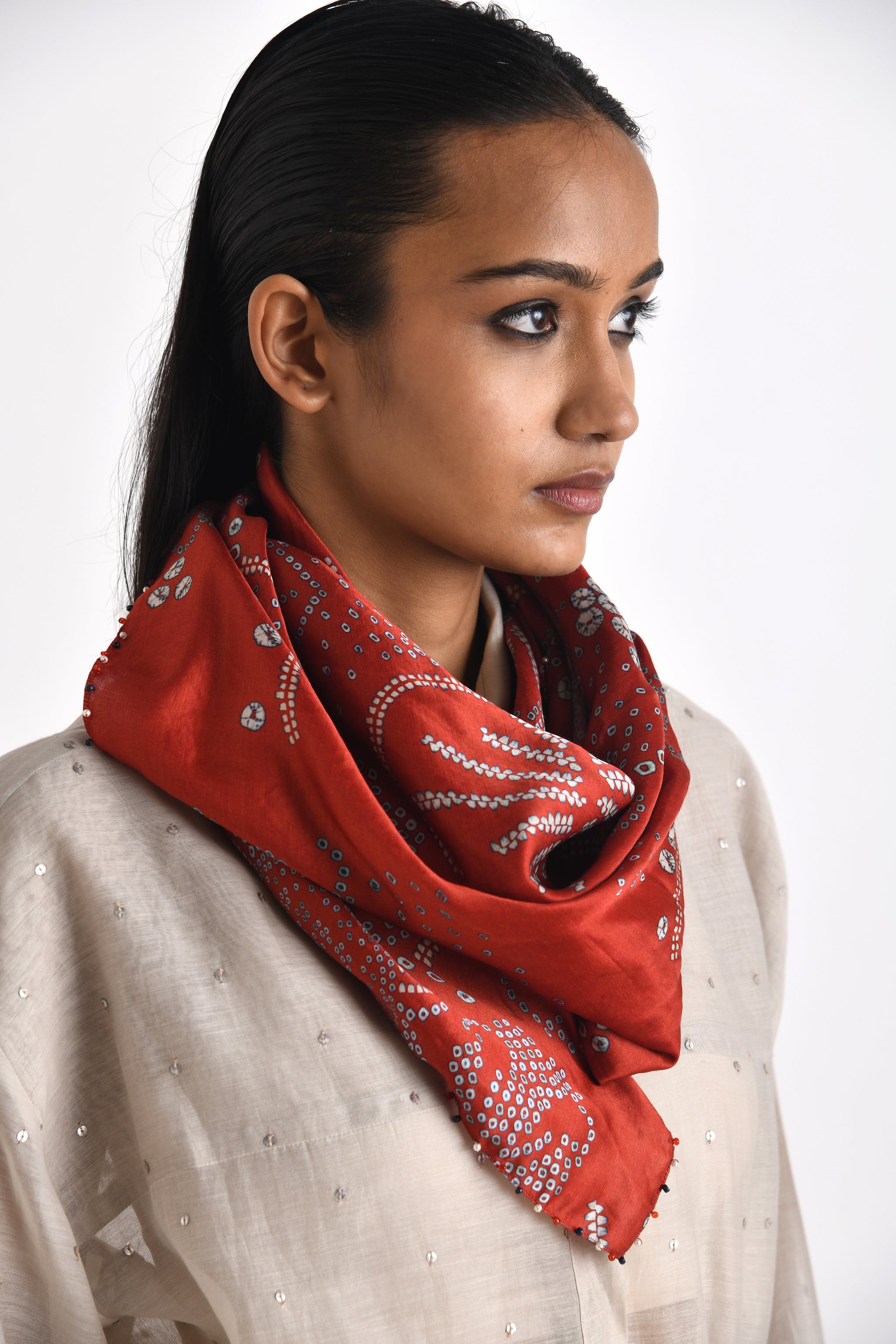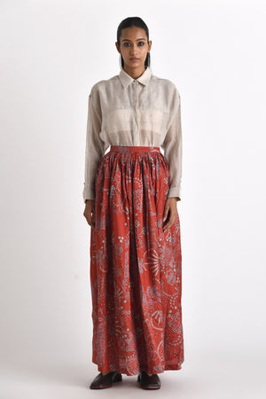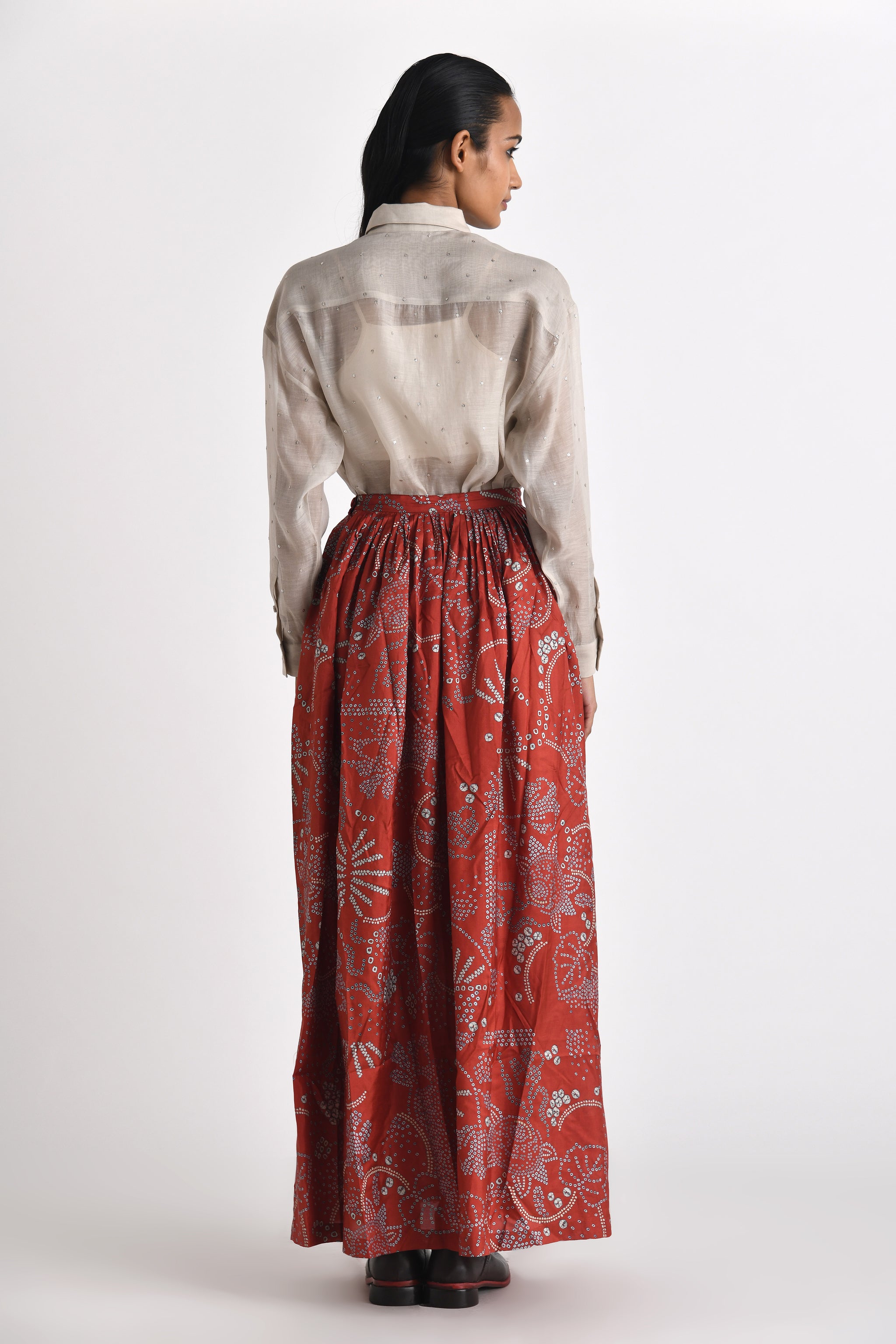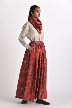 • The skirt and scarf can be sold separately. Check out, Red Pella Pleated Skirt & Galia Printed Bhandini Scarf