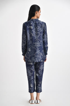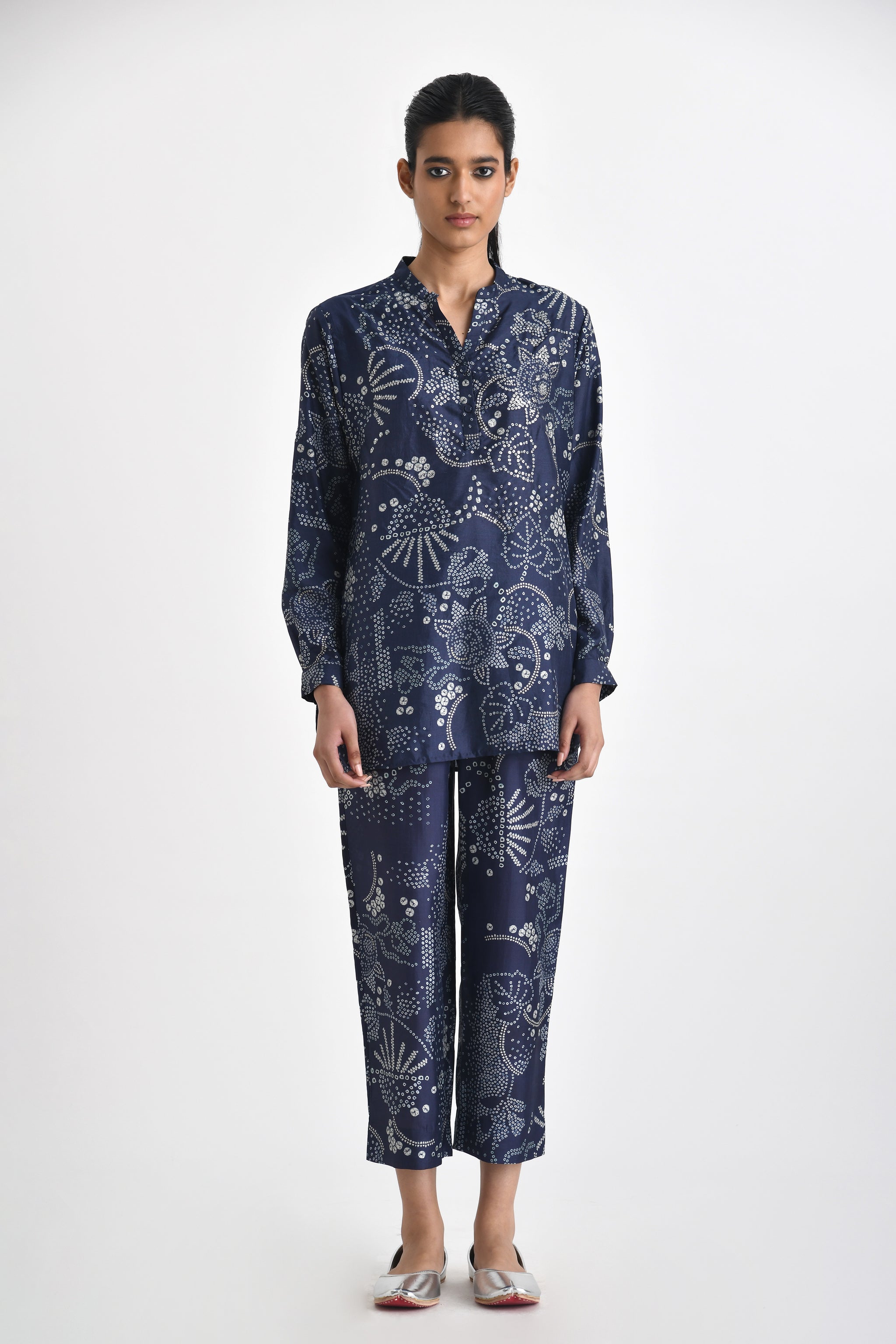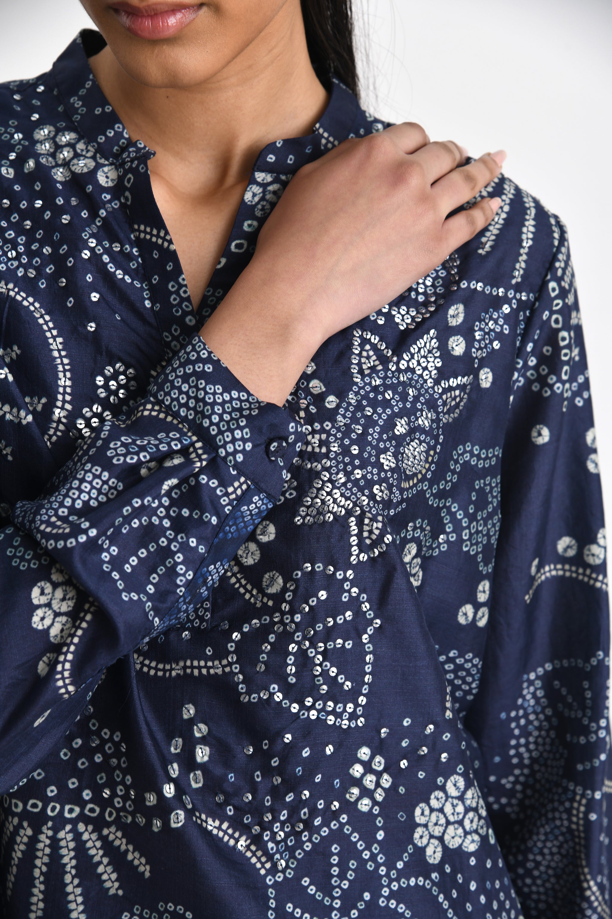 • All over bandhni printed, band collar, v- neck kurta top. Motifs around the neck are emphasized by subtle sequin details.