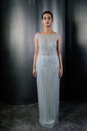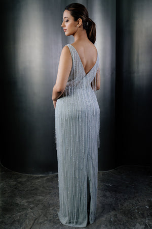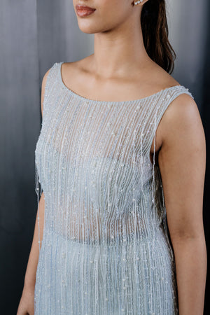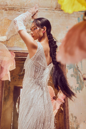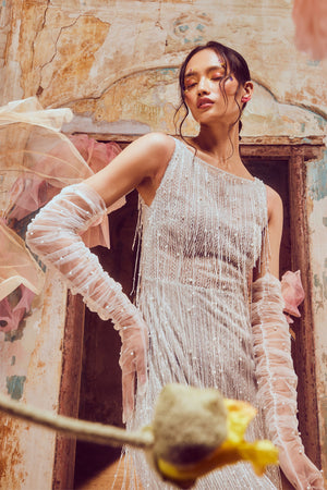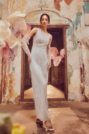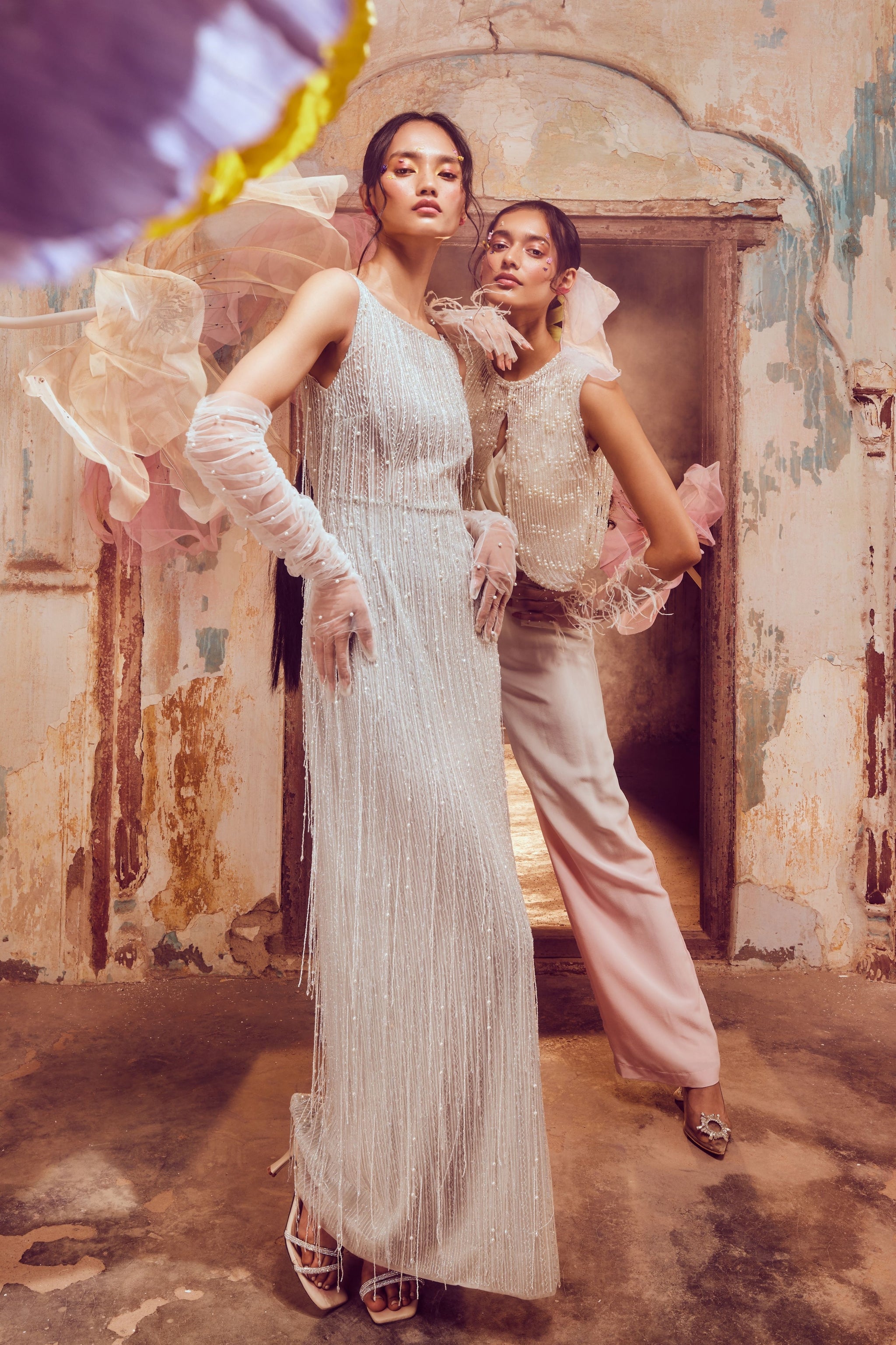 • This ankle length midi is crafted in a tulle base and embellished with beaded lines in multi-coloured fringe highlights.