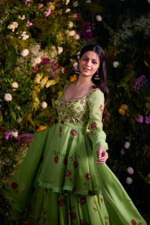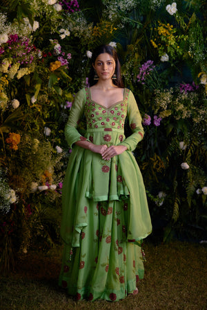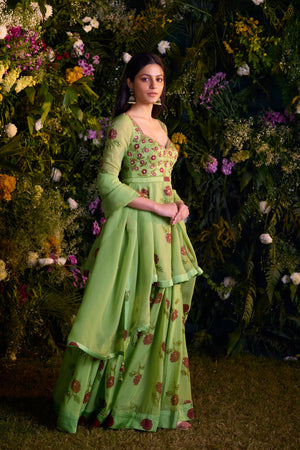 • Macaw green block printed zardozi and sequence embroidered top and sharara with organza dupatta