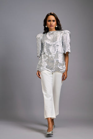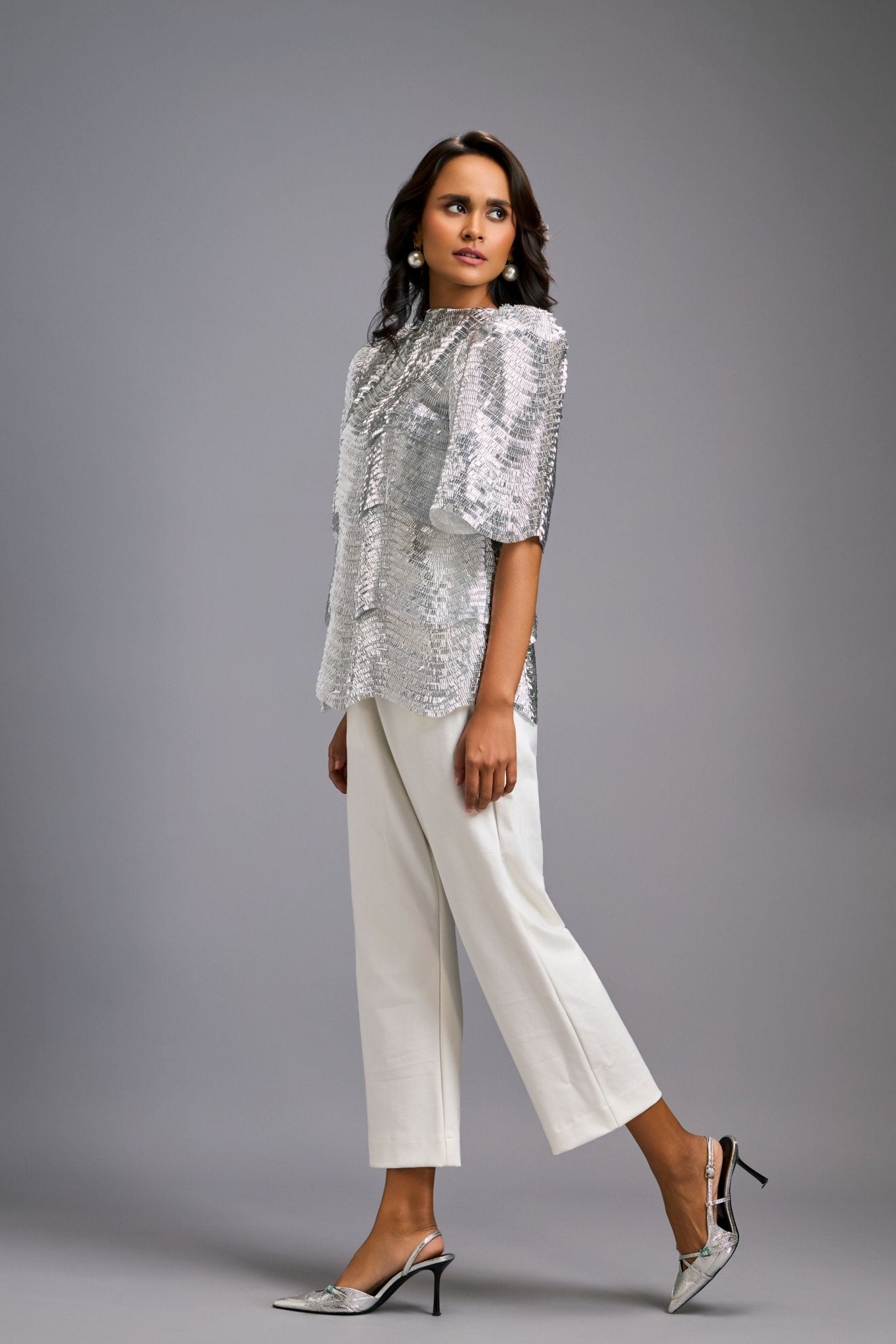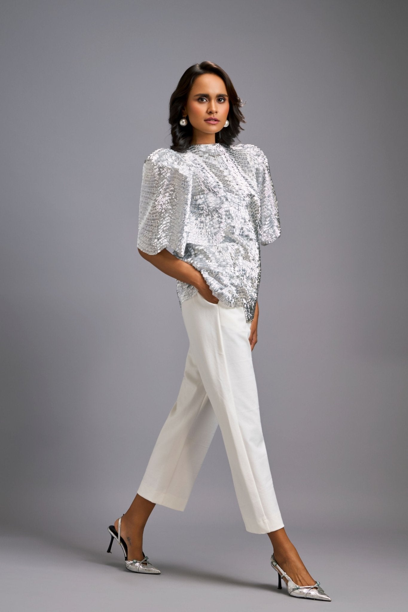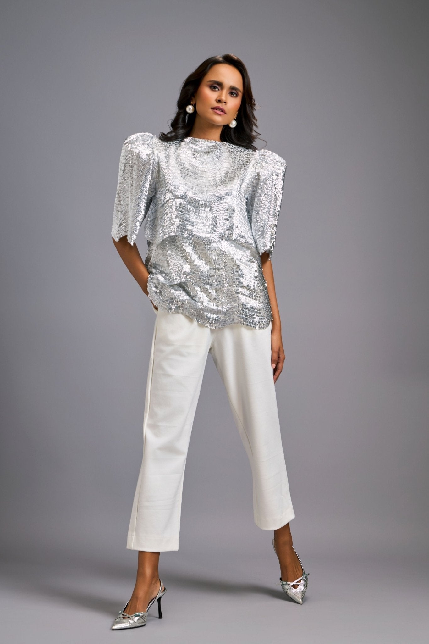 • Textured silver shimmer top with sculptural shoulder detailing paired with a tailored white cropped pants