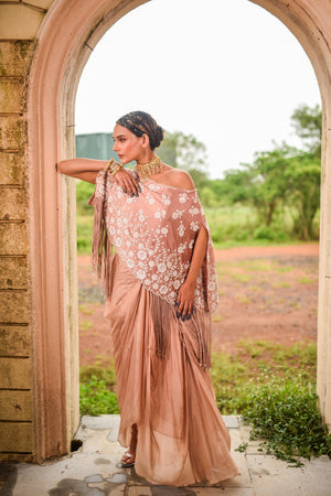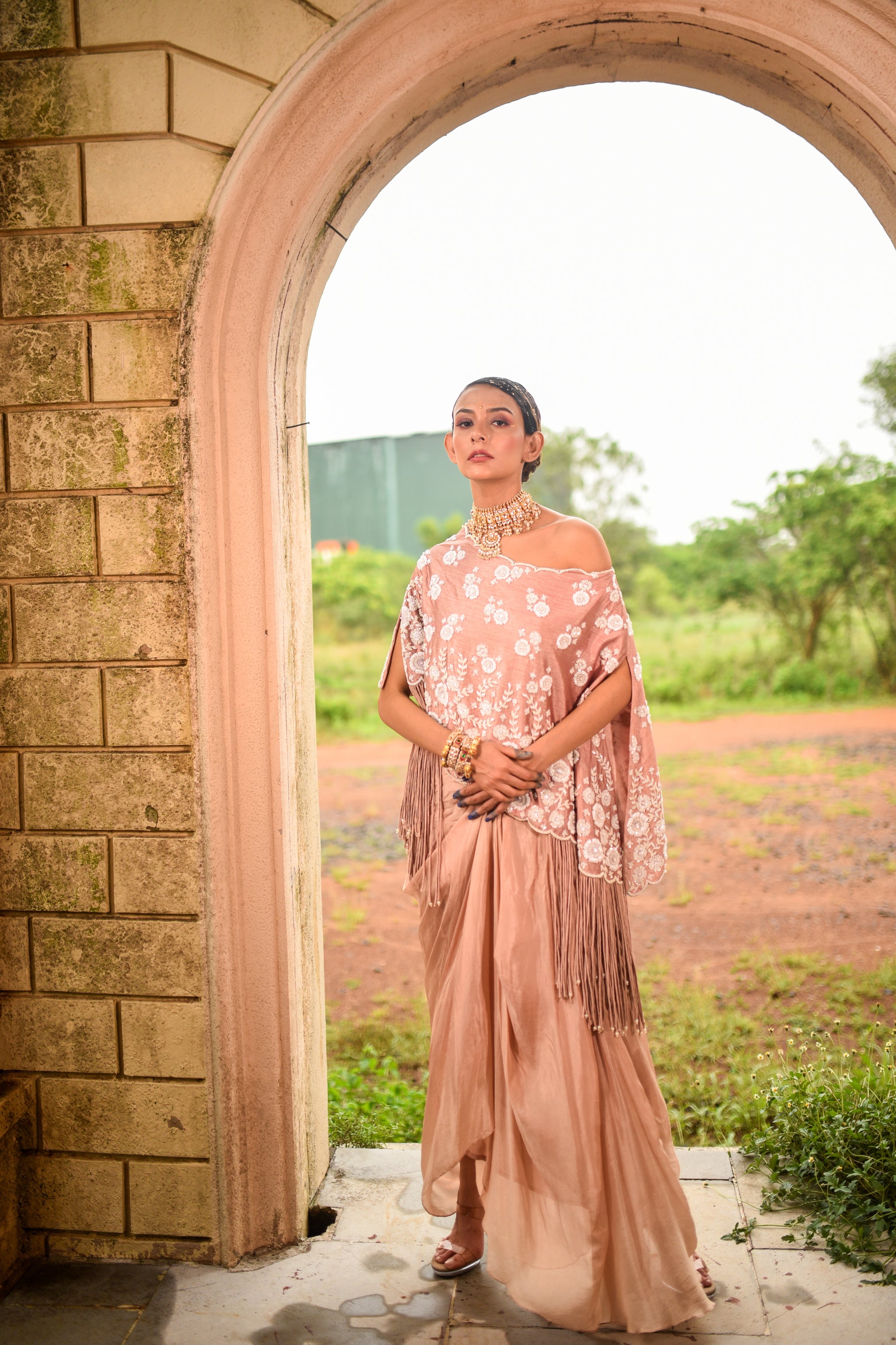 • Off shoulder side slit cape with a bustier and a pick up skirt completely embroidered in various floral motifs.