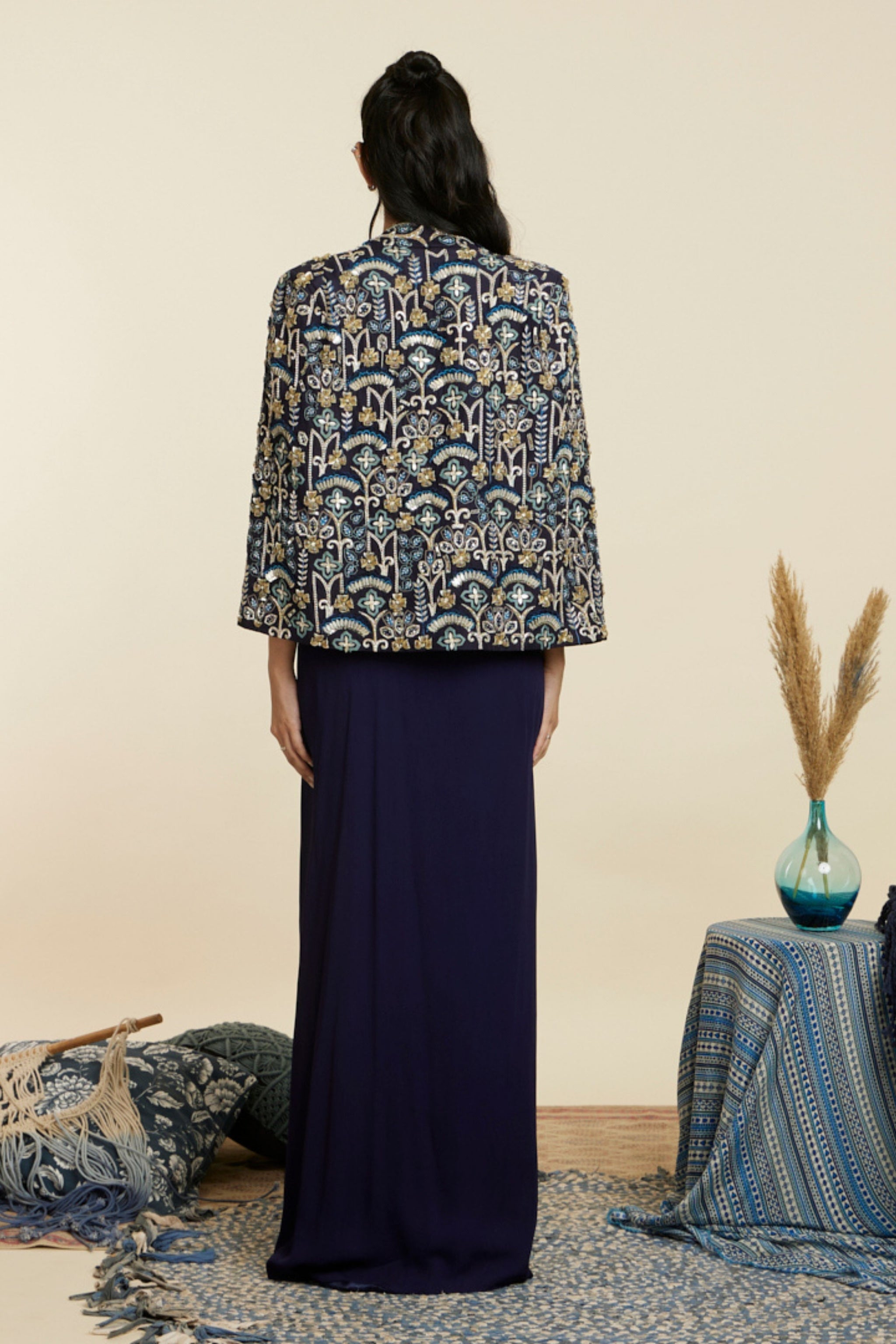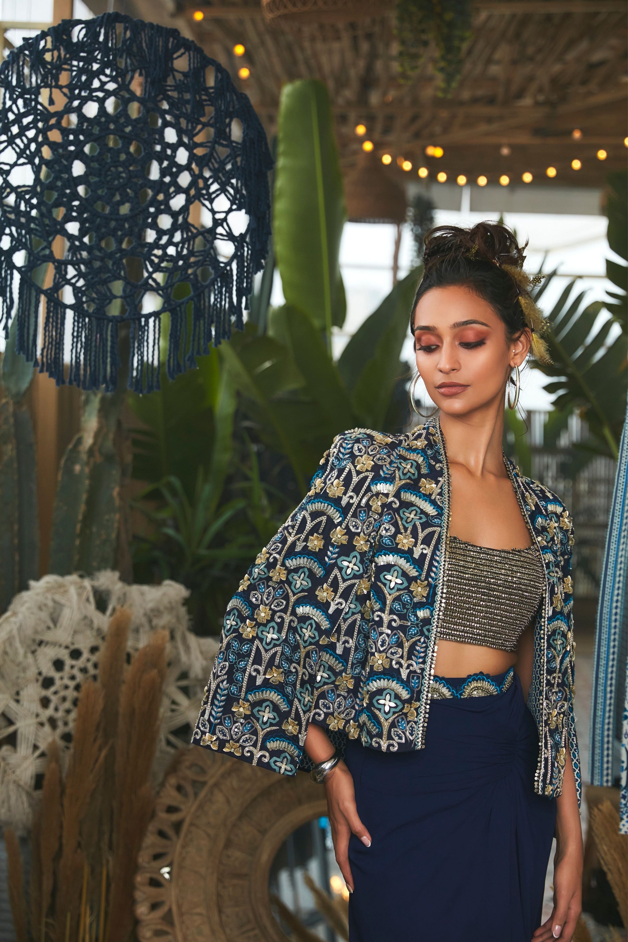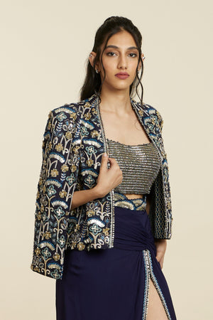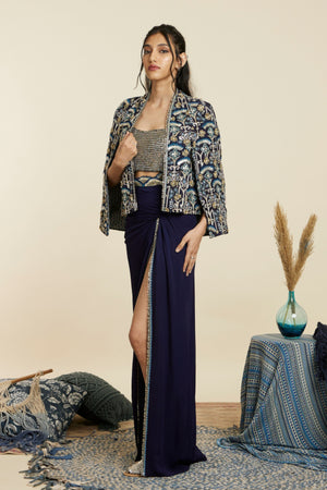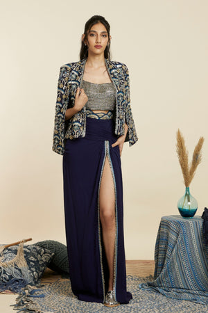 • Blue scallop noor jacket paired with embellished bustier and high slit skirt