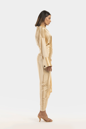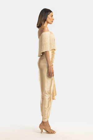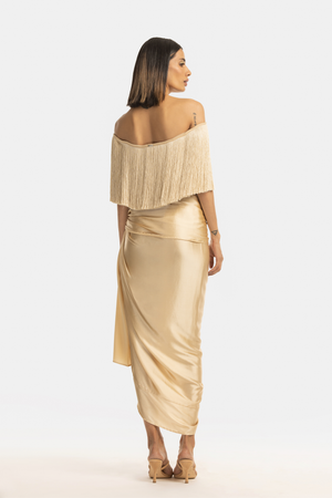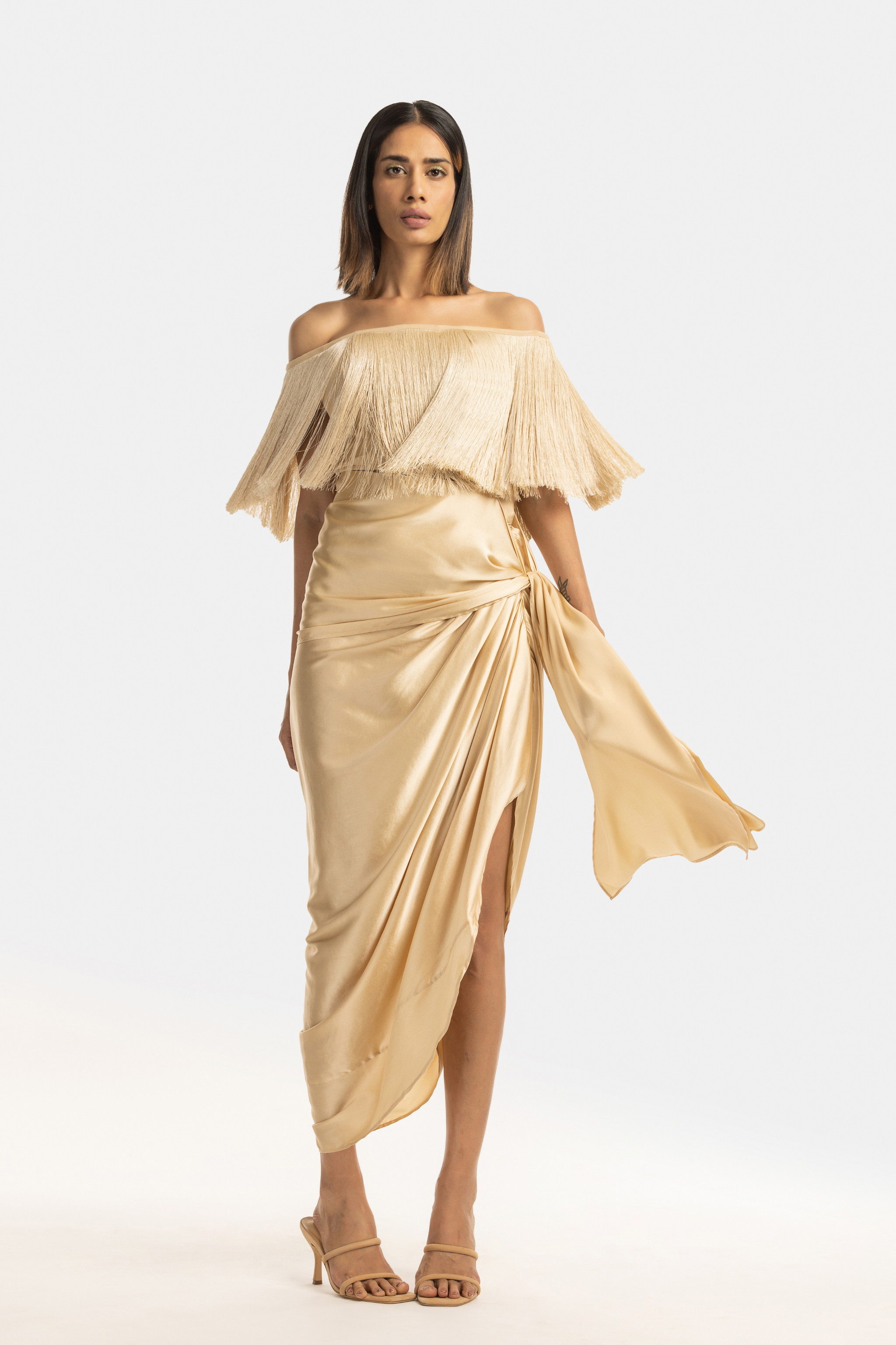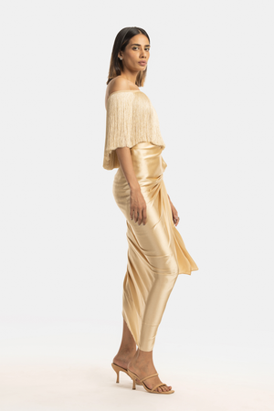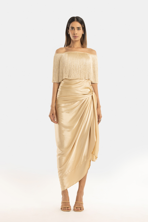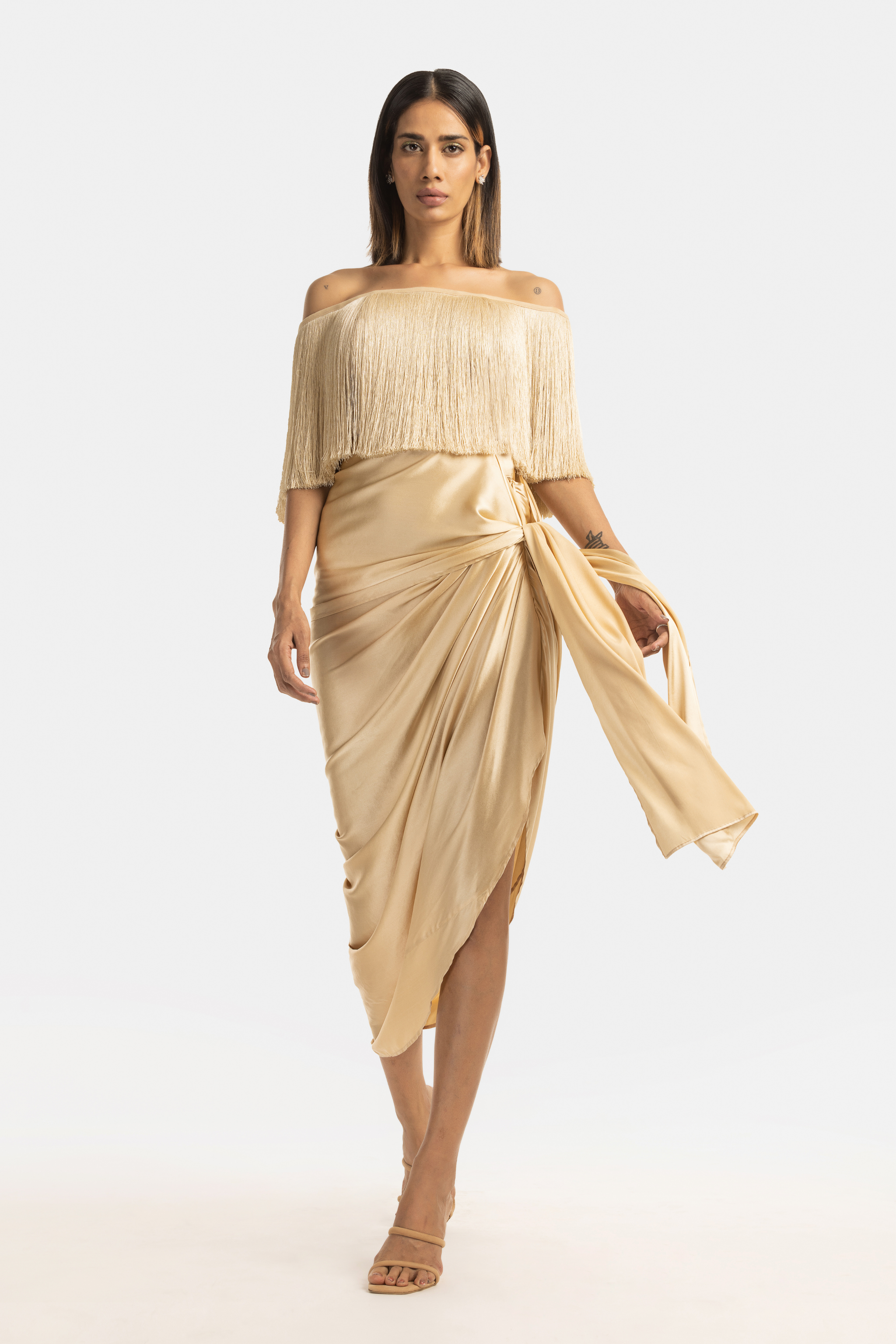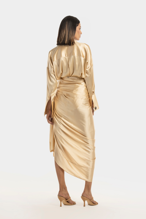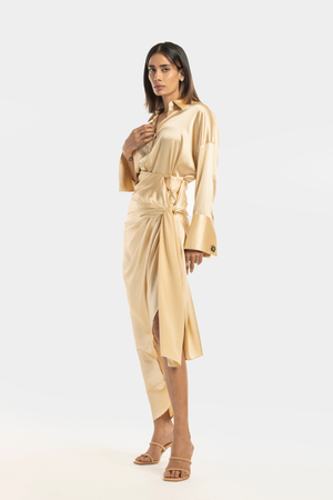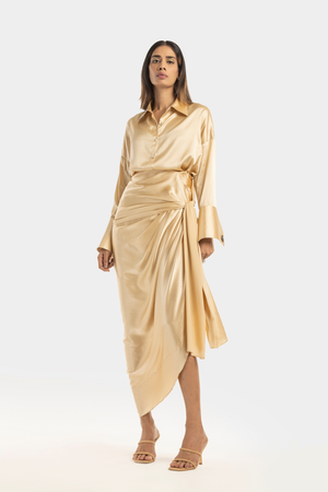 • Our signature draped Tie Up Skirt can be worn three different ways, making it an essential part of your wardrobe. The layered upper panel can be tied up on the side, at the front and also on the shoulder. You can pair it with our Star Luxe Shirt for a foolproof look. Fit - Cut for a slim fit.