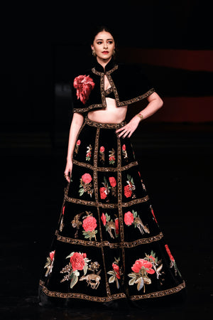 • Elevate your style with this exquisite velvet lehenga and cape set, paired with a chic bustier. Crafted from premium velvet and chanderi silk, this ensemble features a blend of intricate machine and hand embroidery, offering a perfect balance of elegance and craftsmanship. Ideal for weddings, festive occasions, or special celebrations, this outfit ensures you make a stunning statement