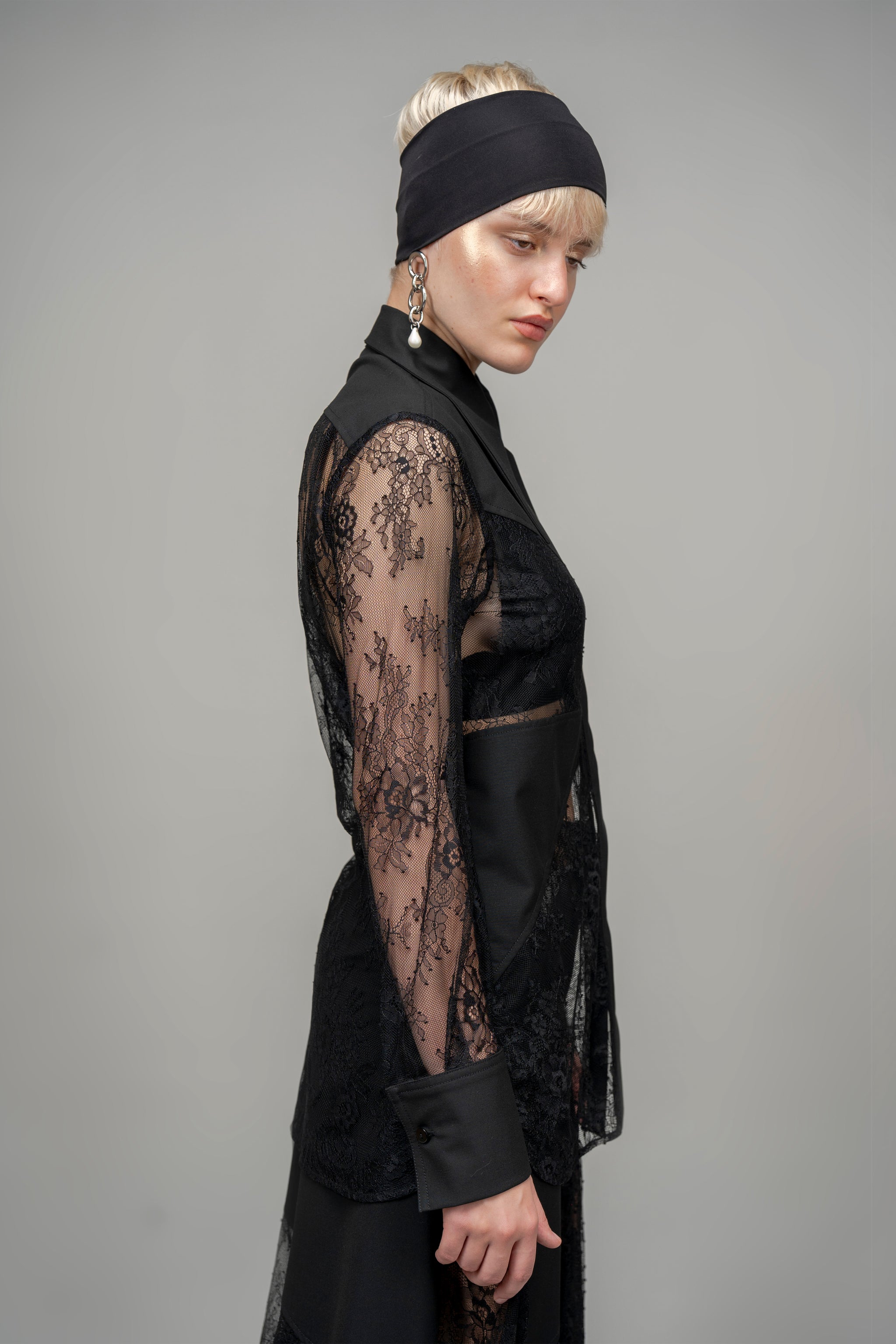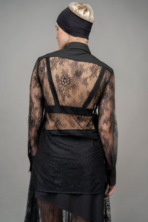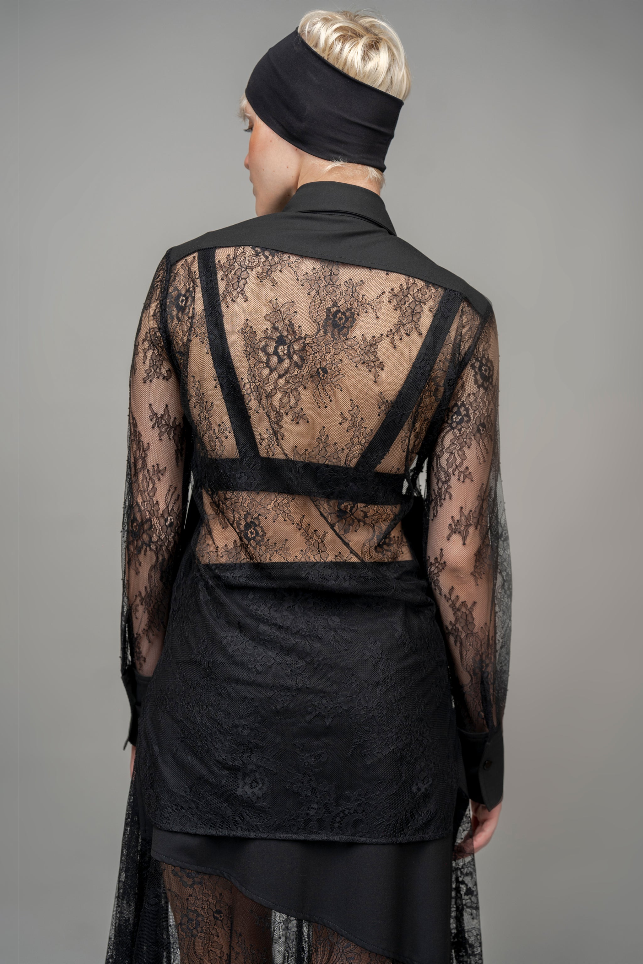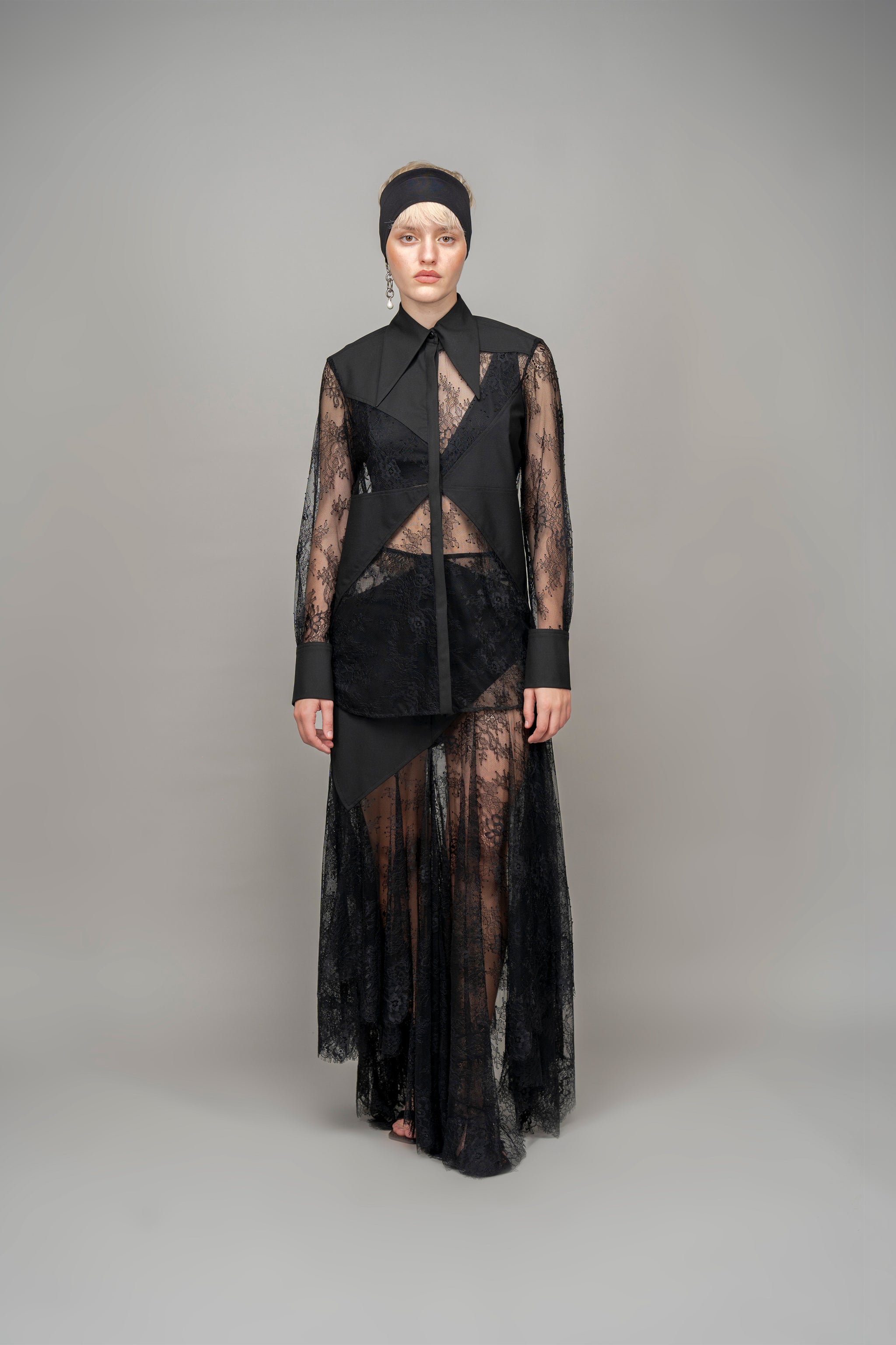 • This asymmetrical skirt is cut in fragile lace featuring opaque paneling and an assembly of high and low hem adorned with scallop detail. Model wear size s model height is 5'8 garment length is 40''