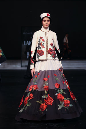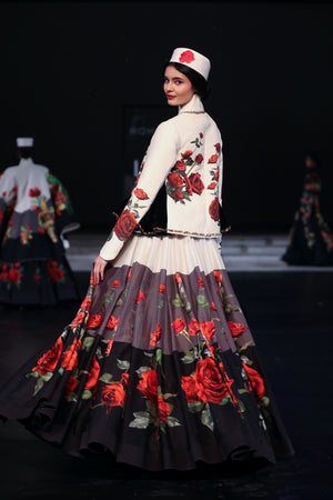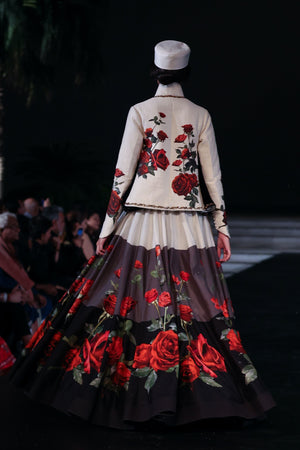 • Elevate your style with this opulent quilted jacket and skirt set. The jacket features a rich combination of chanderi silk and velvet silk, offering a soft, luxurious feel with a sophisticated printed design. Hand-embroidered borders add a touch of artistry and refinement. The inner skirt, designed with 24 luxurious kali panels, is crafted from chanderi silk for a smooth, graceful drape. Finished with a beautifully quilted border, this set blends timeless craftsmanship with modern elegance, perfect for any occasion.