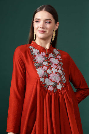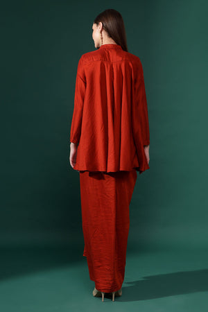 • Rust flowy tunic with long sleeves mandarin collar neck and front button closure sequin and bead floral hand embroidery on the yoke paired with a matching drape skirt with an elasticated back waist accented with delicate drapes.