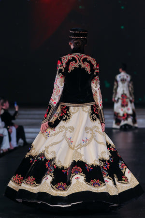 • Elevate your style with this elegant velvet ensemble, featuring a chic short jacket and matching skirt paired with a stylish jacket. Adorned with intricate resham embroidery, this set blends luxurious fabric with timeless craftsmanship, perfect for special occasions or evening soirees.