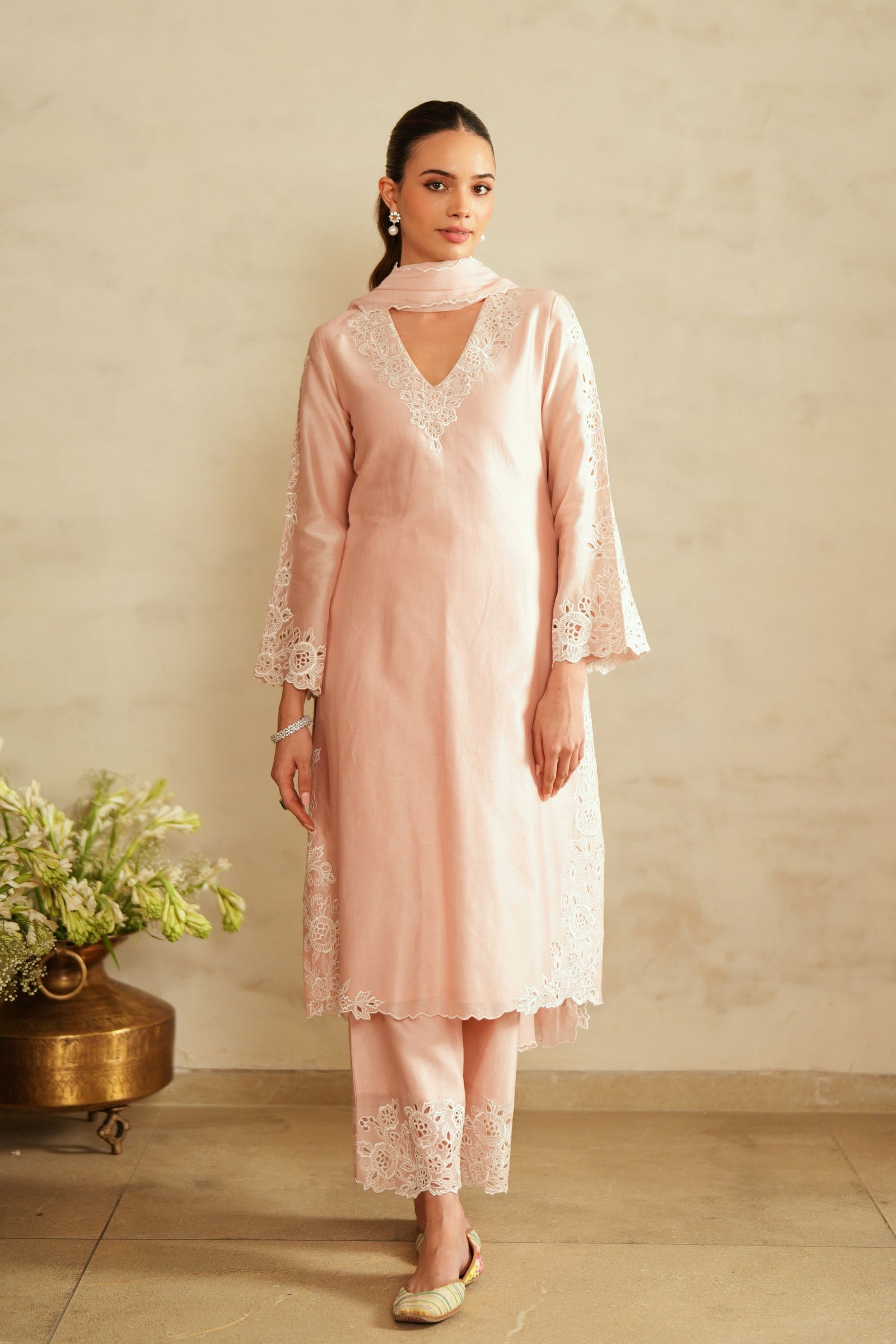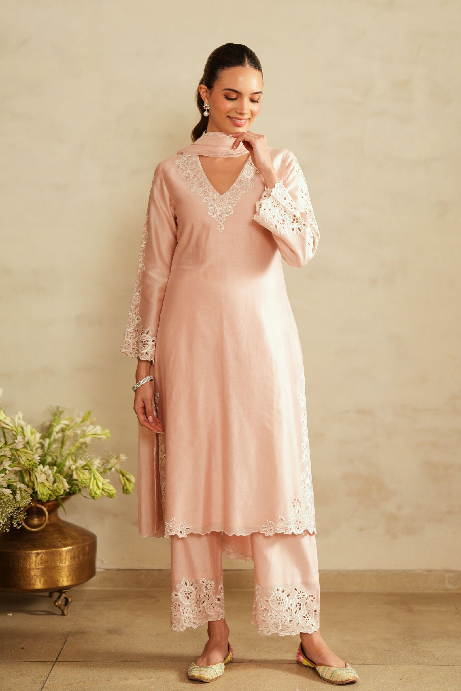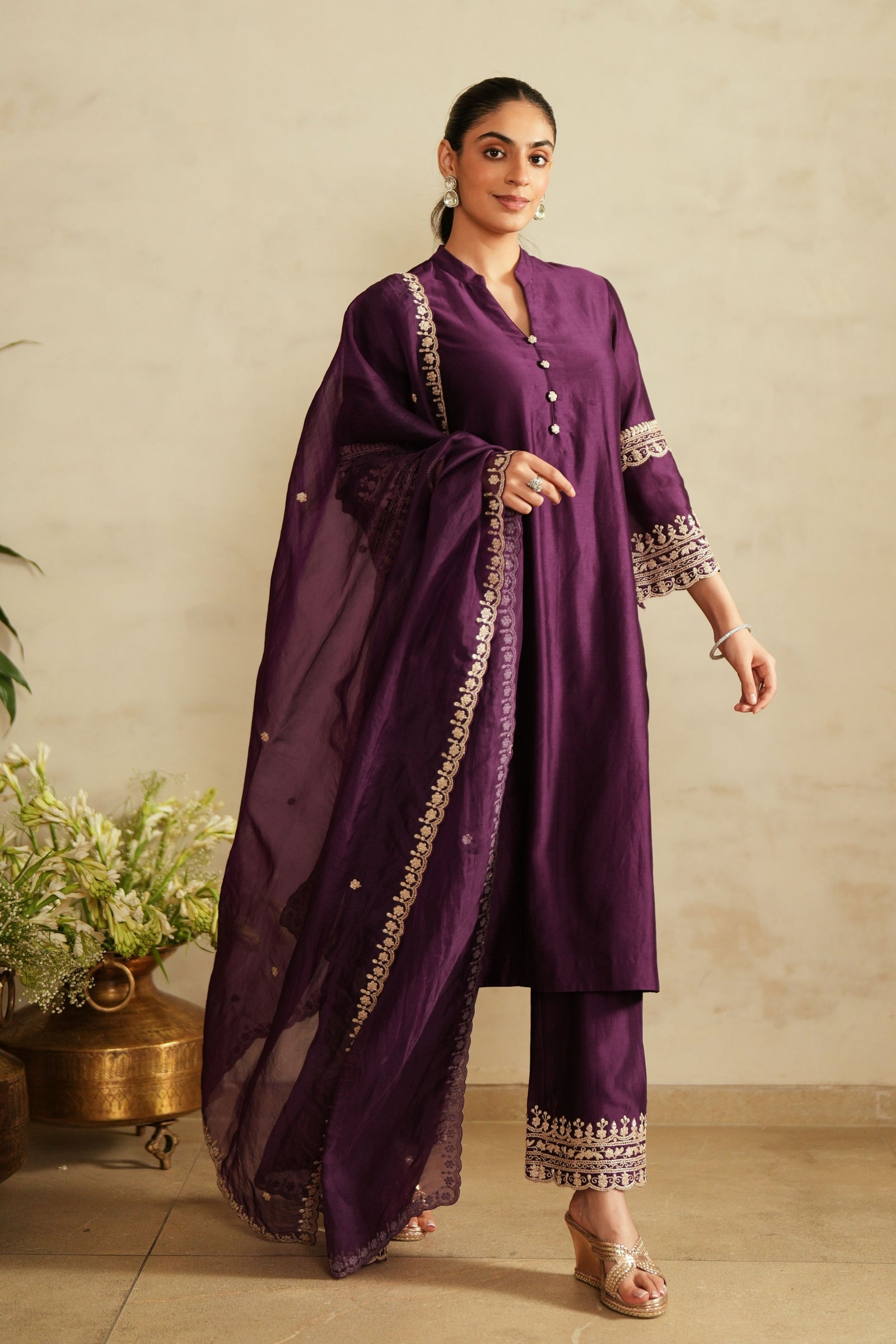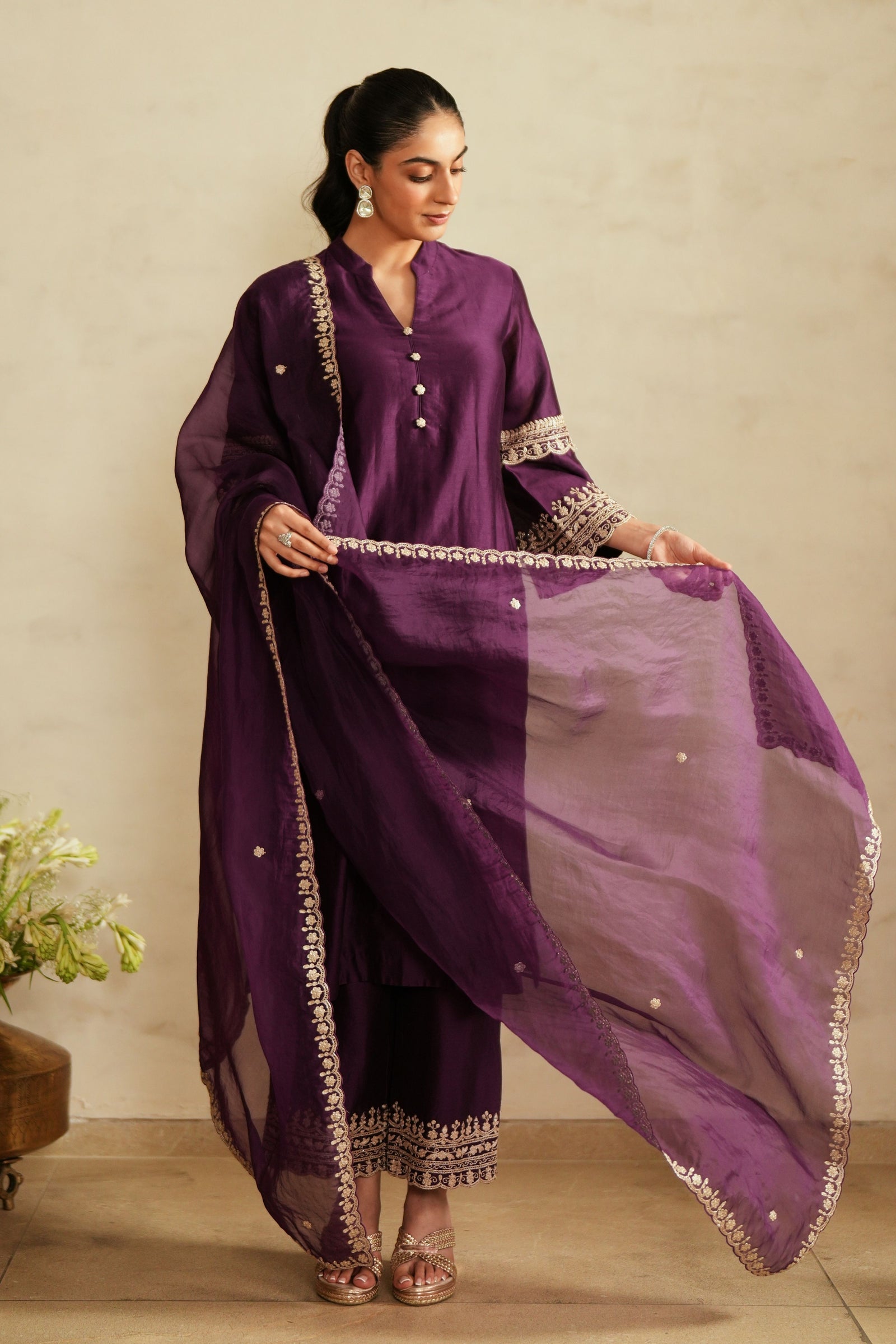 • A fully embroidered shirt is paired with salwar,featuring subtle tone-on-tone embroidery. The ensemble is completed with a dupatta adorned with intricate embroidered border detailing.
