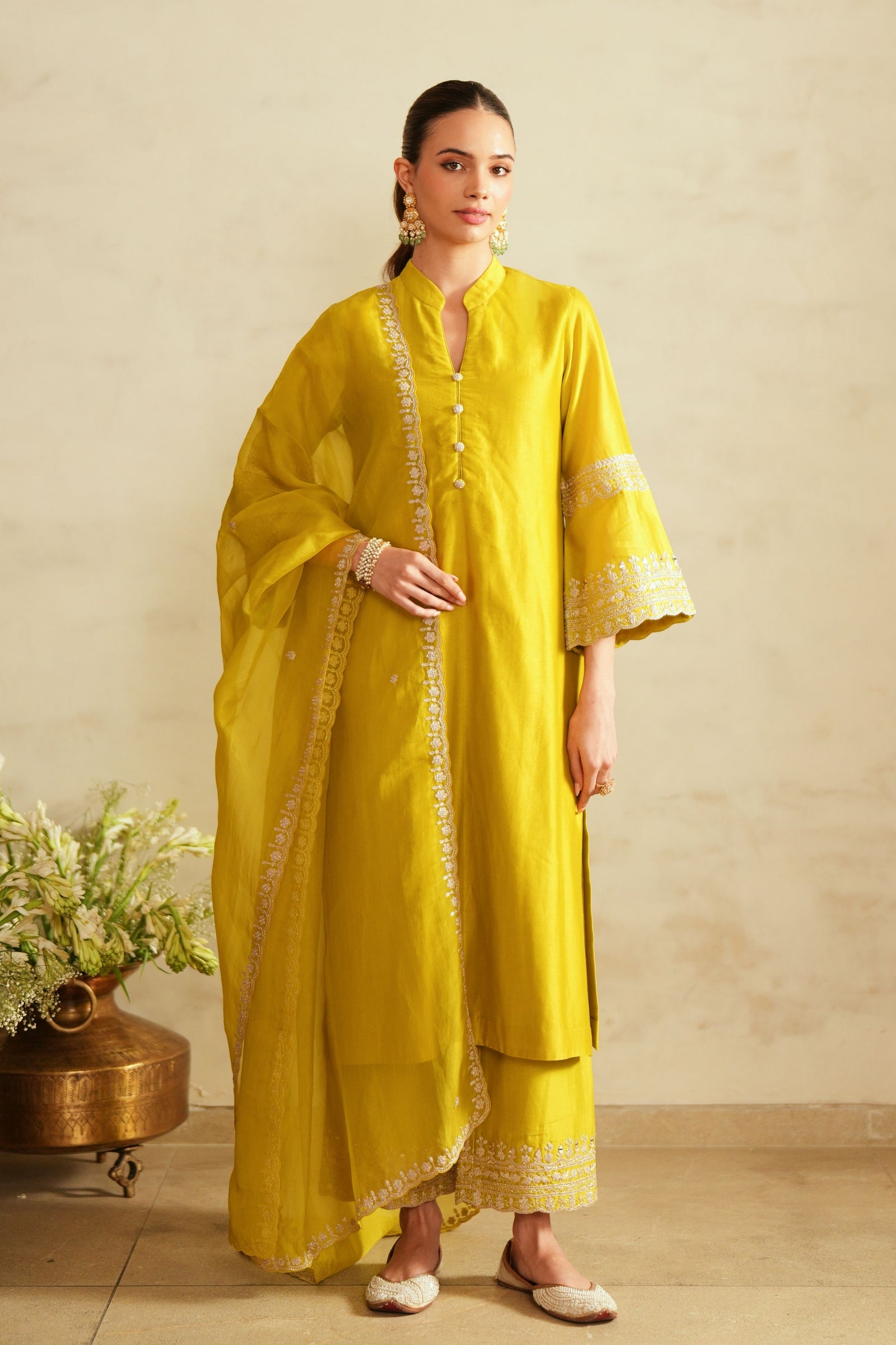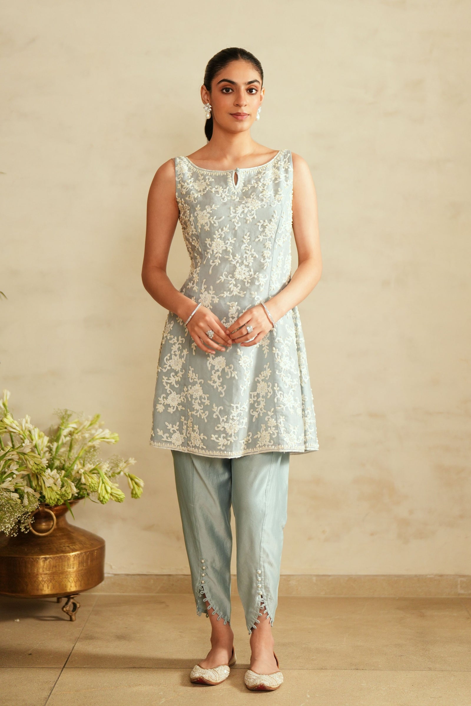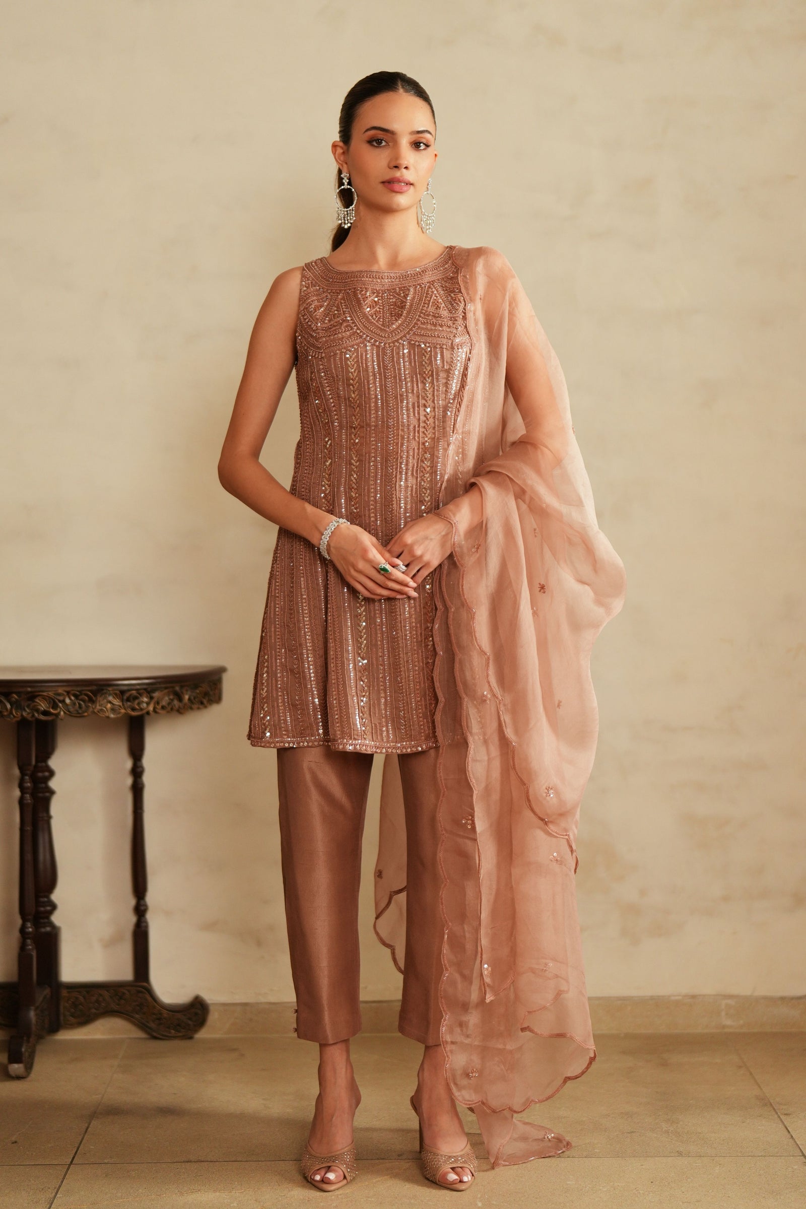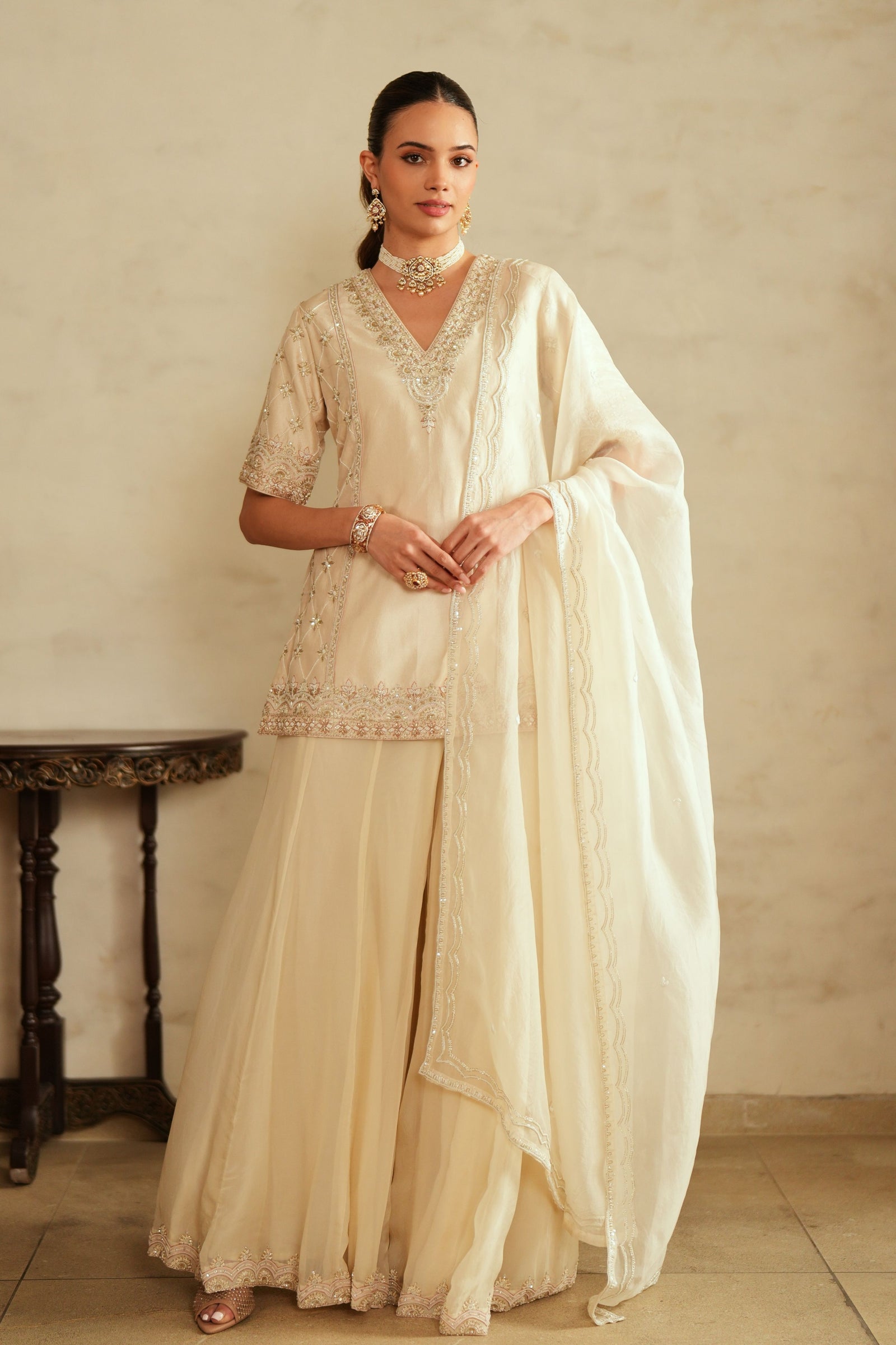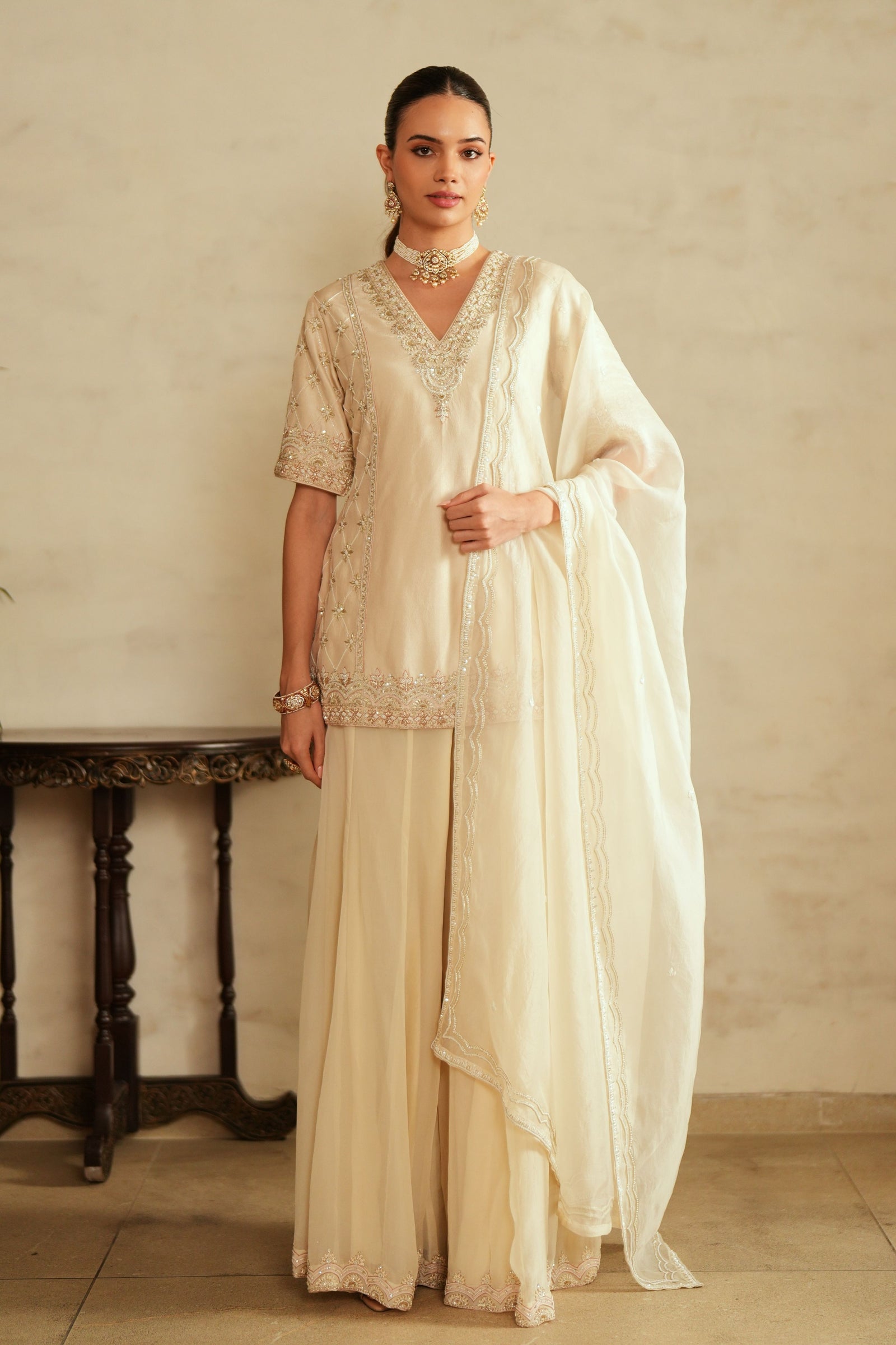 • A fully embroidered shirt is paired with salwar,featuring subtle tone-on-tone embroidery. The ensemble is completed with a dupatta adorned with intricate embroidered border detailing.
