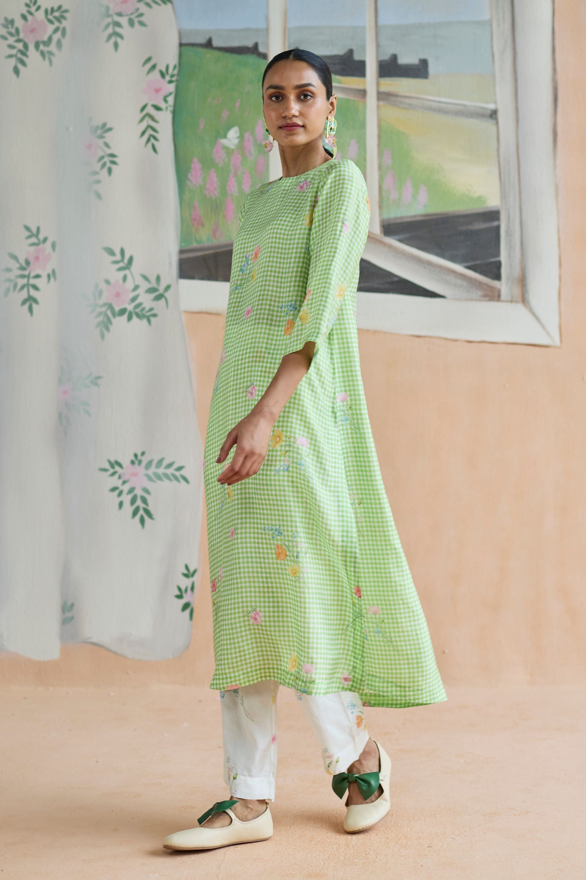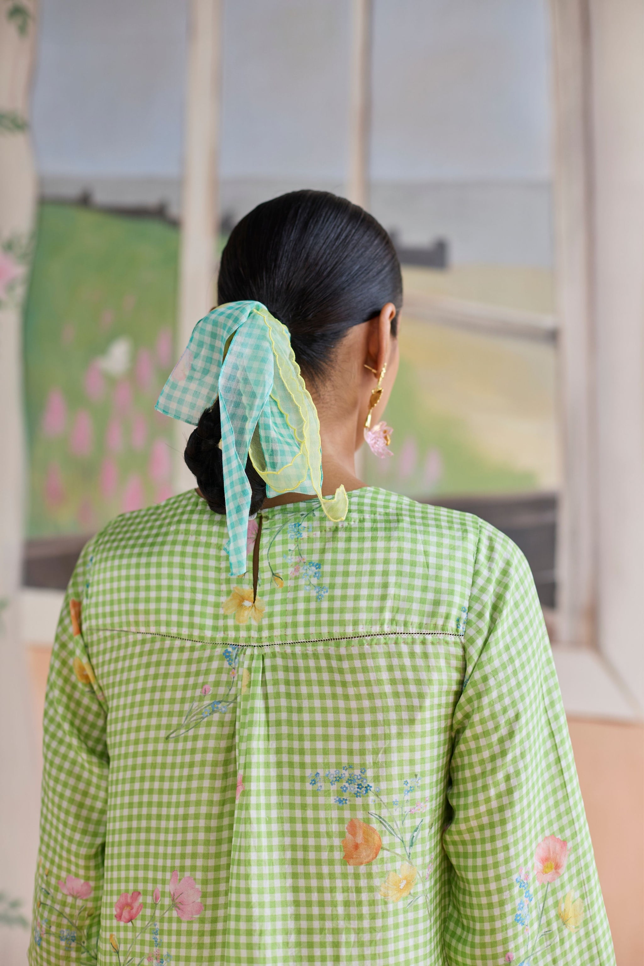 • Green checks and mallow flower long kurta set in handwoven mulberry silk alludes to a romance of checks with mallow flowers from kashmir valley. A reimagined classic checks with a poetic twist. Gathered blooms appear almost alive in contrast to the grid of checks. A relaxed fit, it offers ease and comfort while maintaining elegance. The kurta drapes fluidly, complemented by coordinating trousers that complete the look with grace. The model is 5 feet 7 inches tall and wearing size small. Dress length is 42 inches