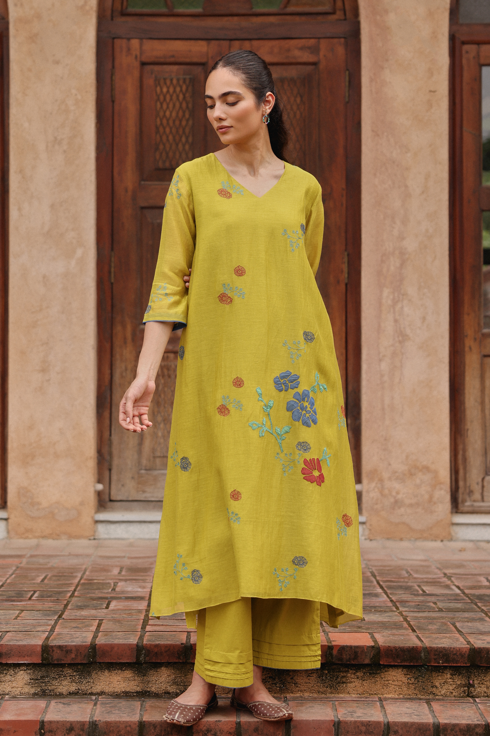 • The magnolia thread embroidered kurta set showcases contrasting embroidered blooms scattered across the kurta and sleeves. Paired with matching pants and a dupatta adorned with applique blooms and our signature tassels, it creates a graceful, festive-ready ensemble.