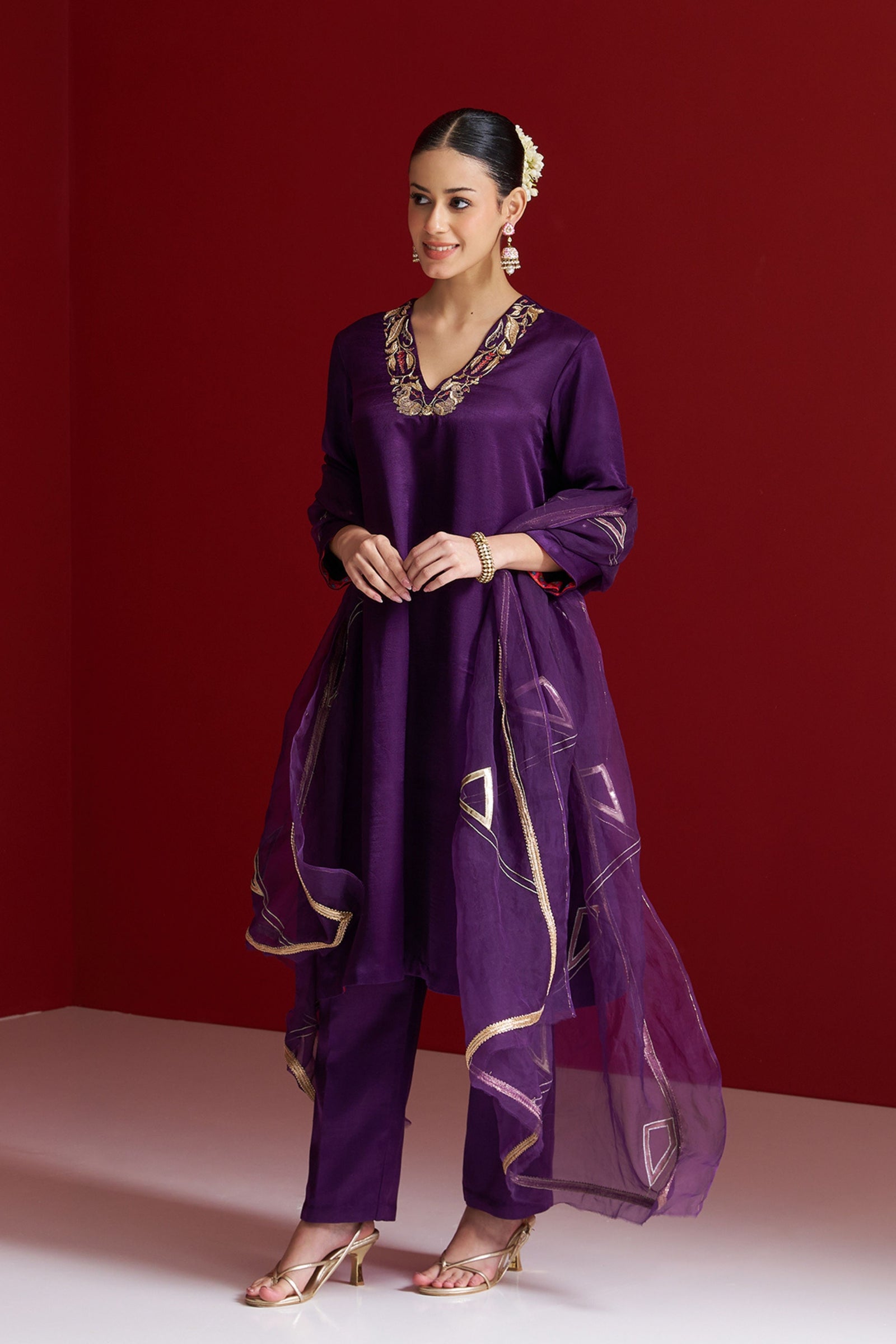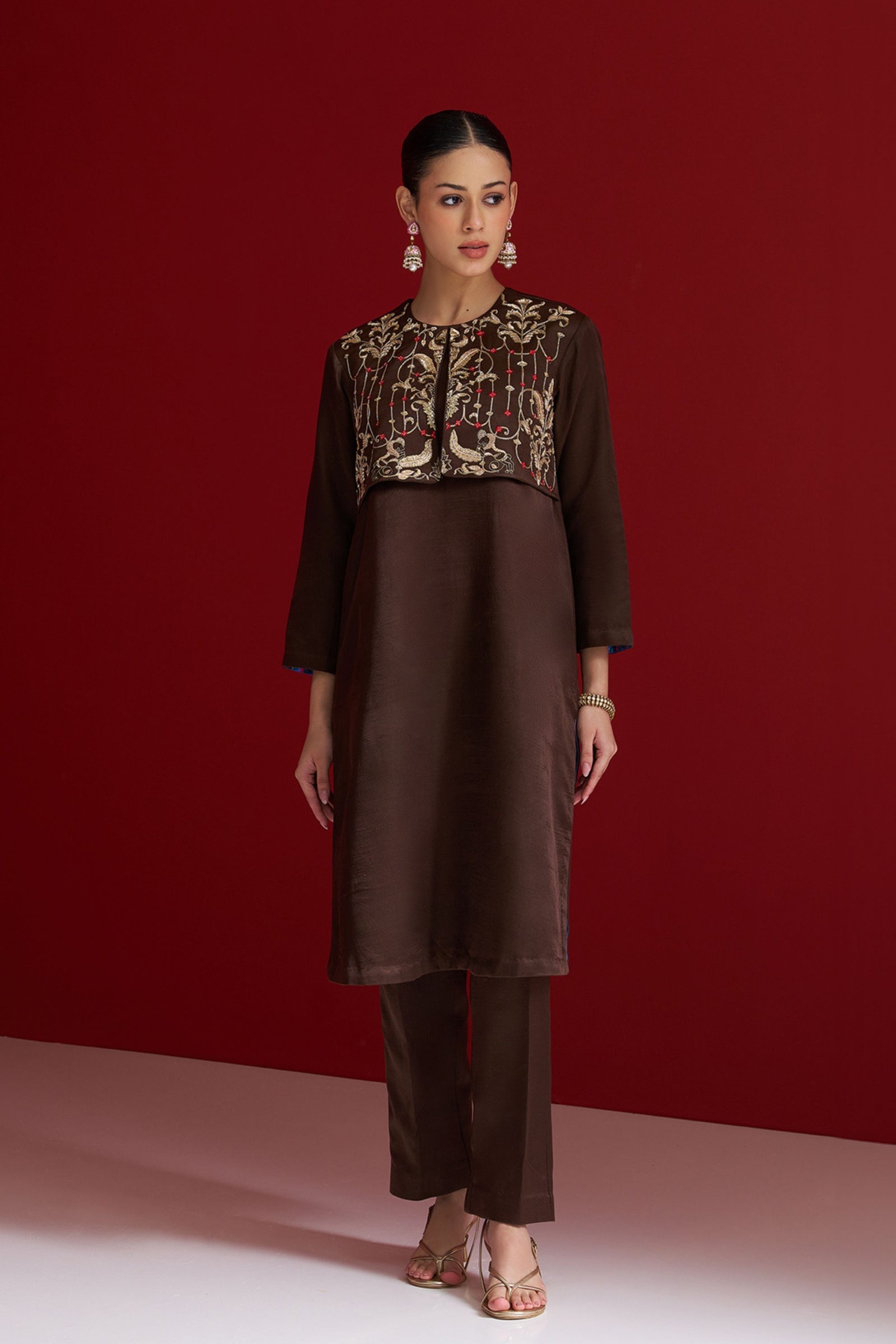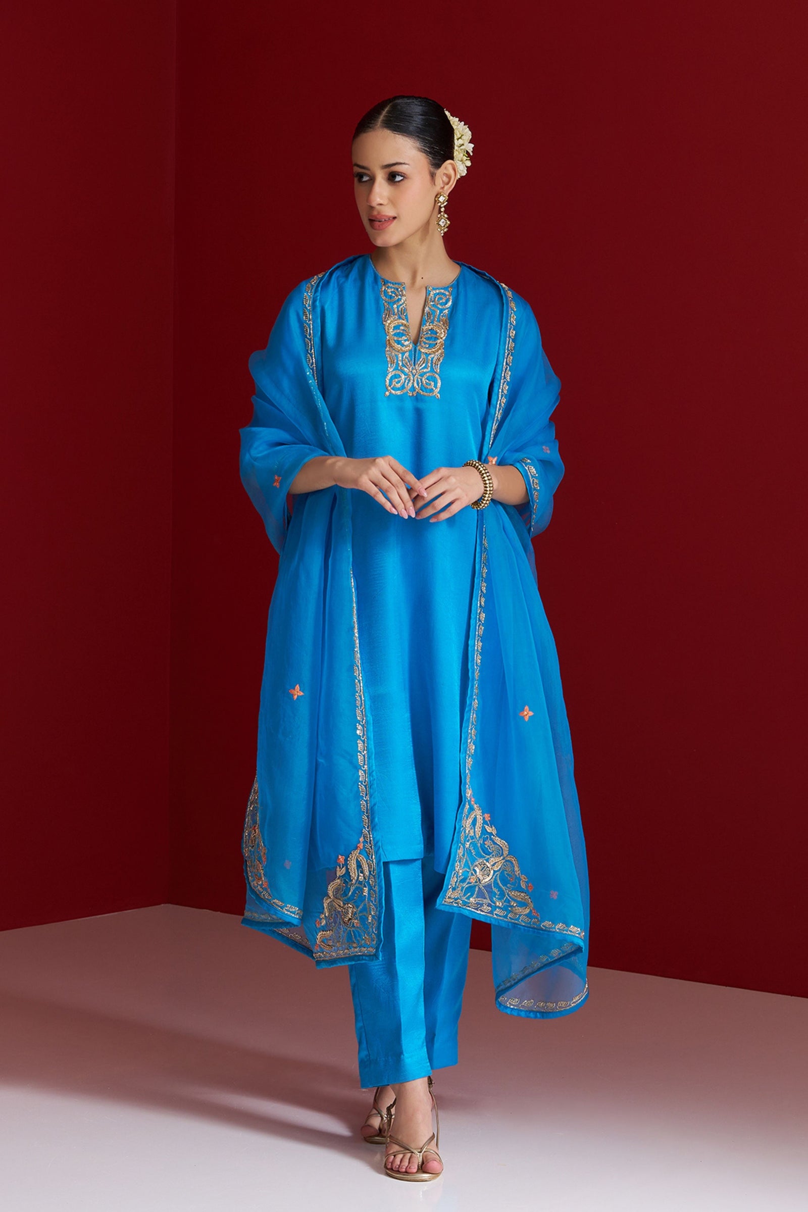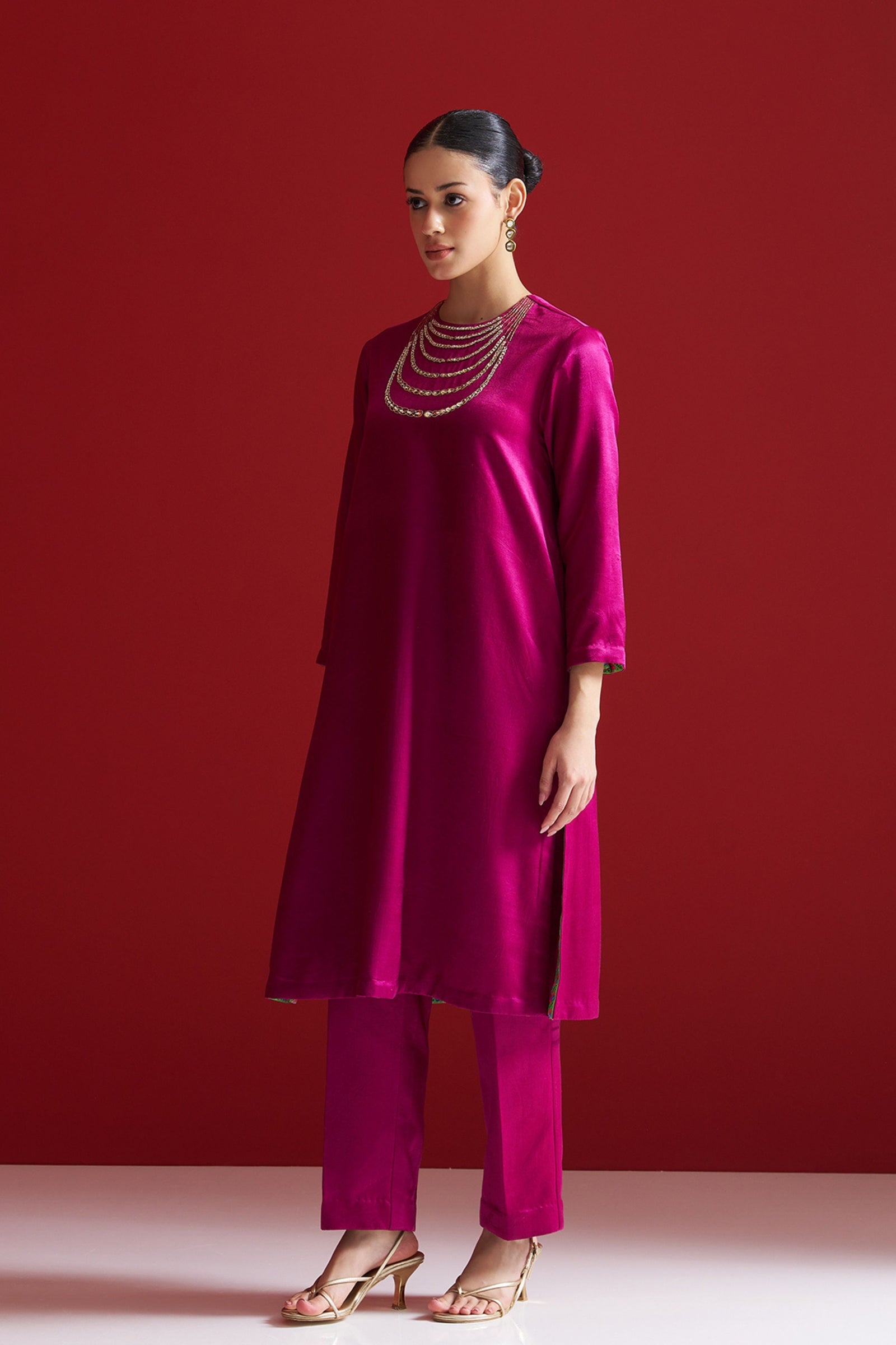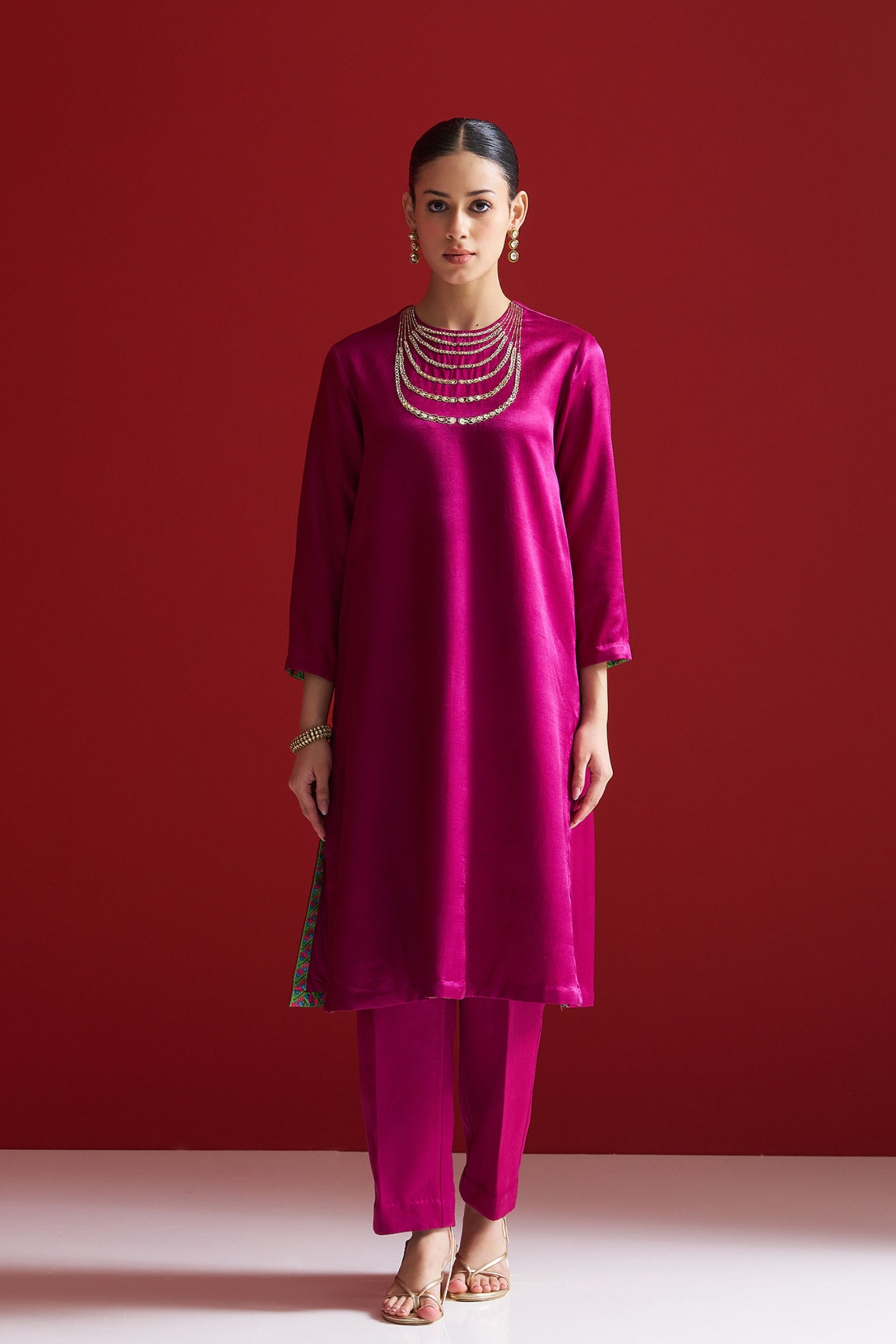 • This kurta set is a celebration of heritage artistry and timeless elegance. The neckline is adorned with intricate hand embroidery featuring dabka, cutdana, resham, and naqshi work, forming a striking yali motif that depicts duality of power and grace. It is paired with straight-fit pants crafted in gajji silk.