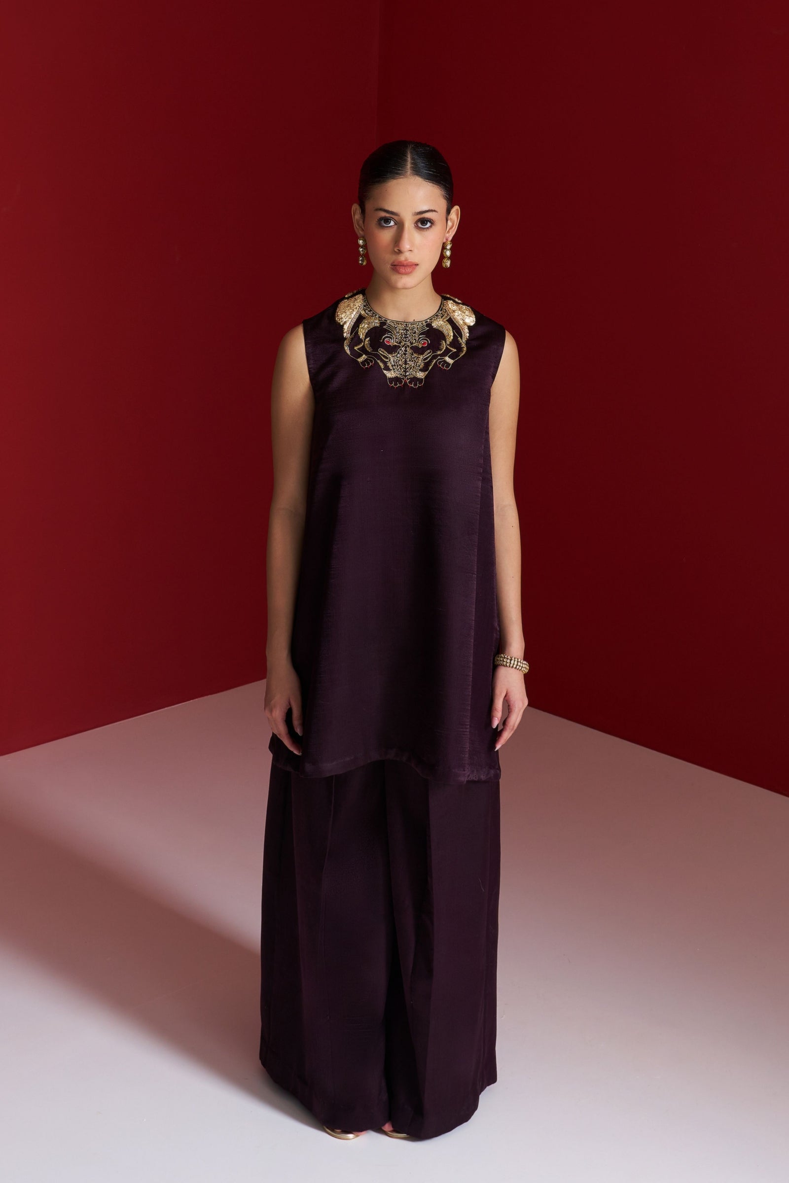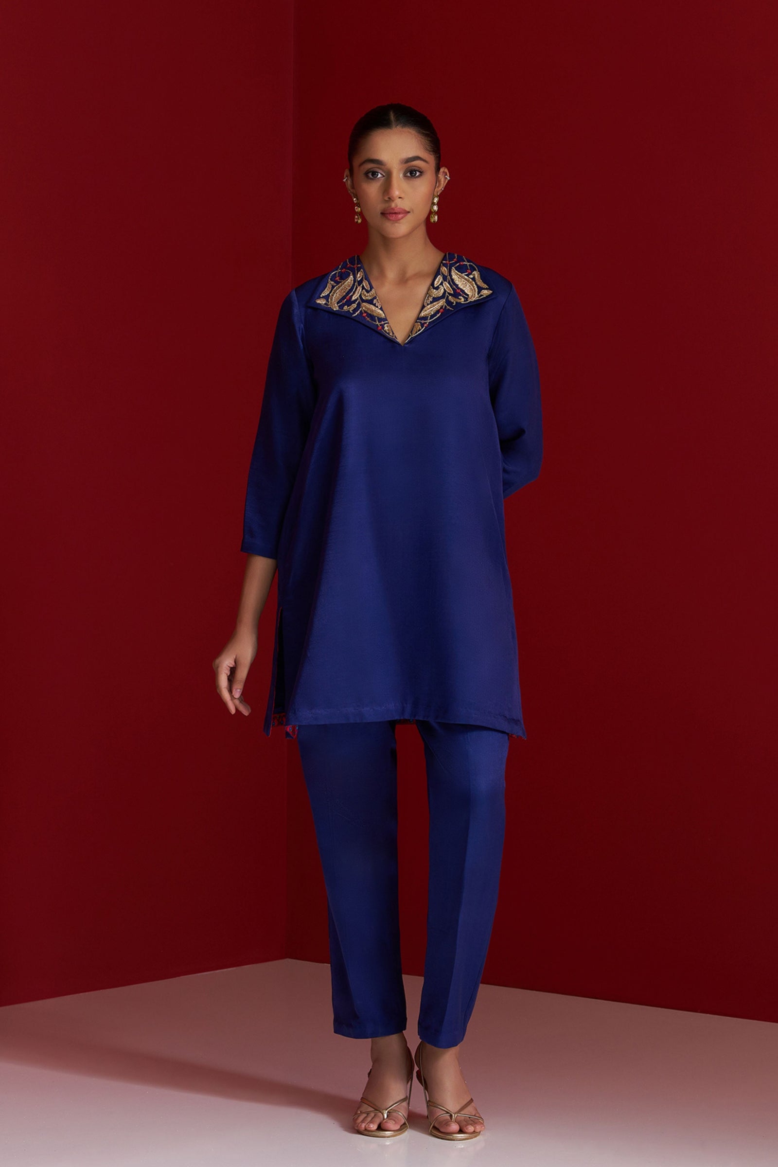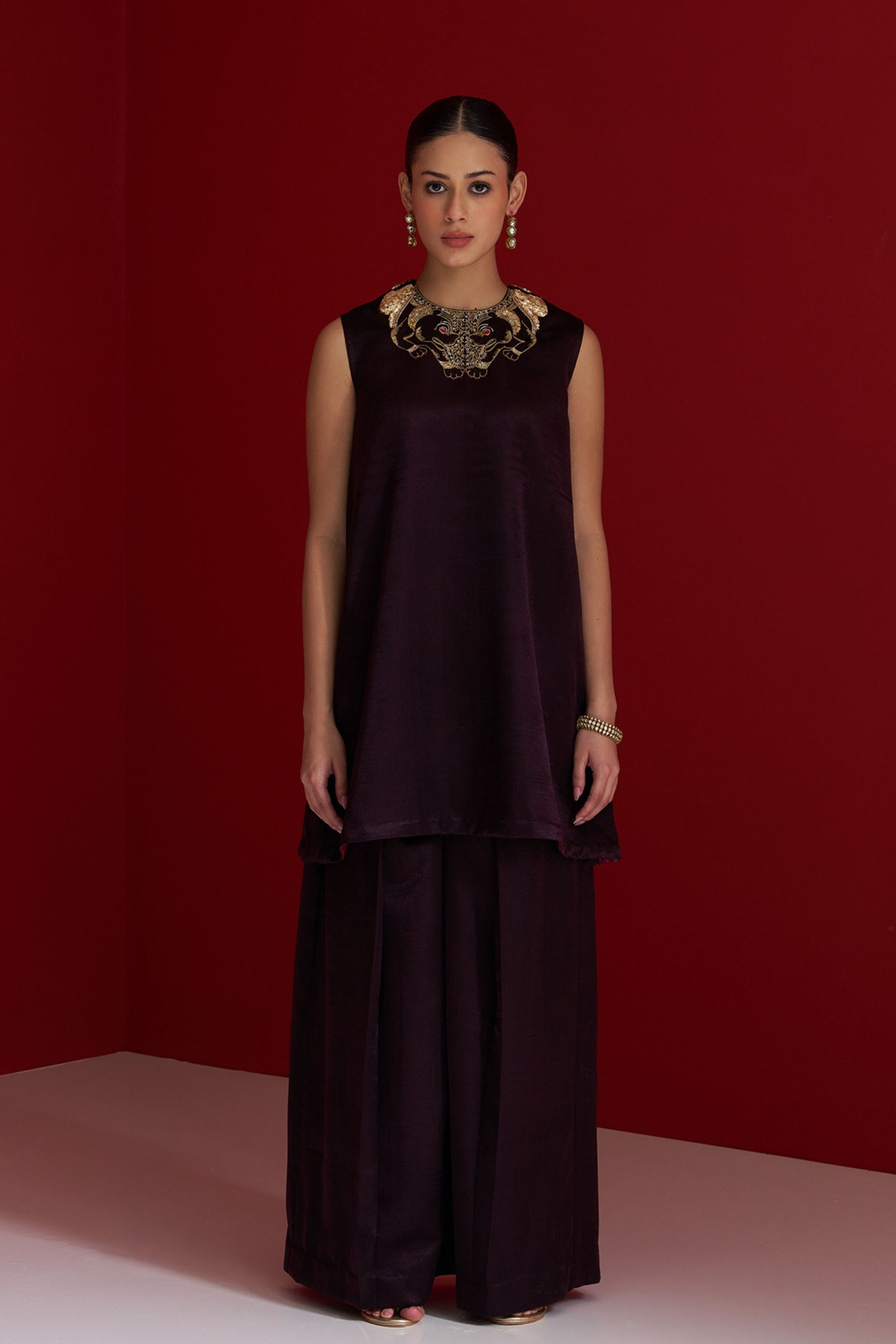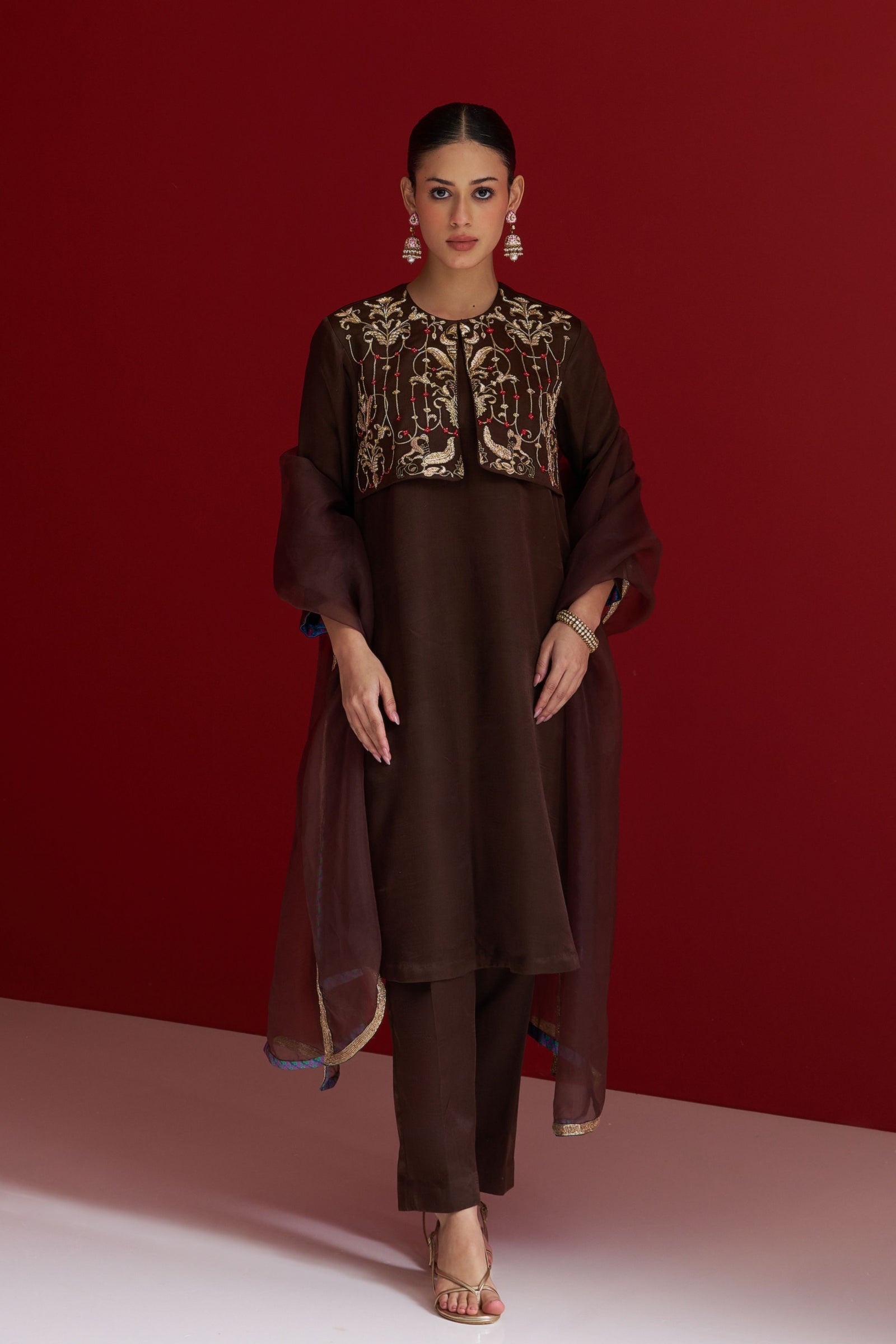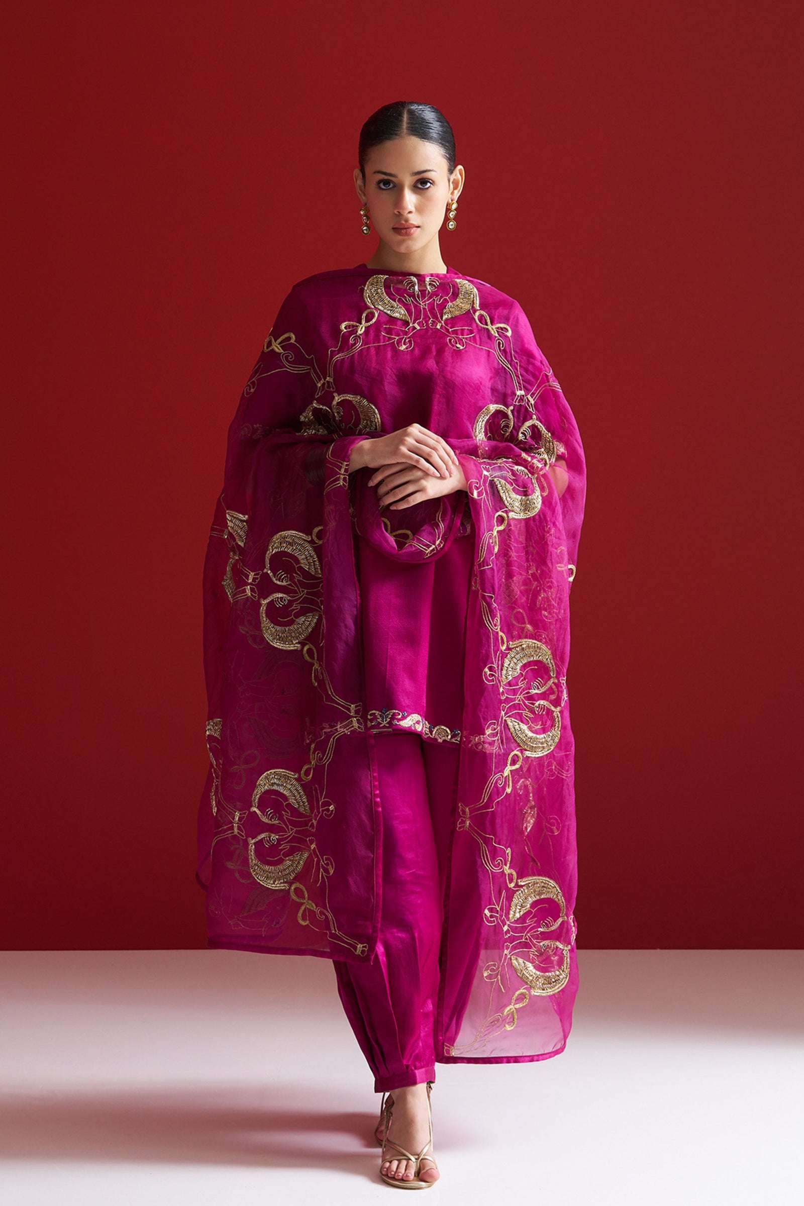 • This kurta set is a celebration of heritage artistry and timeless elegance. The neckline is adorned with intricate hand embroidery featuring dabka, cutdana, resham, and naqshi work, forming a striking yali motif that depicts duality of power and grace. It is paired with straight-fit pants crafted in gajji silk.