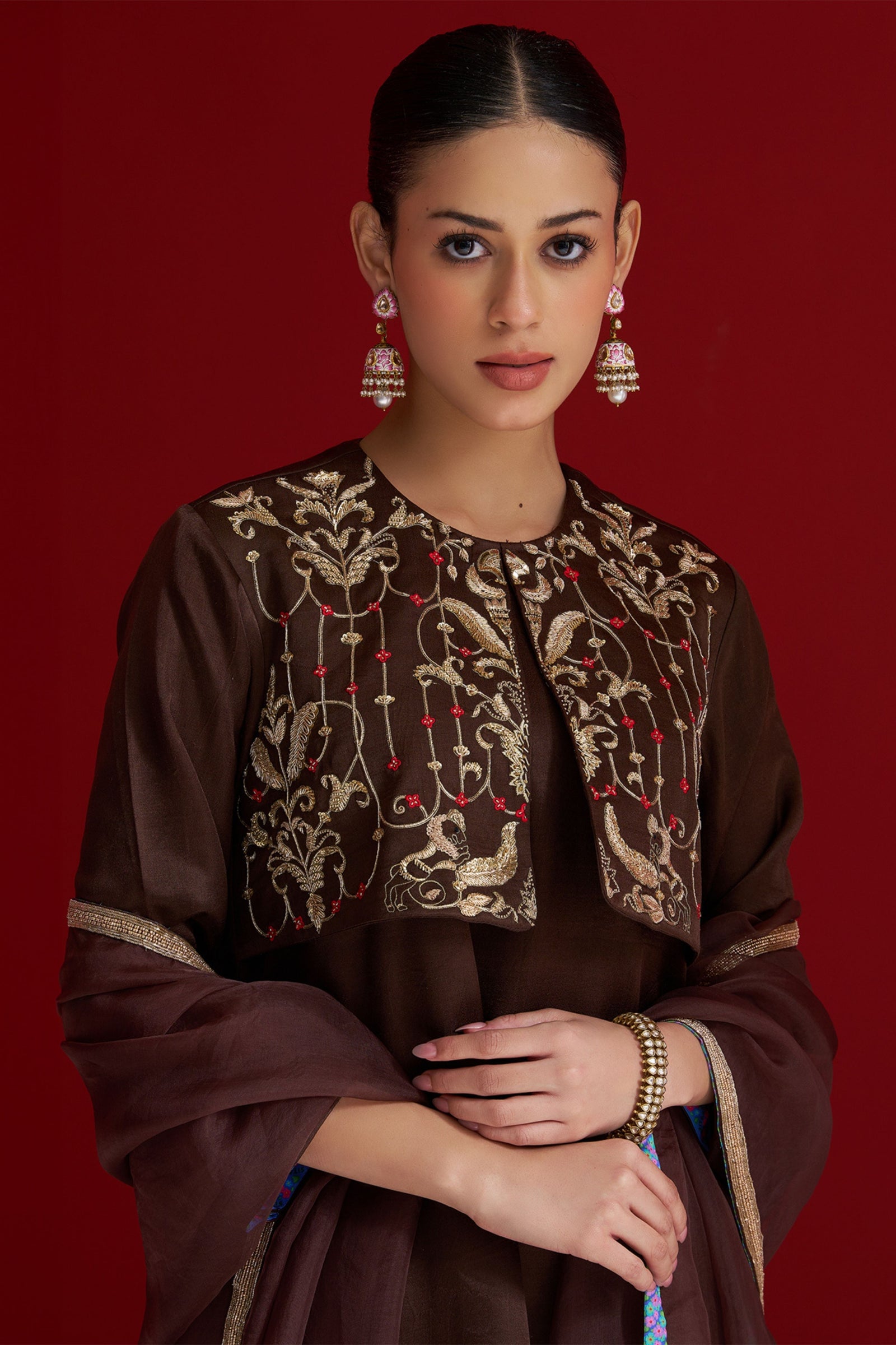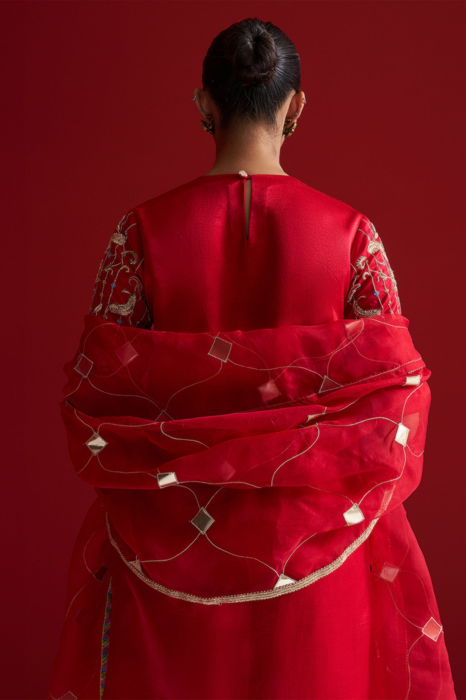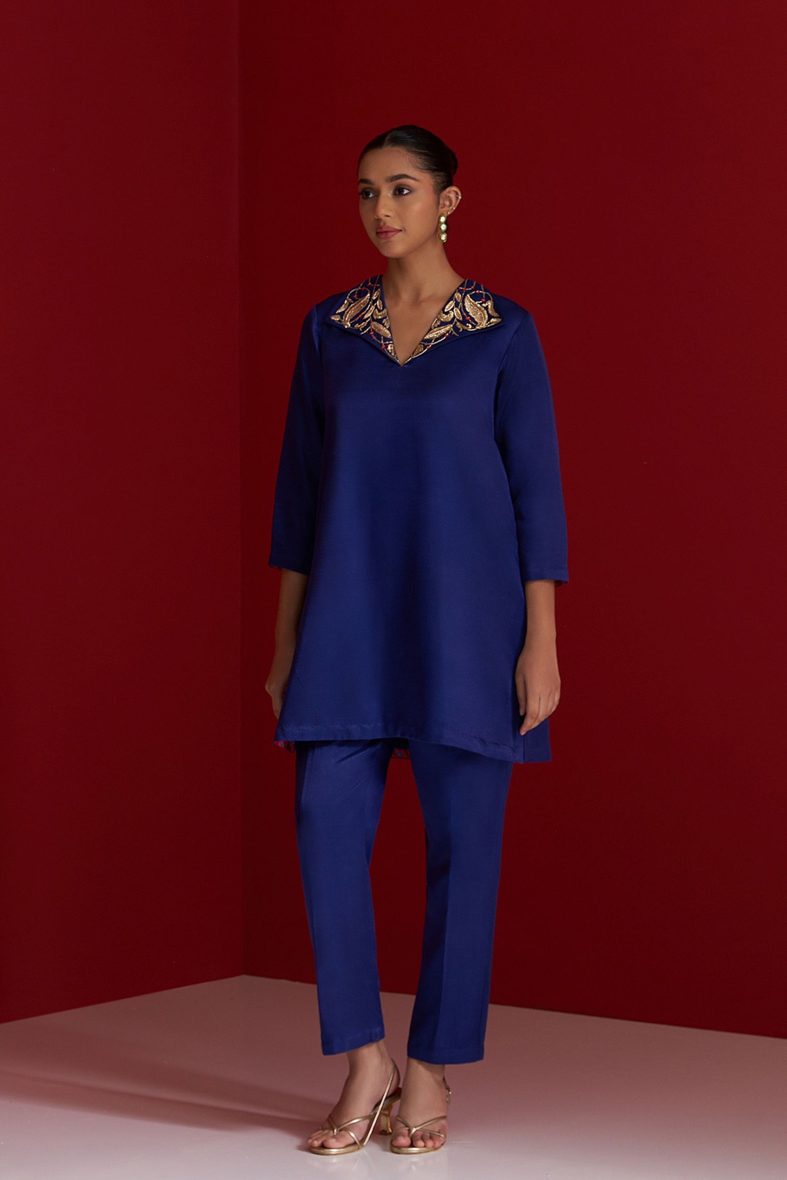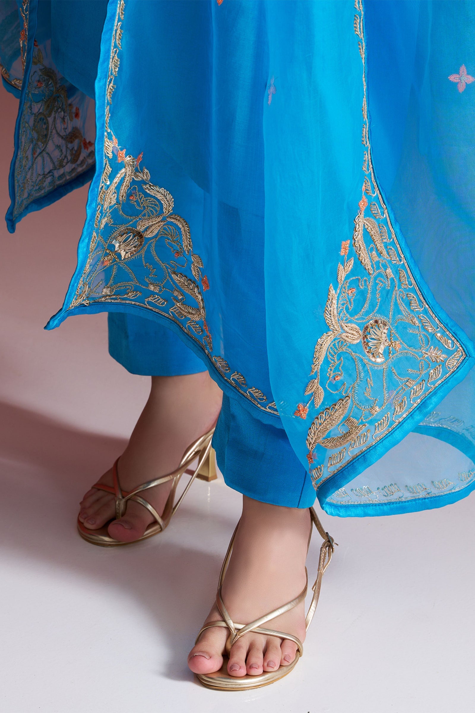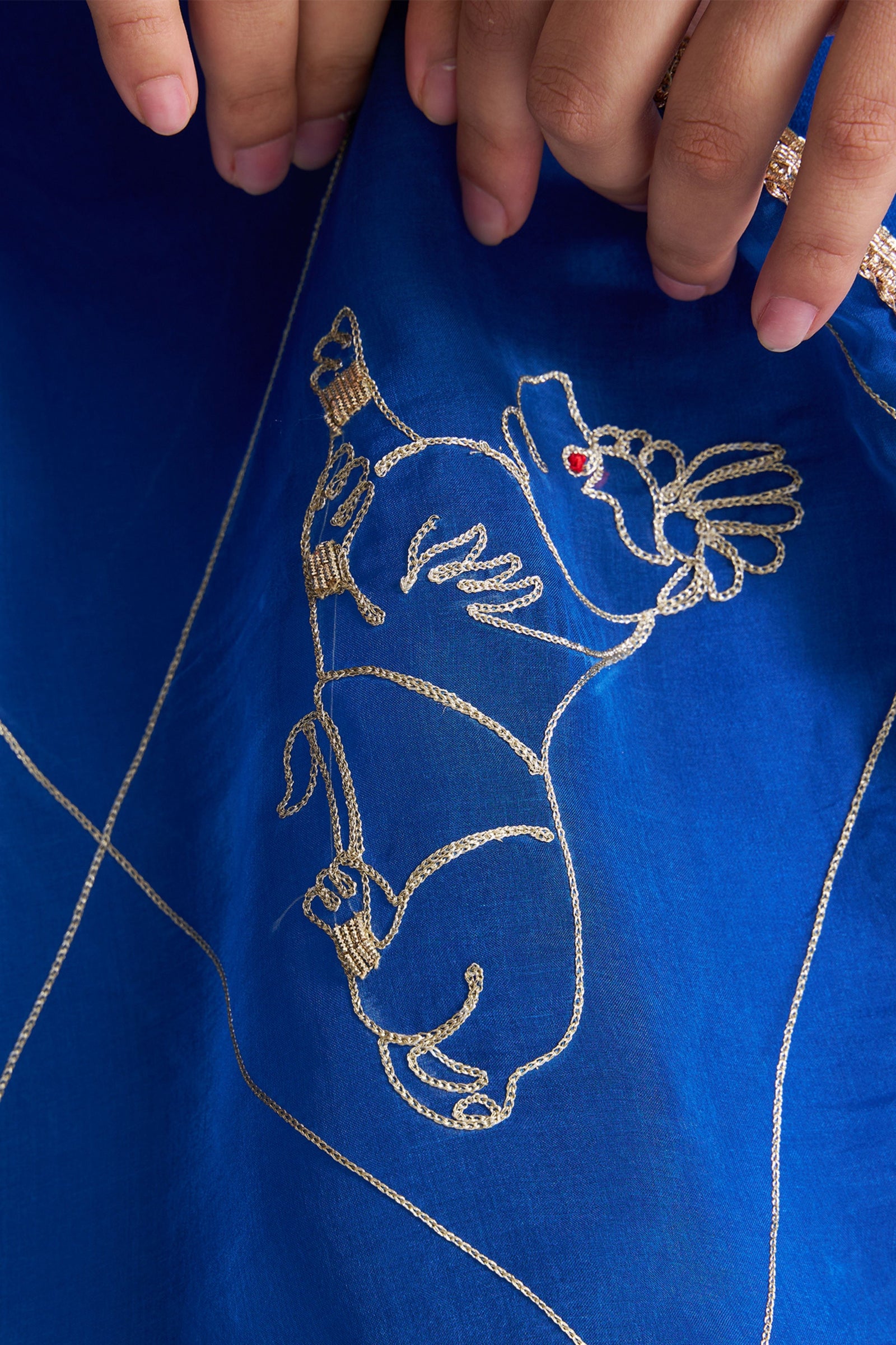 • This kurta set is a celebration of heritage artistry and timeless elegance. The neckline is adorned with intricate hand embroidery featuring dabka, cutdana, resham, and naqshi work, forming a striking yali motif that depicts duality of power and grace. It is paired with straight-fit pants crafted in gajji silk.