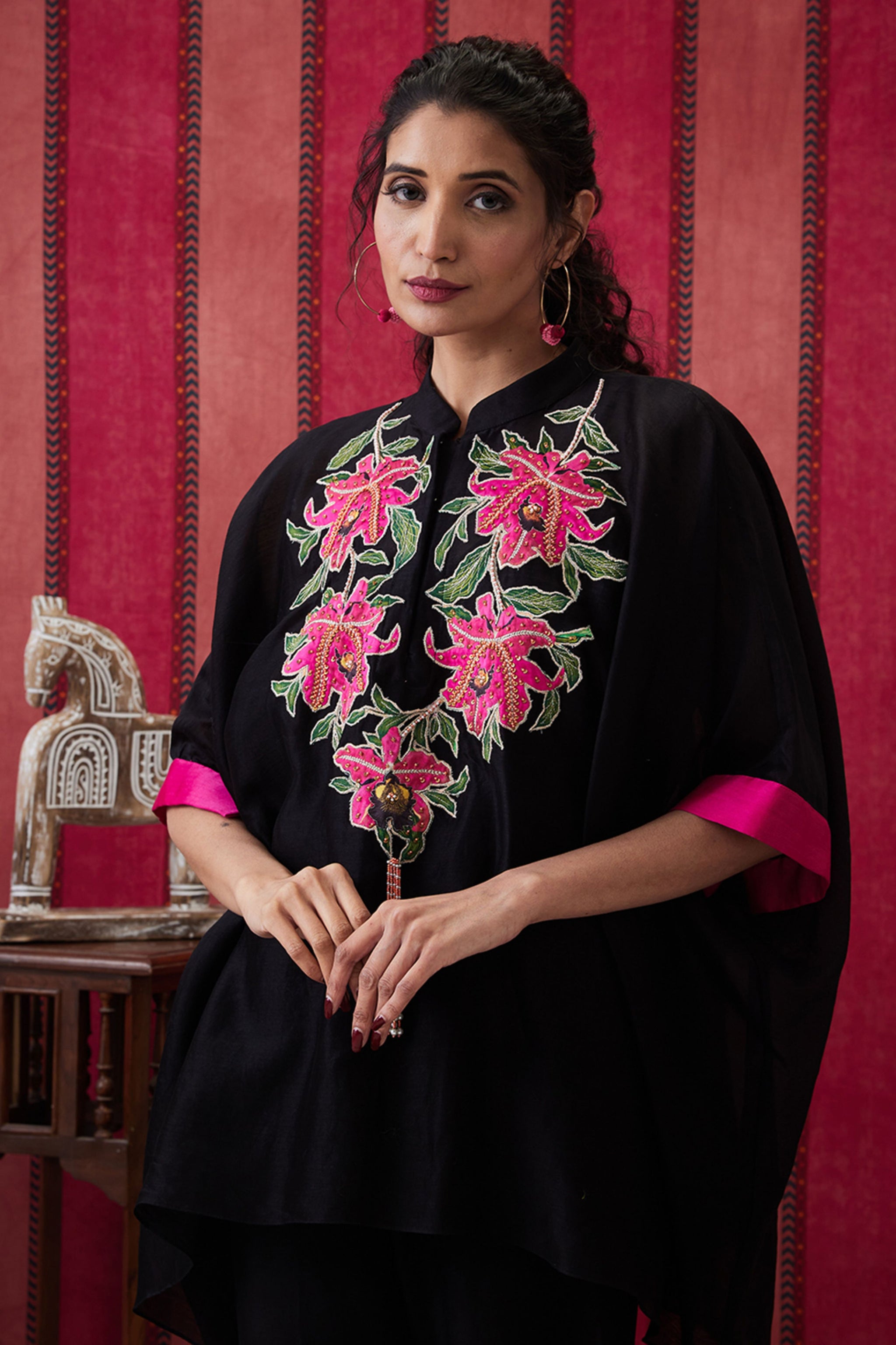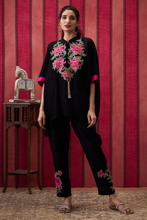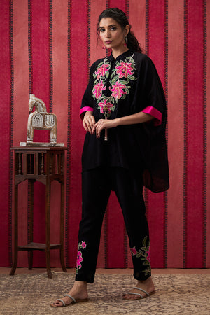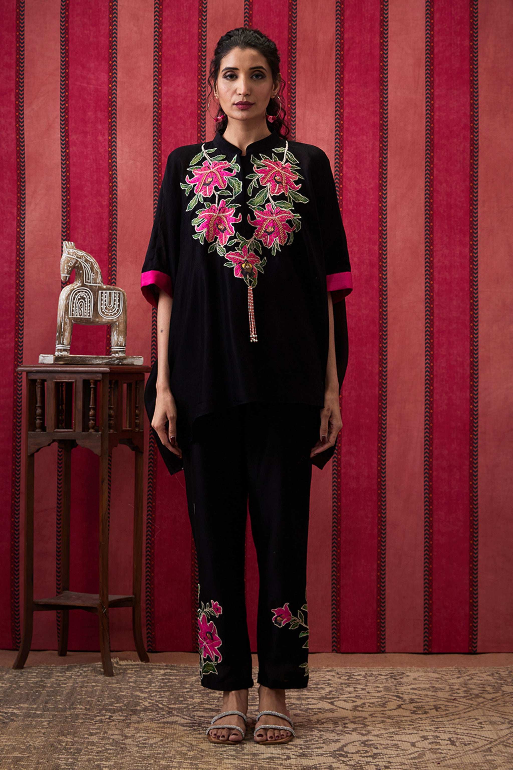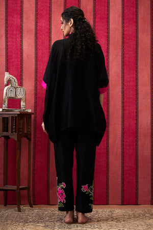 • Black Mehr Applique Kimono Top With Pants In Chanderi.