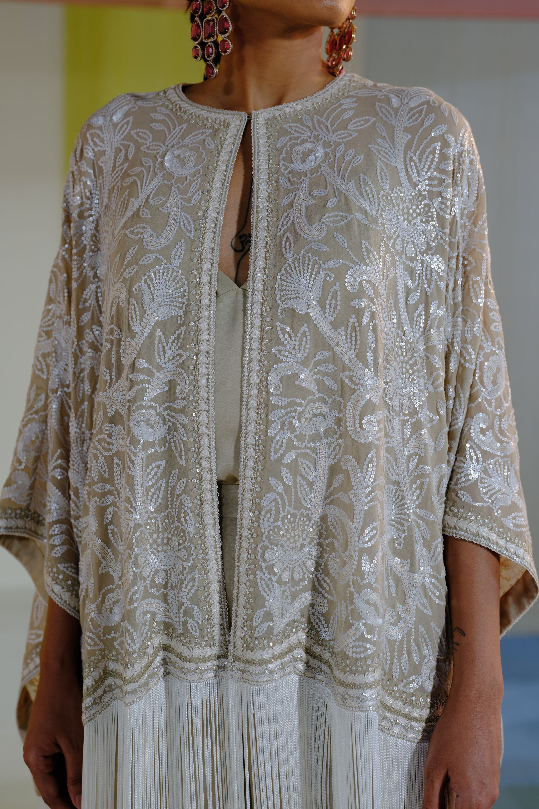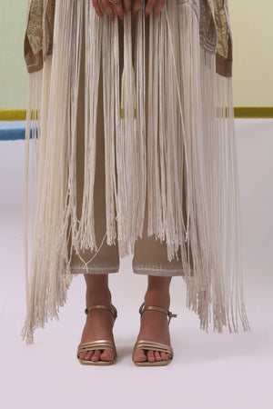 • Experience timeless sophistication with this beige cape set, crafted from luxurious pure silk georgette. The cape features a touch neck, front open design, and elegant off-white satin silk fringes. Intricate hand embroidery in off-white silk thread and dull gold sequins adorn the cape, creating a refined charm. Paired with matching straight-fit pants enhanced with coordinating embroidery along the borders, this set ensures a coordinated look. A satin slip is included for comfort and a smooth silhouette.