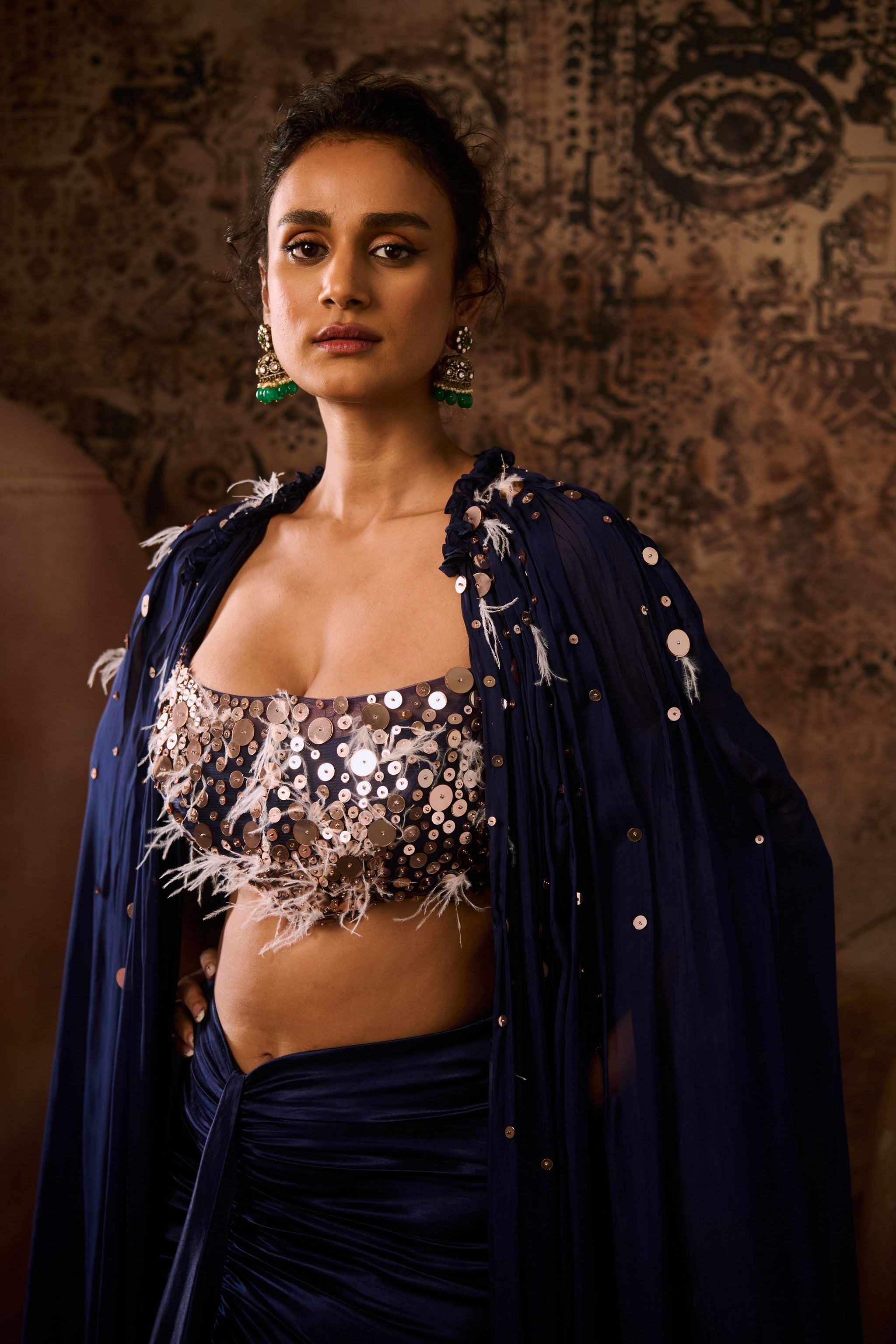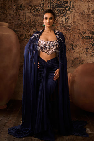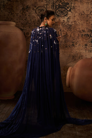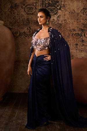 • Navy blue embroidered corset with embroidered cape with drape skirt