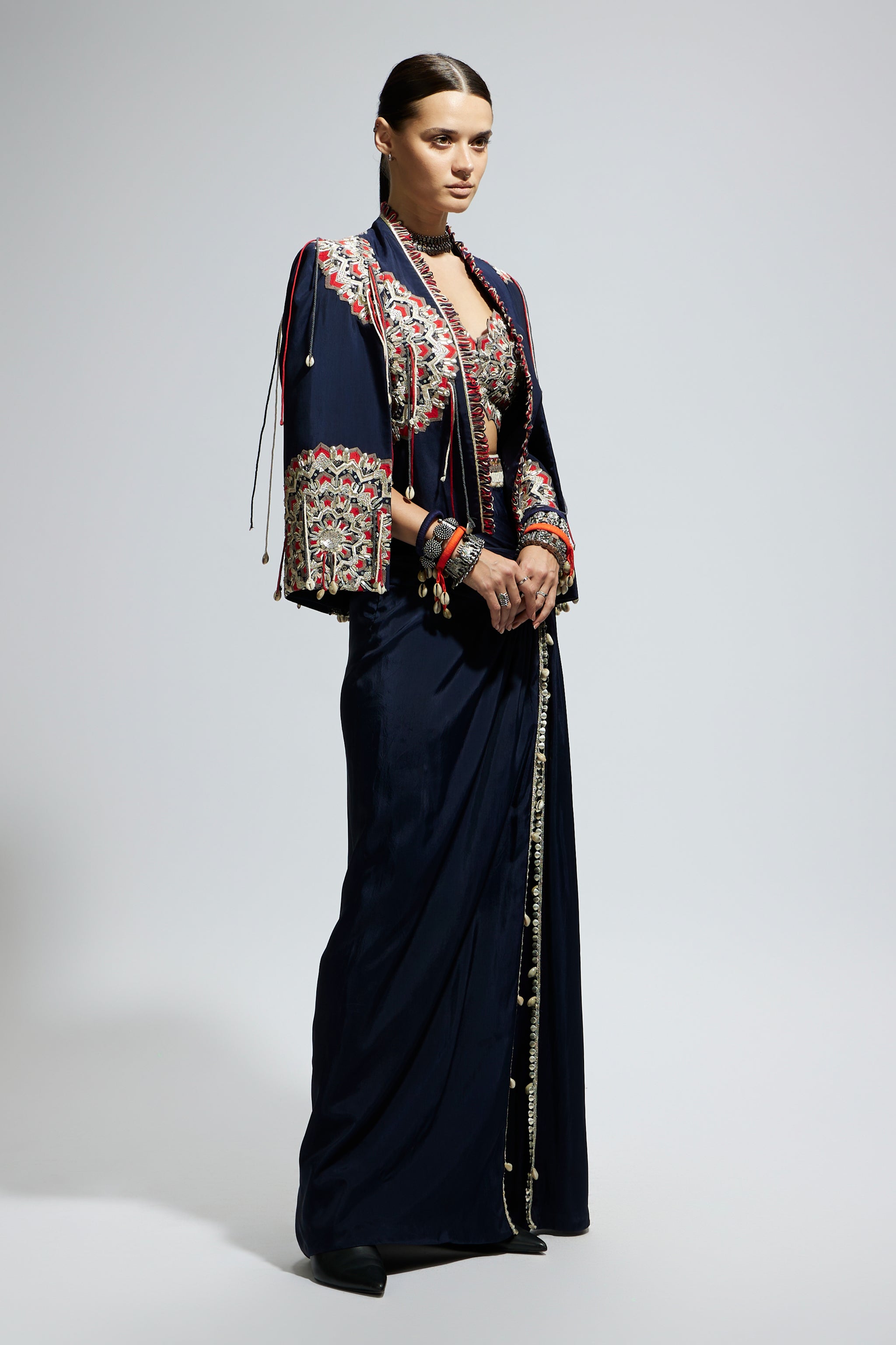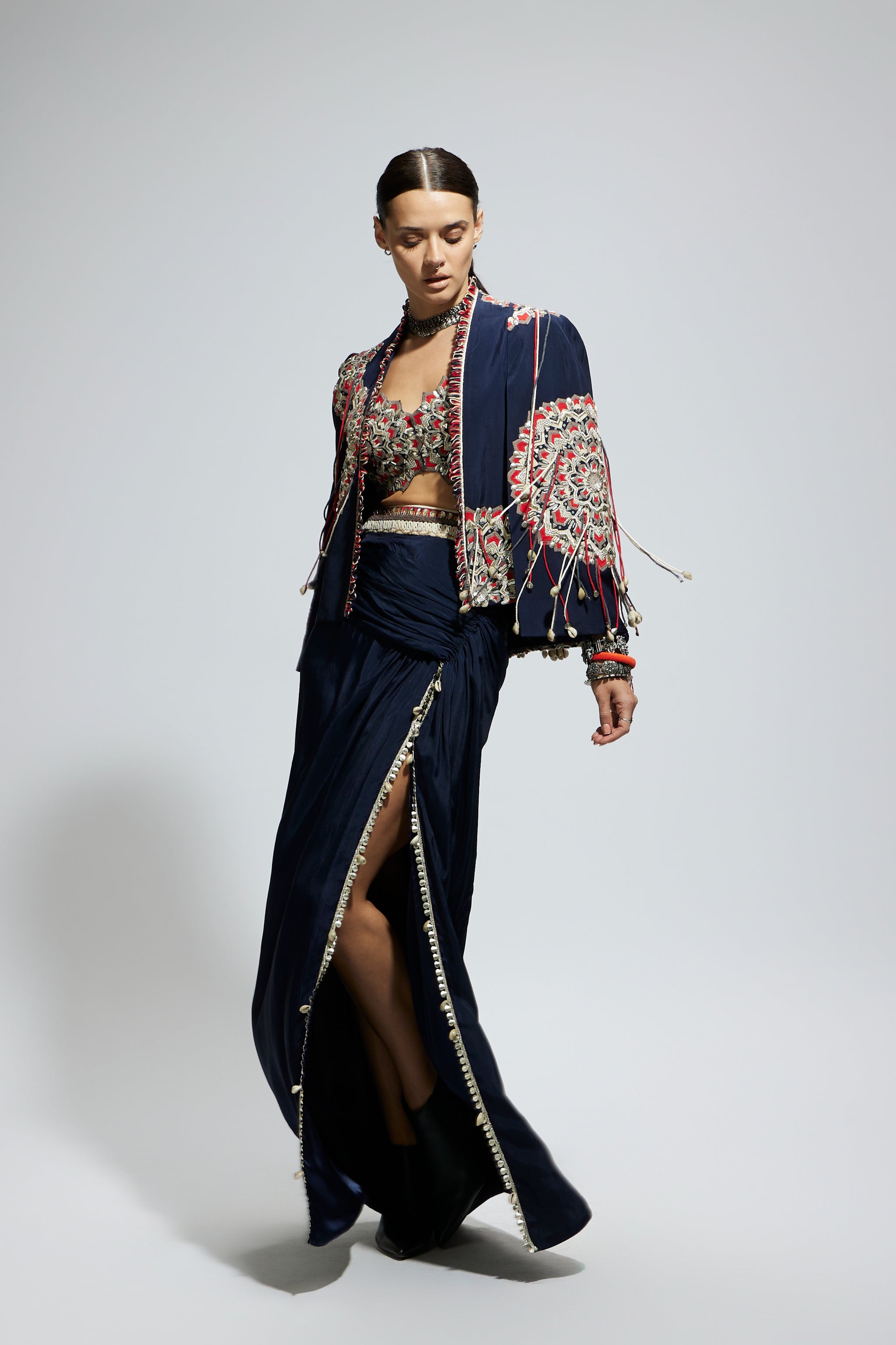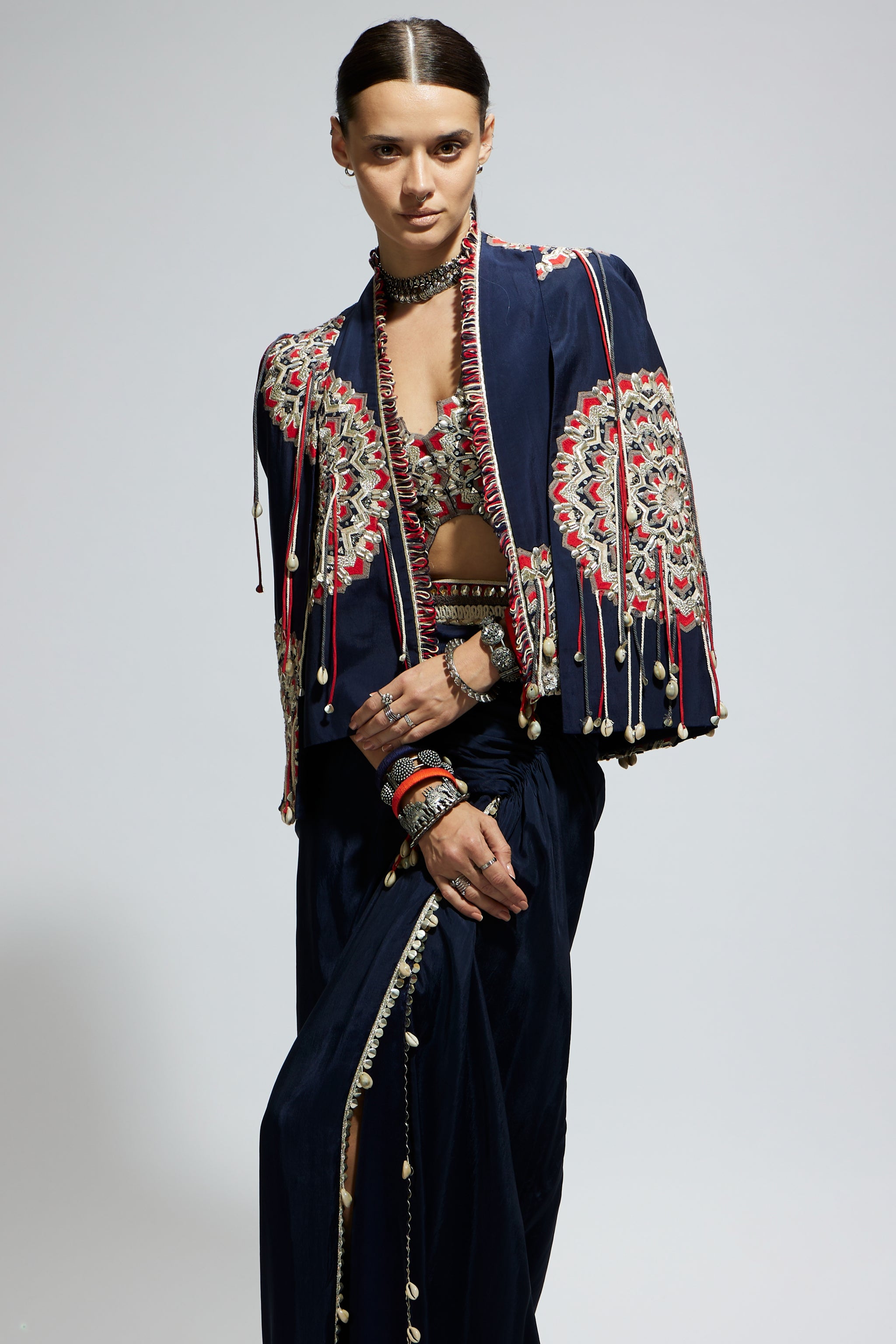 • Blue asymetric threadwork cape jacket paired with an embellished bustier and high slit skirt