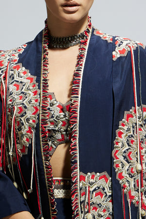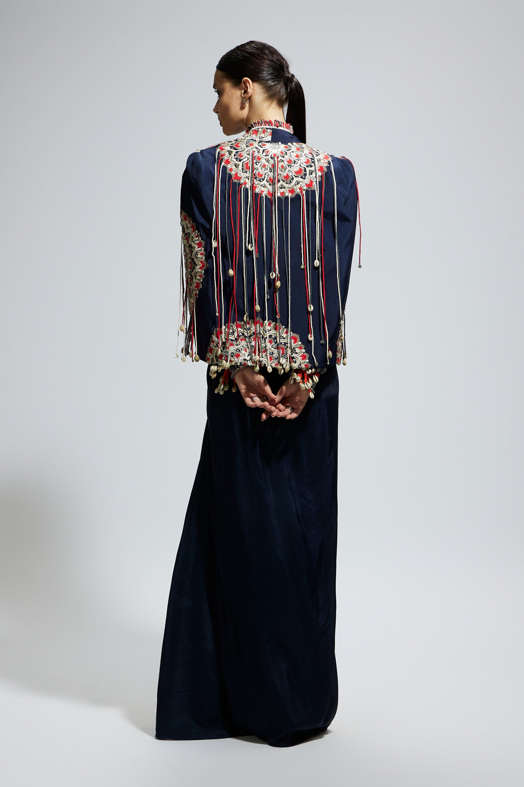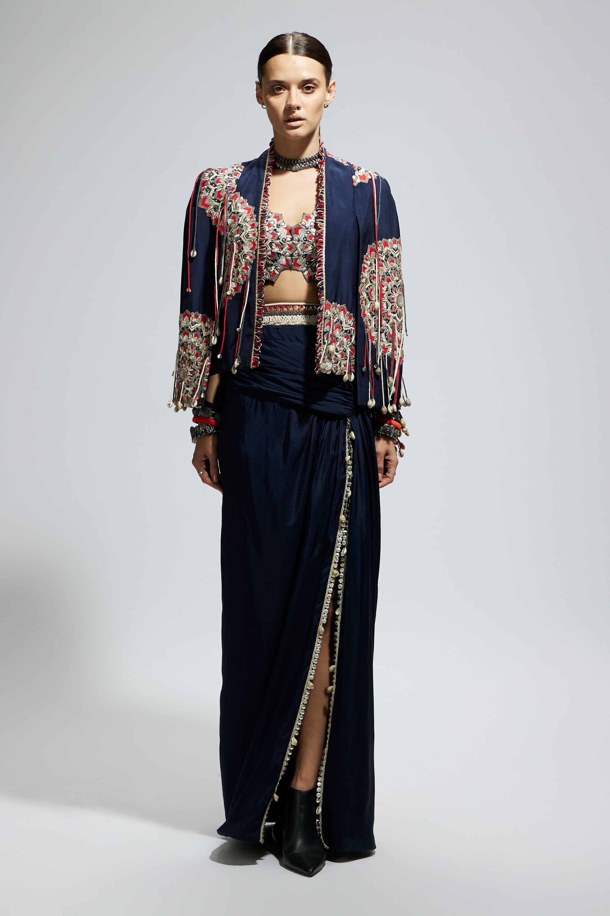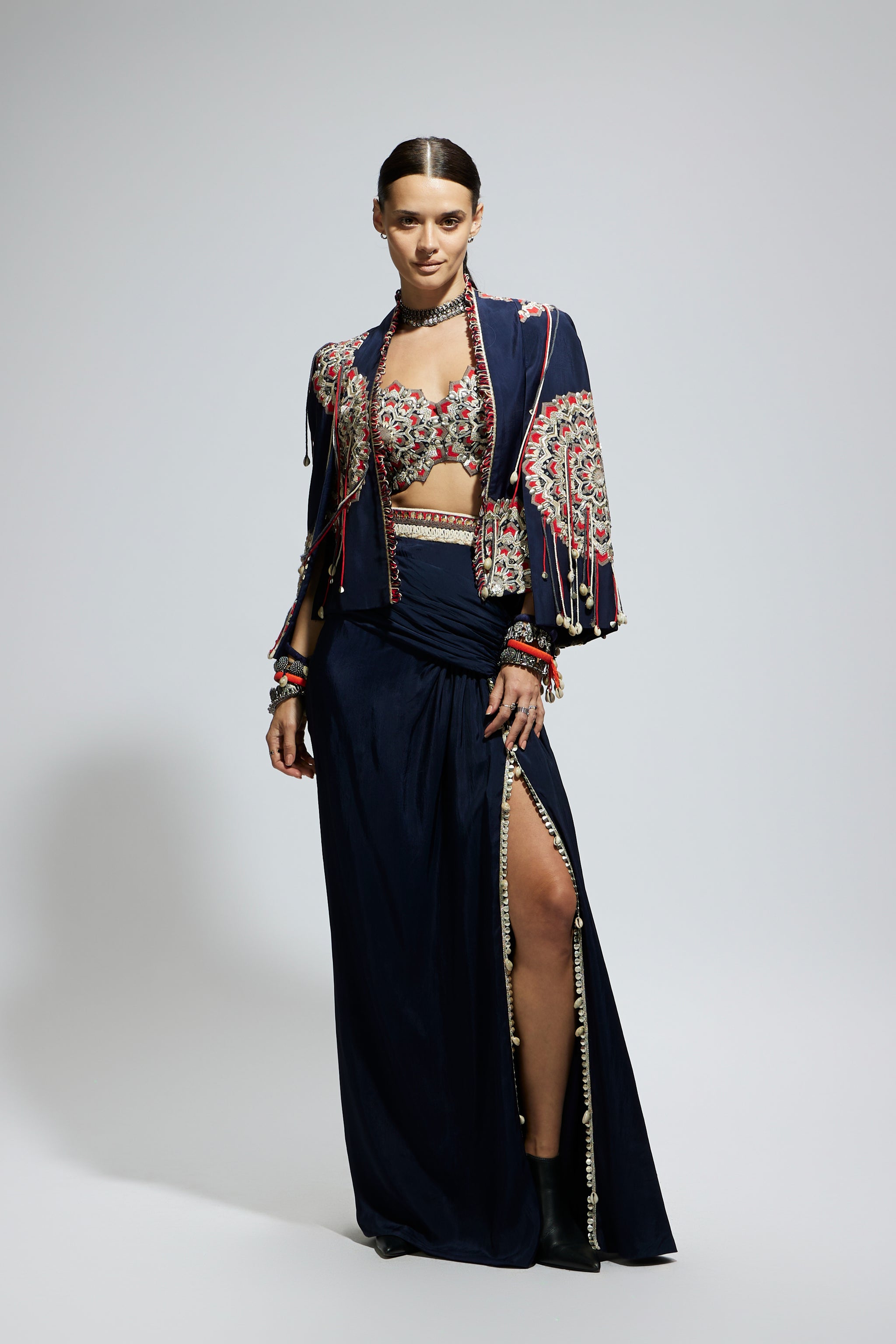 • Blue asymetric threadwork cape jacket paired with an embellished bustier and high slit skirt