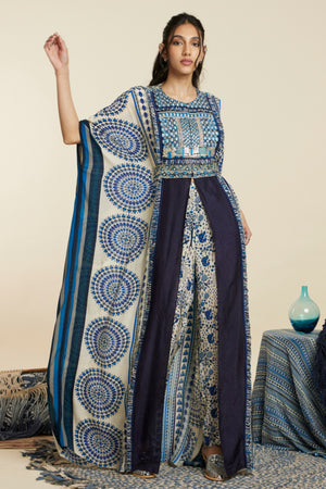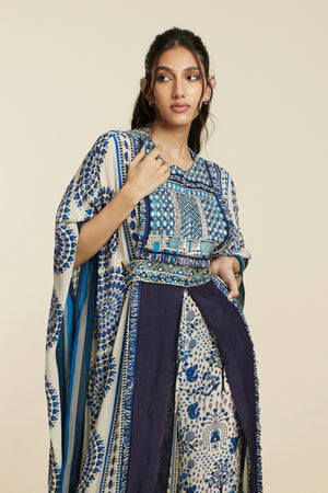 • Blue butta stripe embellished yoke front open kaftan with belt and pants