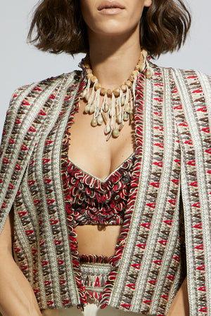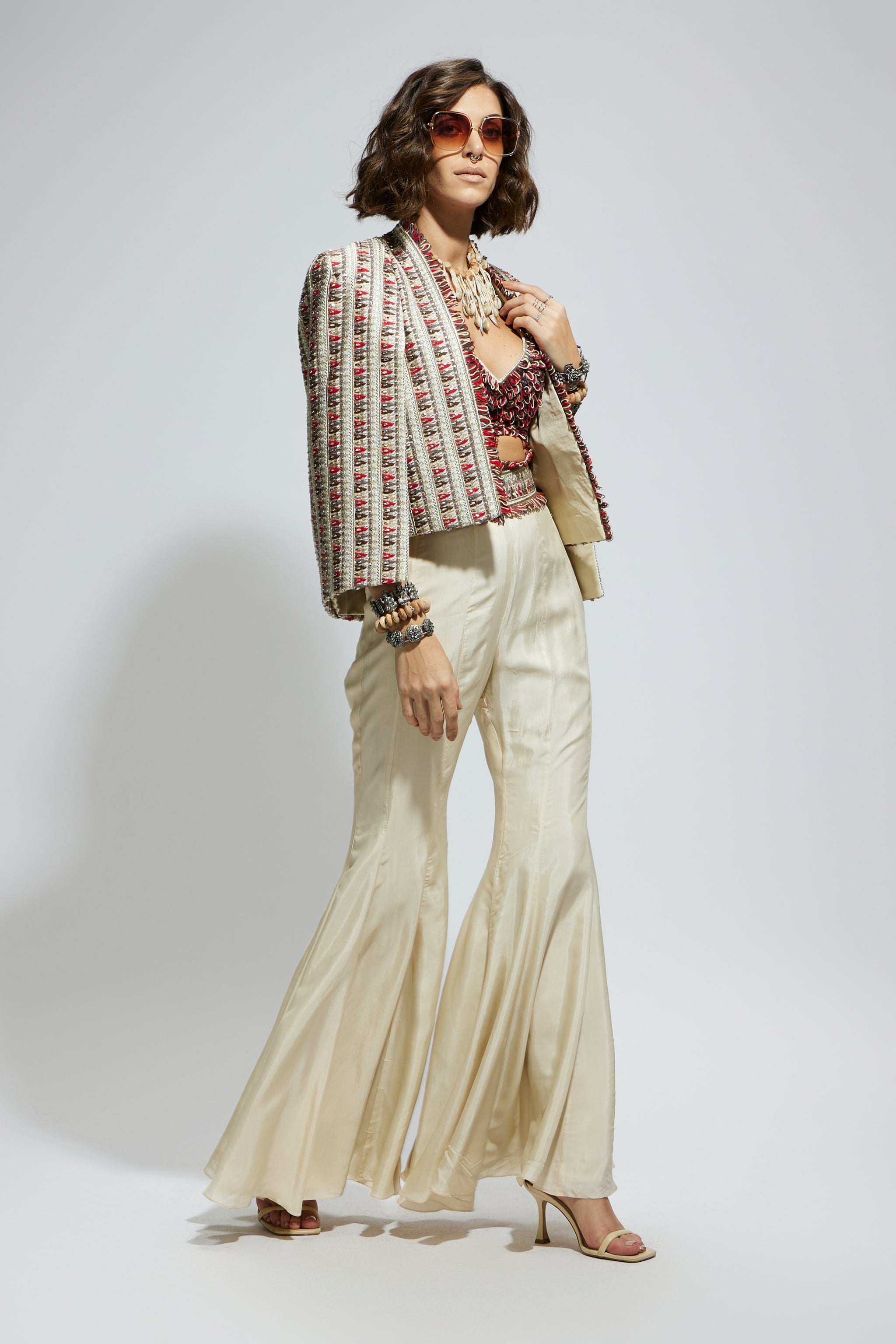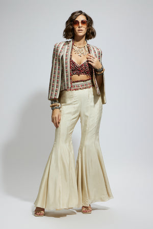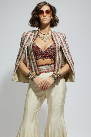 • Ivory embellished cape jacket paired with textured bustier and sharara pants