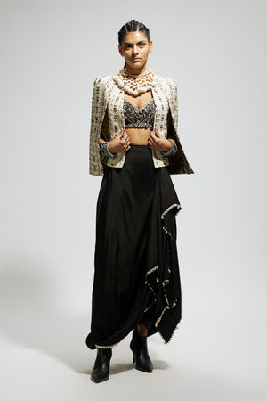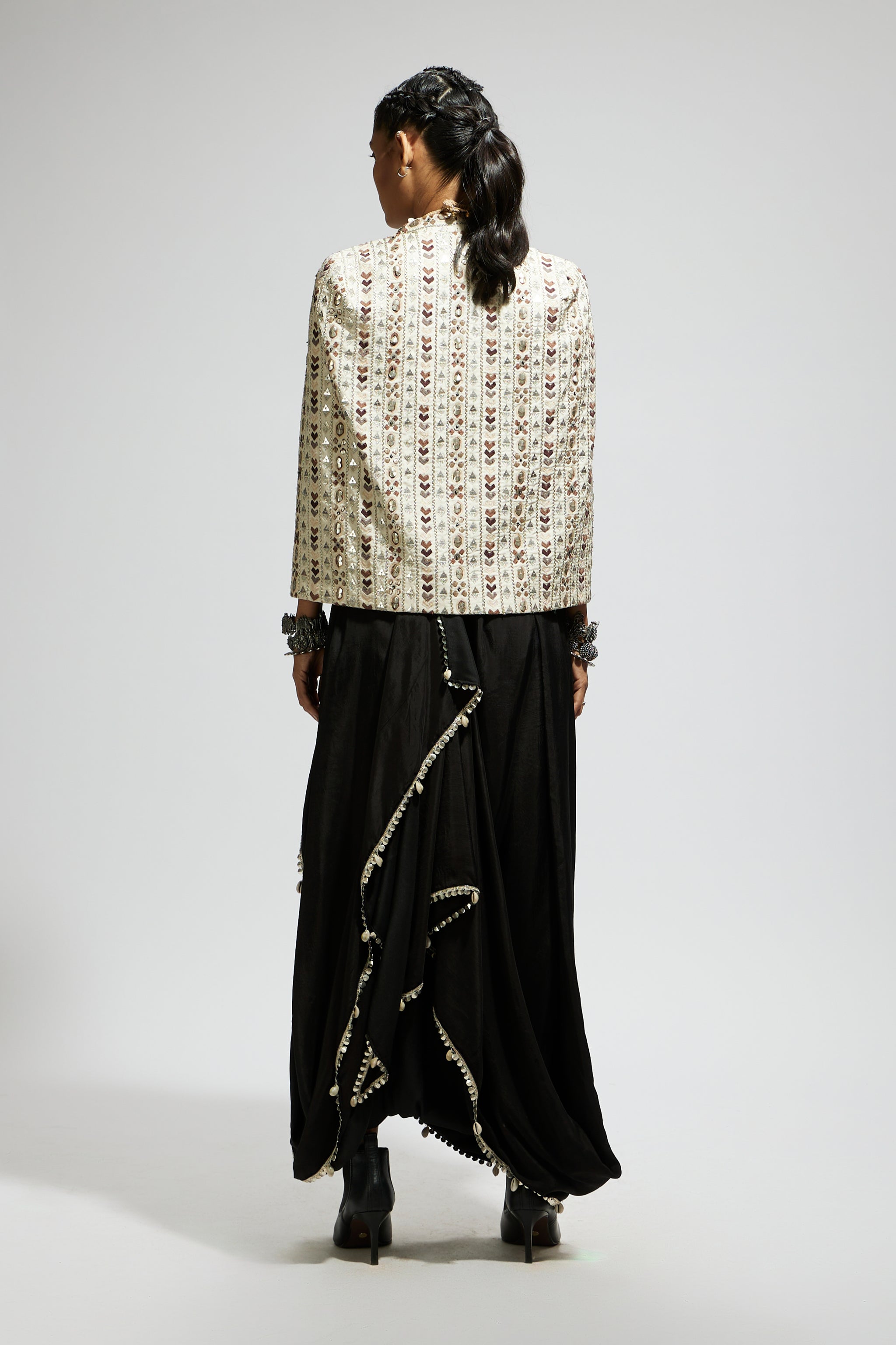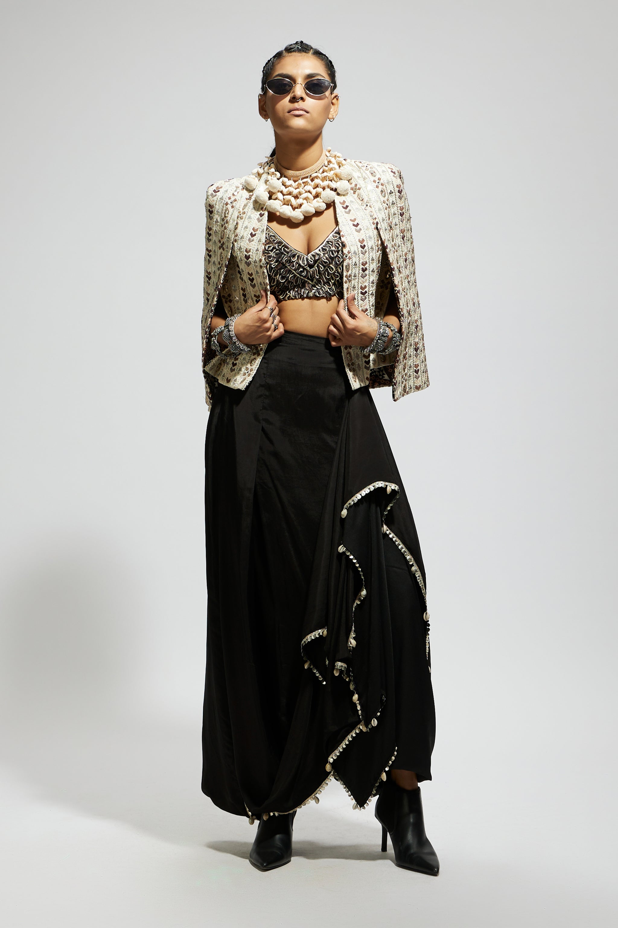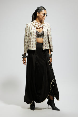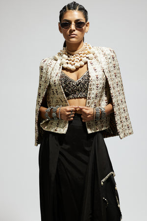 • Ivory embellished cape jacket paired with textured bustier and drape skirt