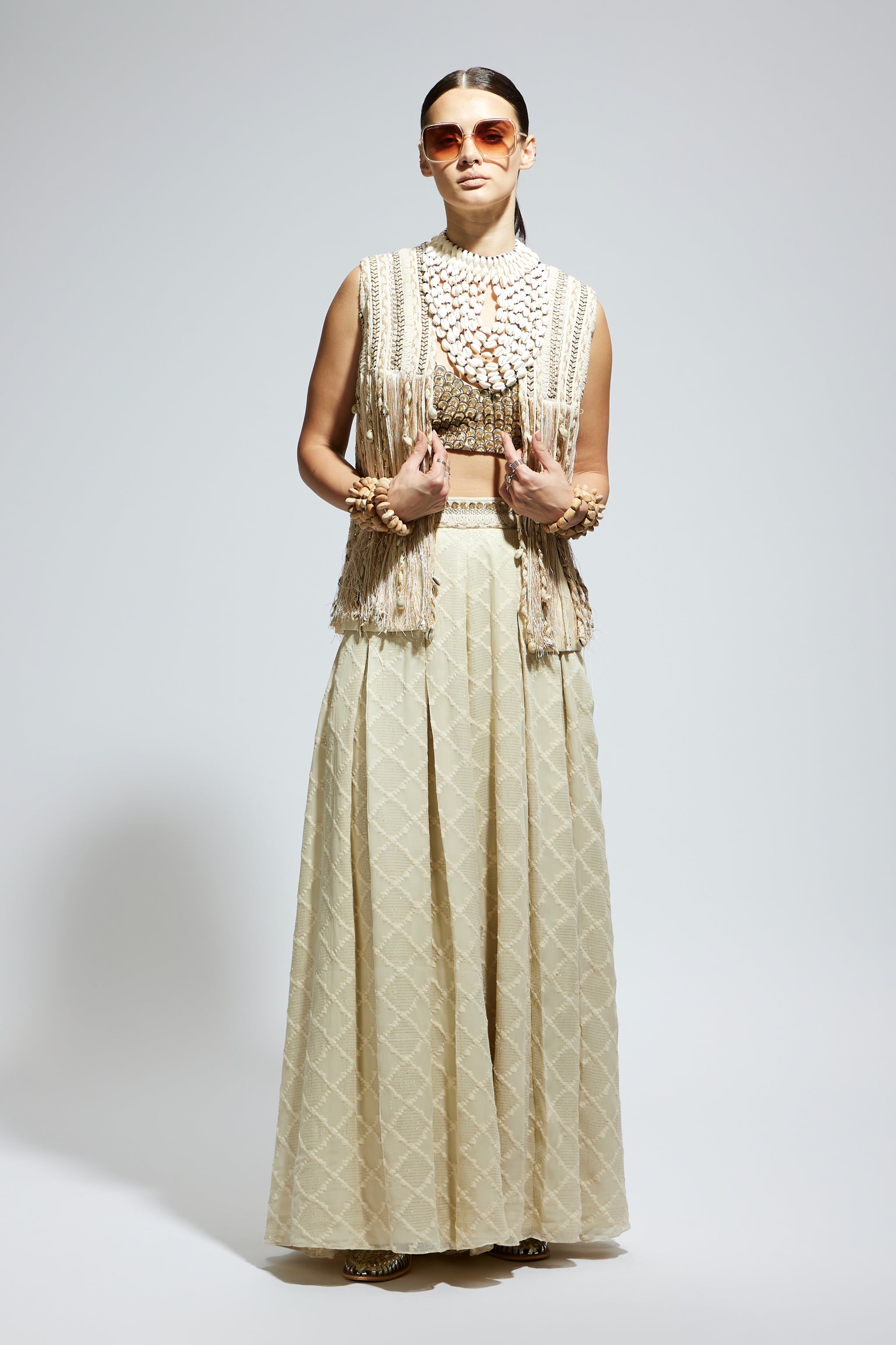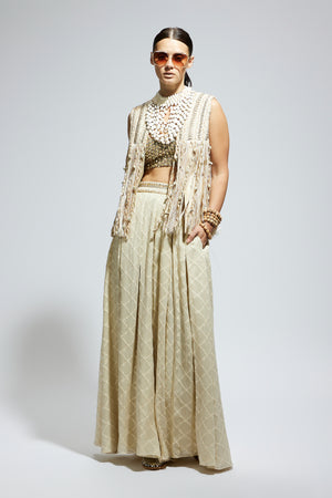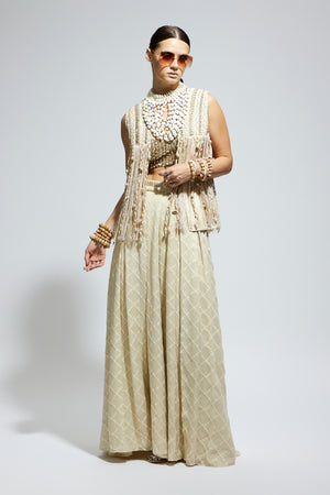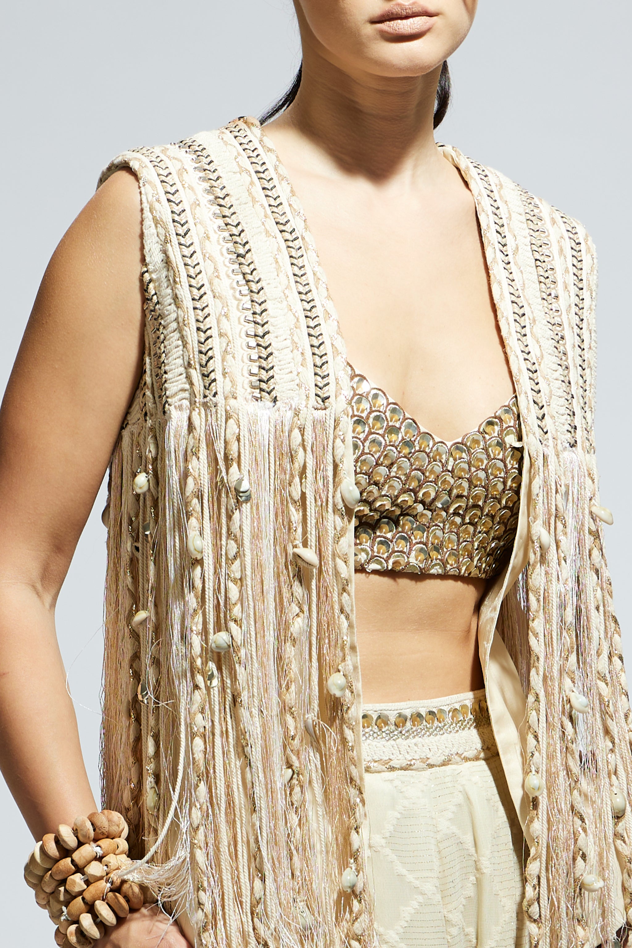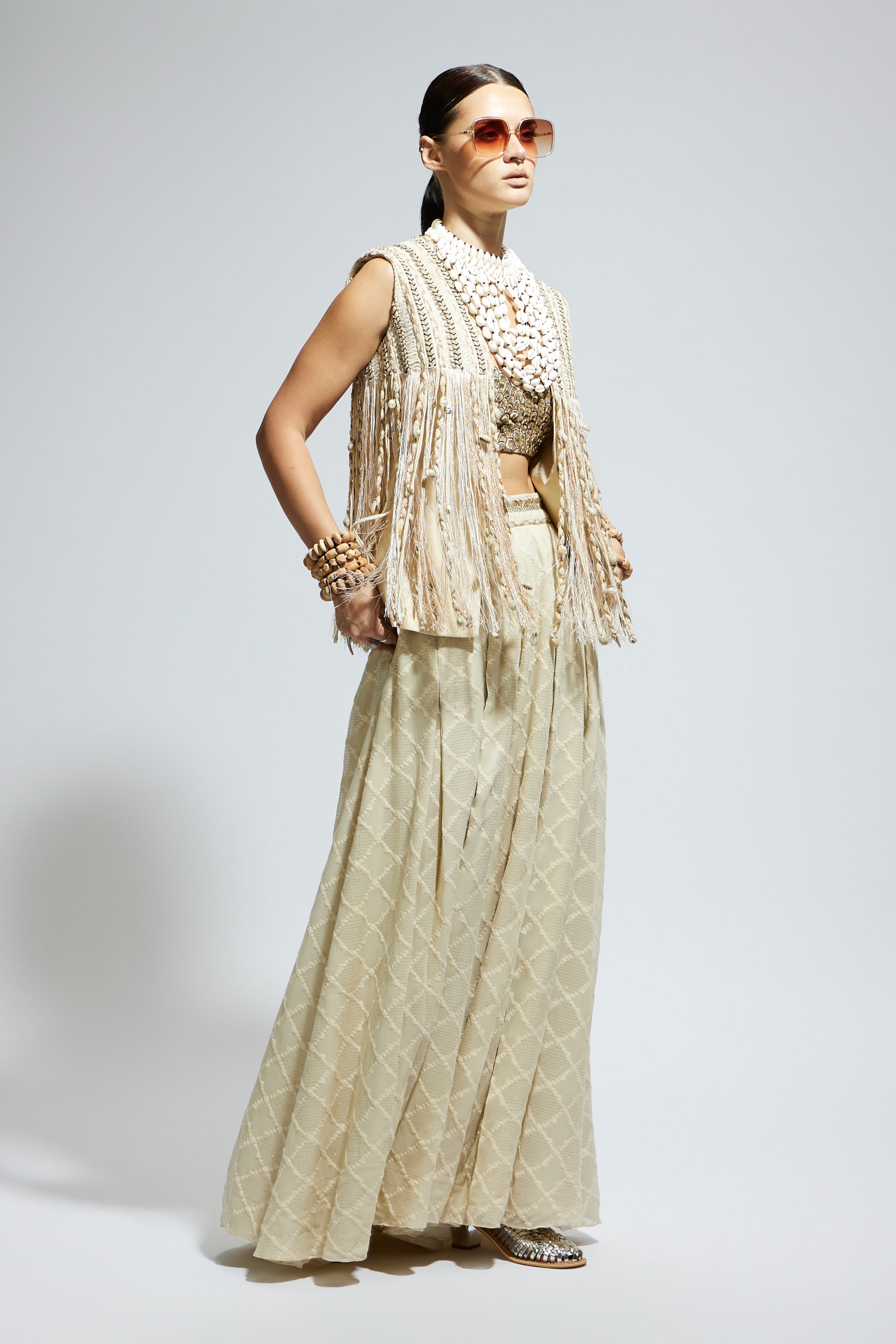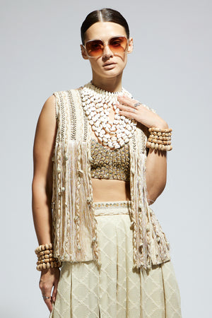 • Ivory threadwork fringe jacket paired wth scallop metallic bustier and ivory aztec flared pants.
