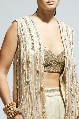 Ivory Threadwork Fringe Jacket Set
