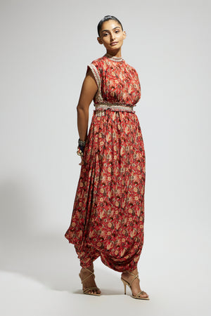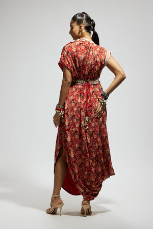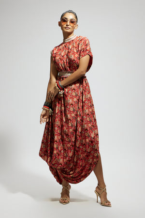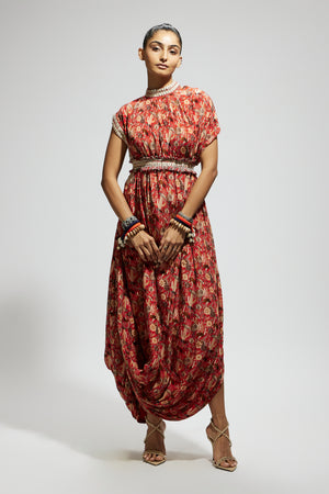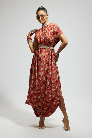 • Orange jaal printed cowl dress teamed with a belt