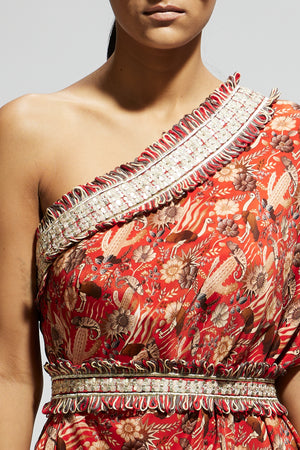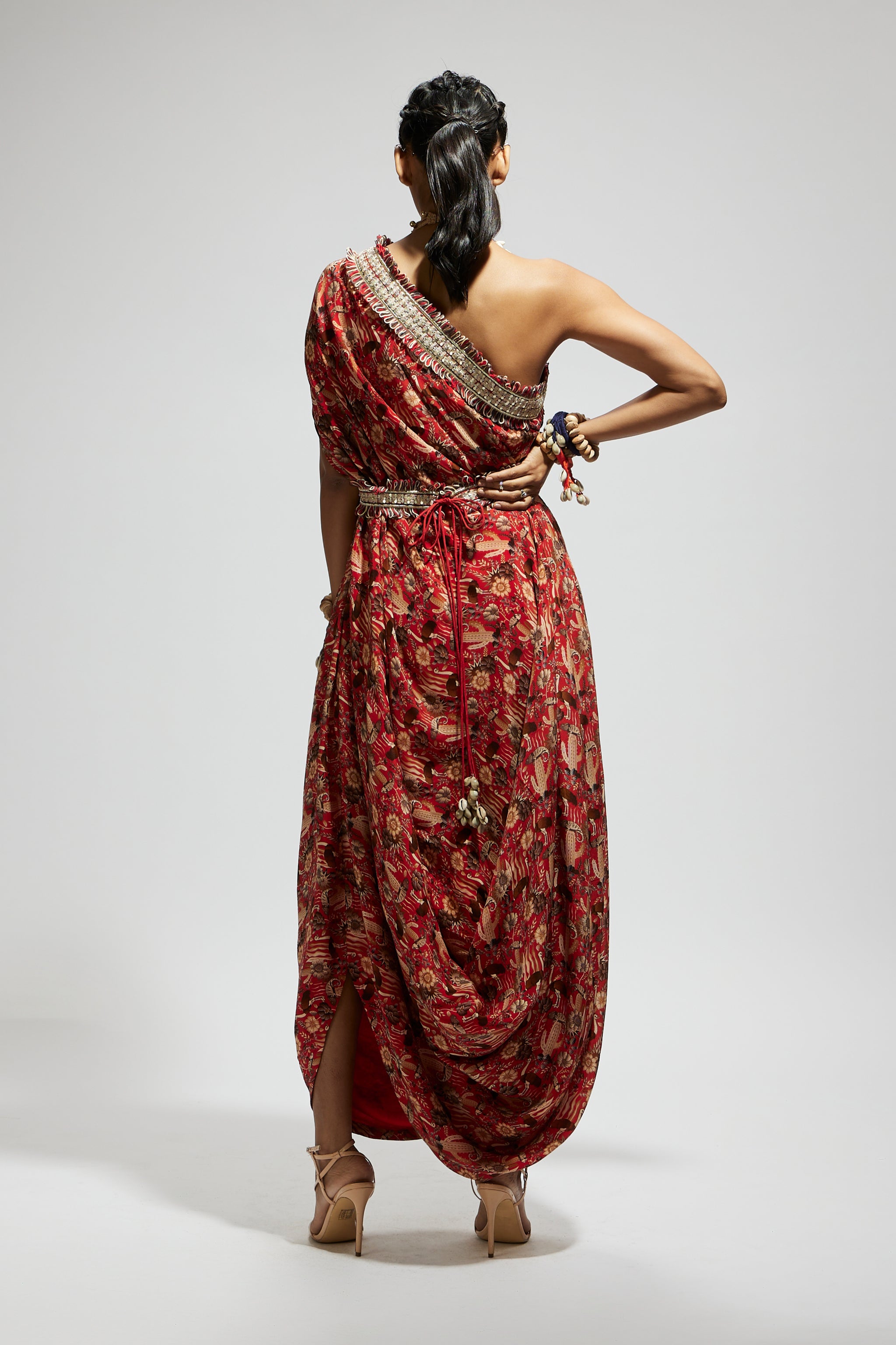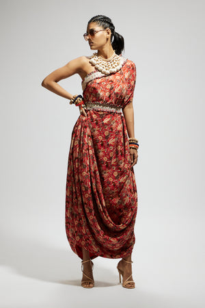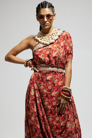 • Orange jaal print one shoulder cowl dress teamed with a belt